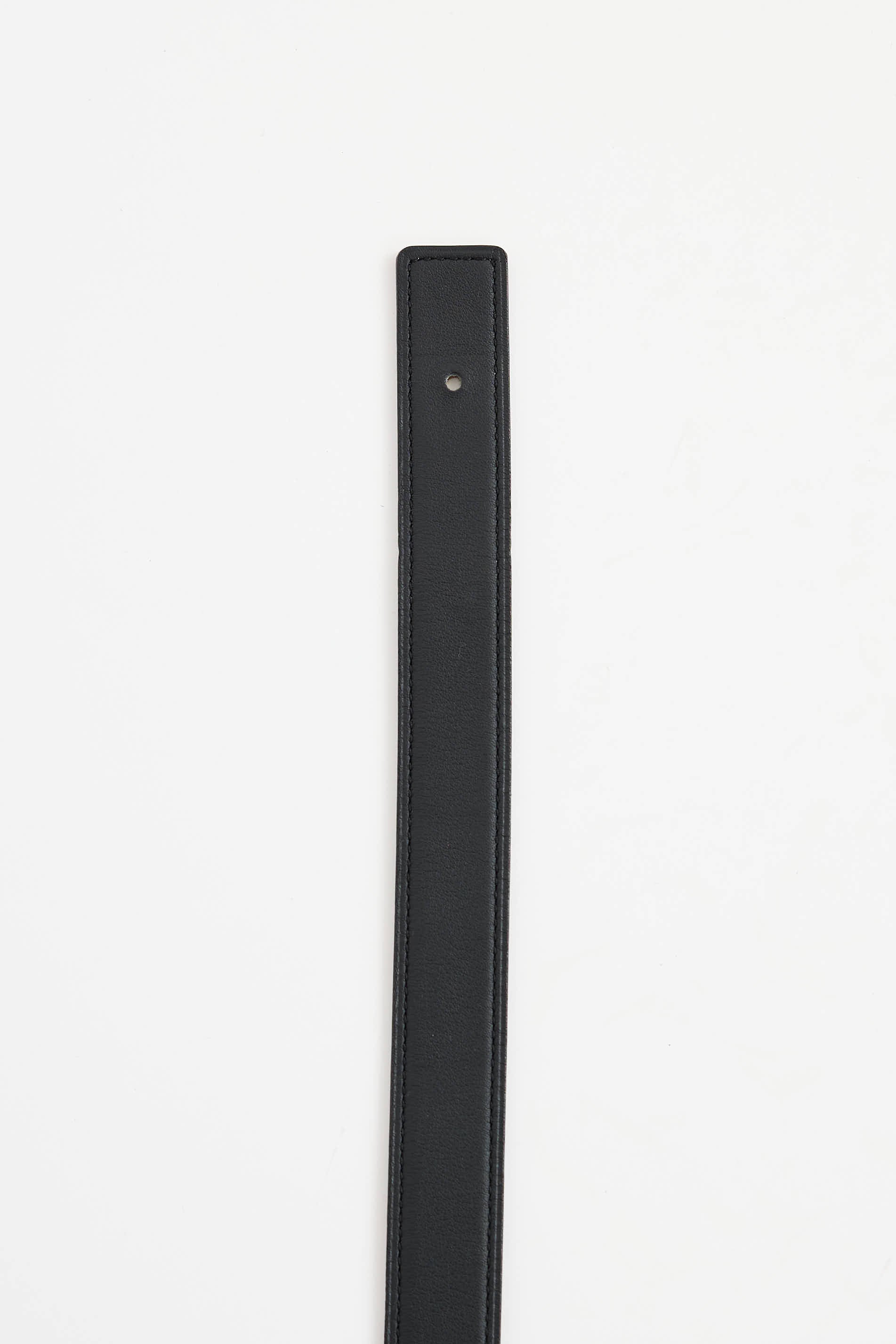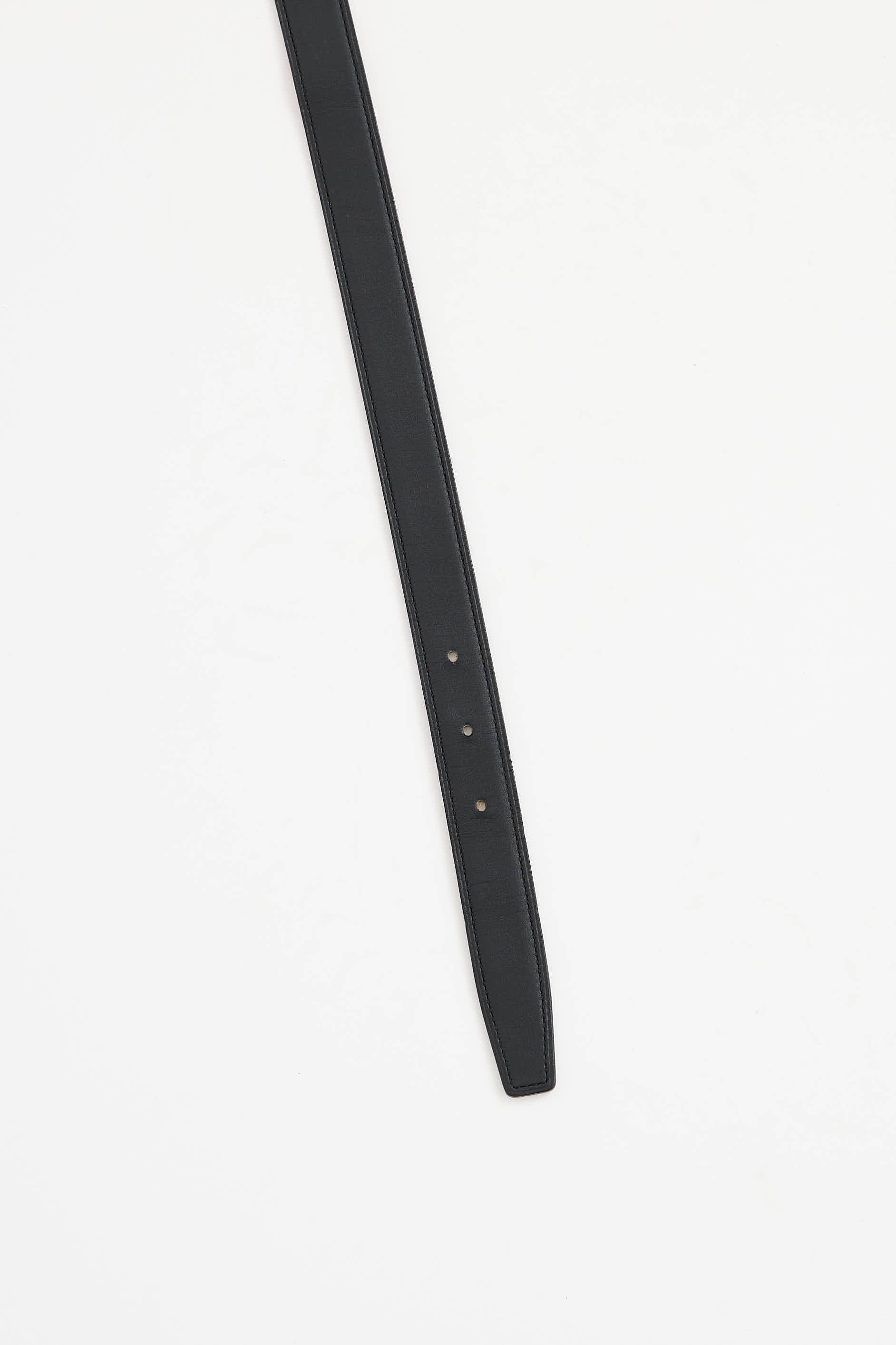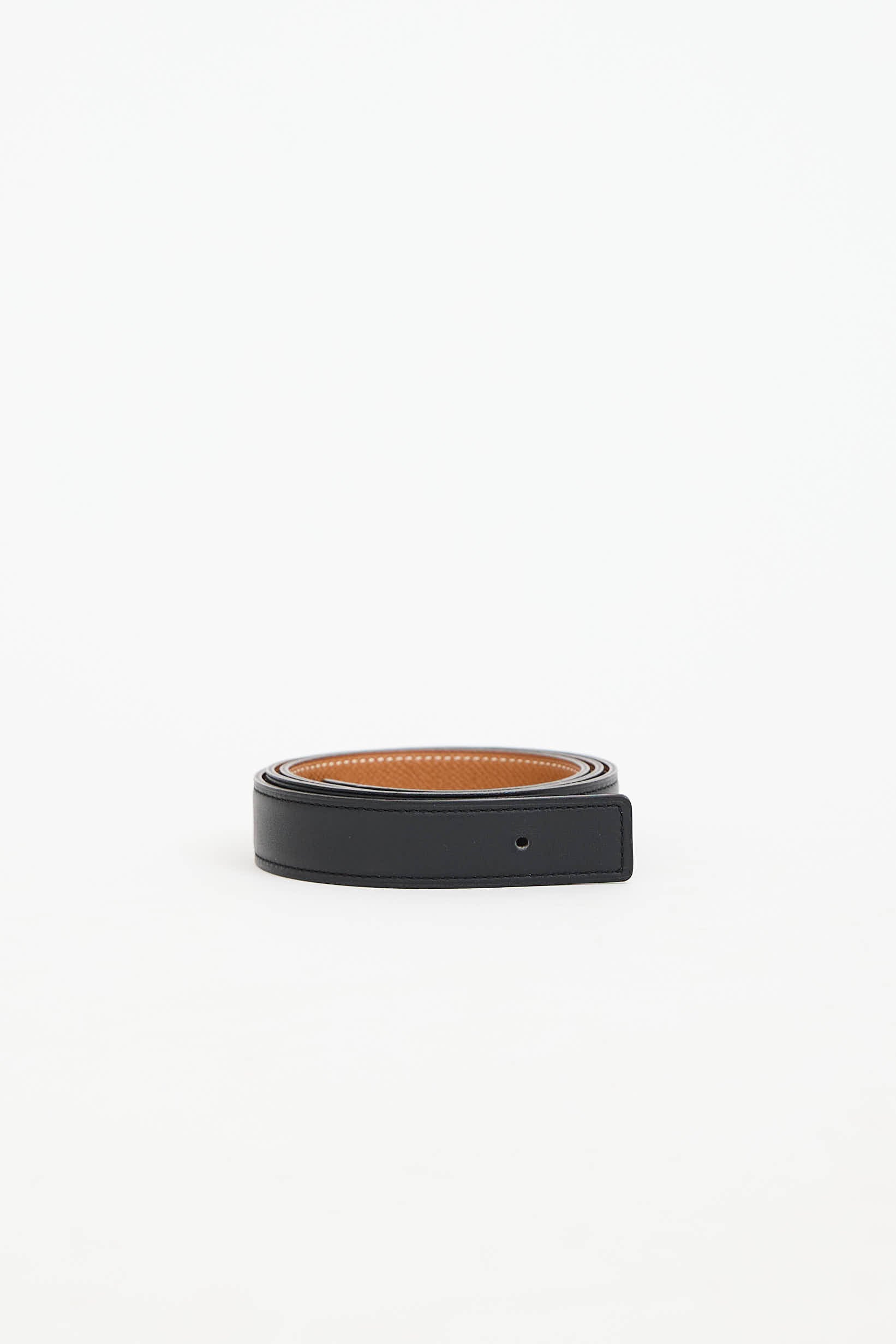 Pre-owned Hermès strap featuring Swift leather in "Noir" on one side with tonal stitching and Epsom leather in "Gold" with white contrast stitching on other side, three holes on left, singular hole on right and embossed logo text.