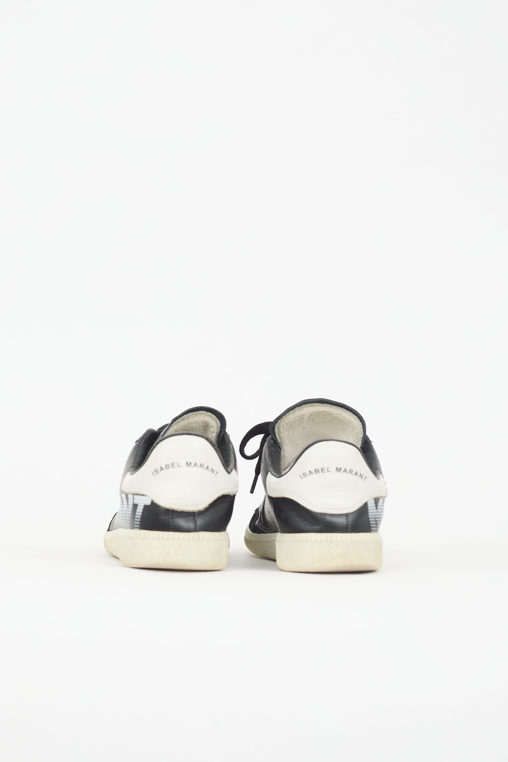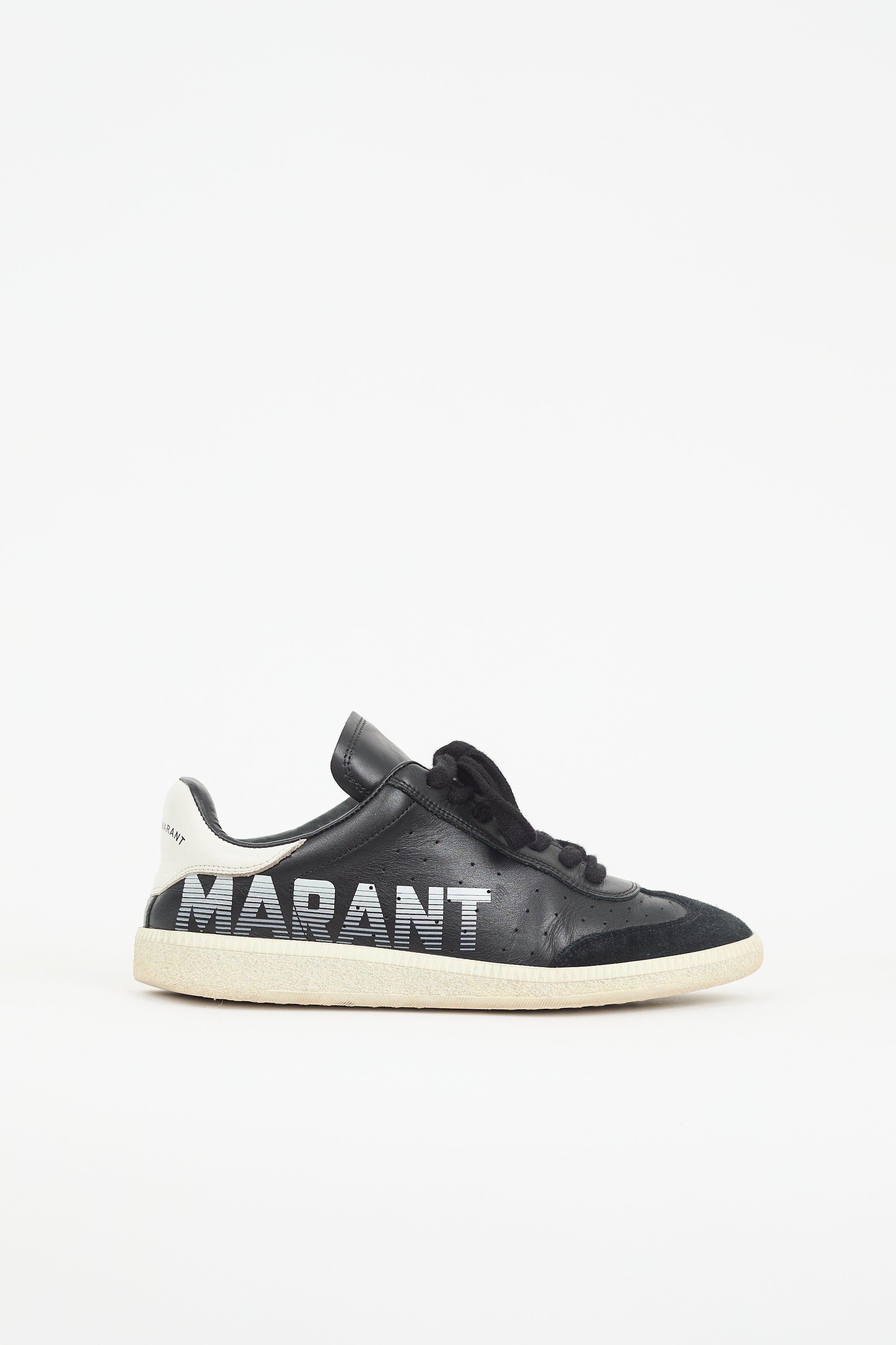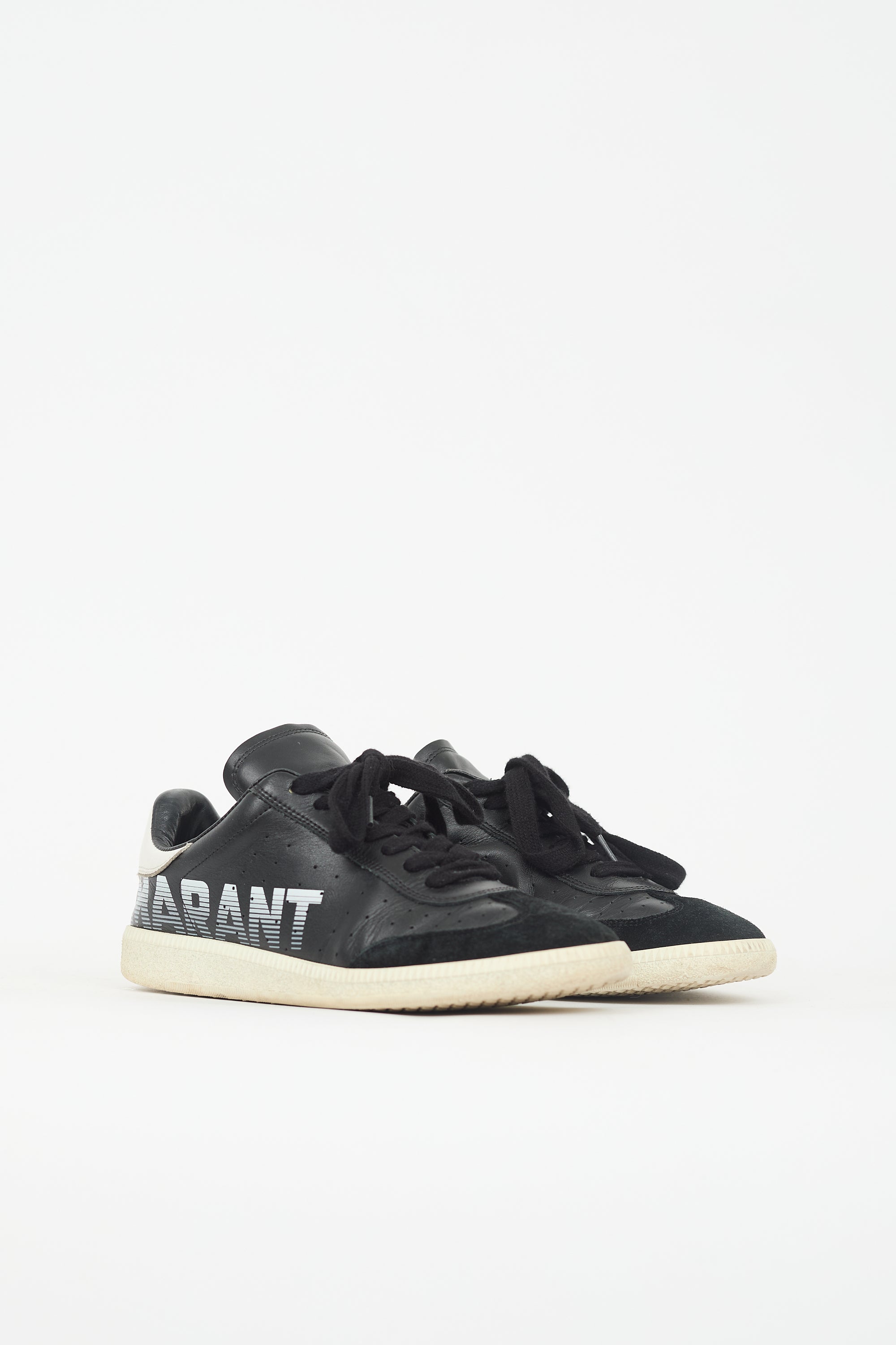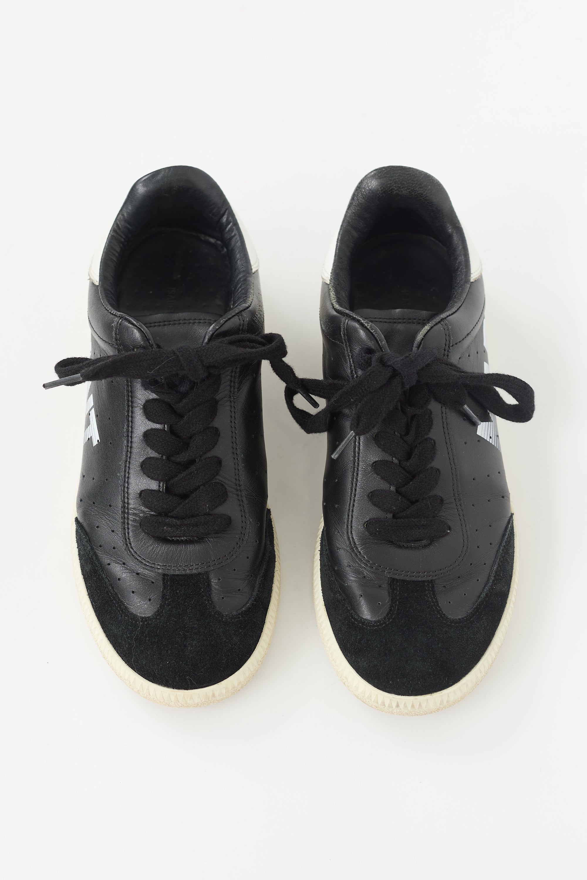 Pre-owned Isabel Marant black leather and suede Bryce sneakers featuring rounded toe, lace up vamp, printed logo at outer side, printed logo counter panel, and white rubber sole.