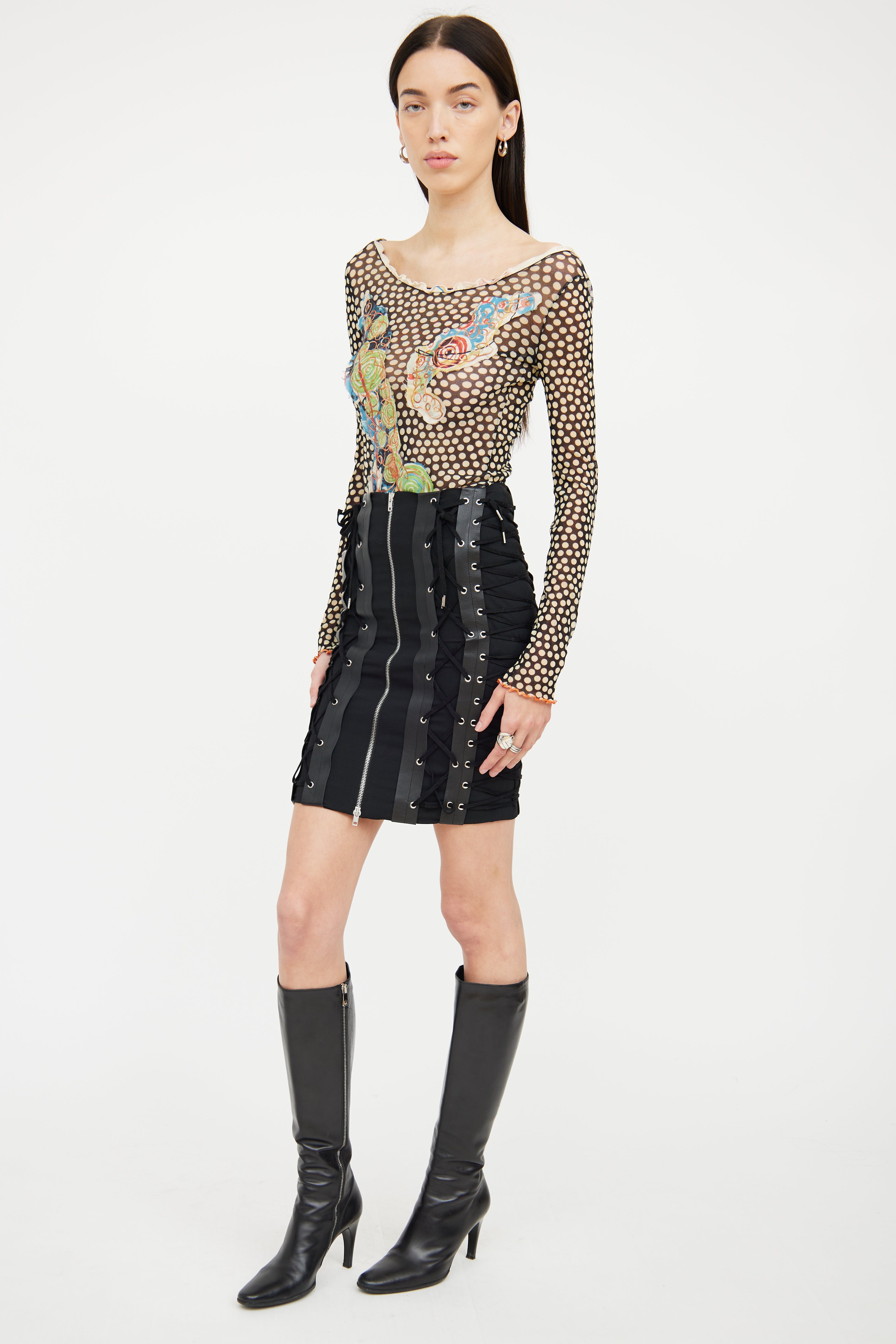 Pre-owned Jean Paul Gaultier black corset skirt featuring zip front closure, zip detailing at bottom back, lace up detailing at sides, back vent zip, faux leather panel detailing, silver-tone hardware and fitted styling. Lined.