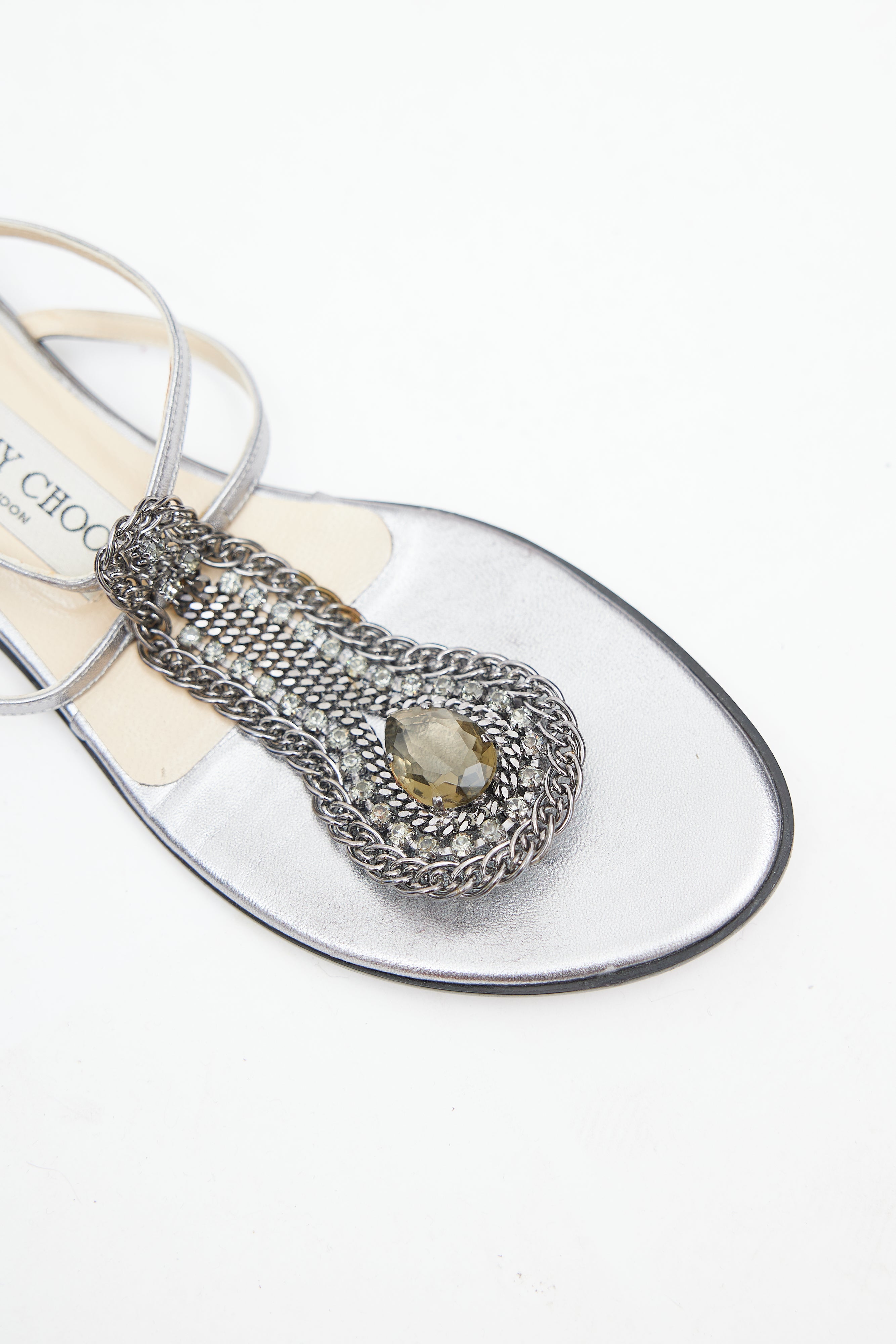 Pre-owned Jimmy Choo silver Palladium sandals featuring rounded toe, silver tone chain and gem embellished T-strap, ankle strap with buckle fastening, and short stacked heel. Comes with original box.