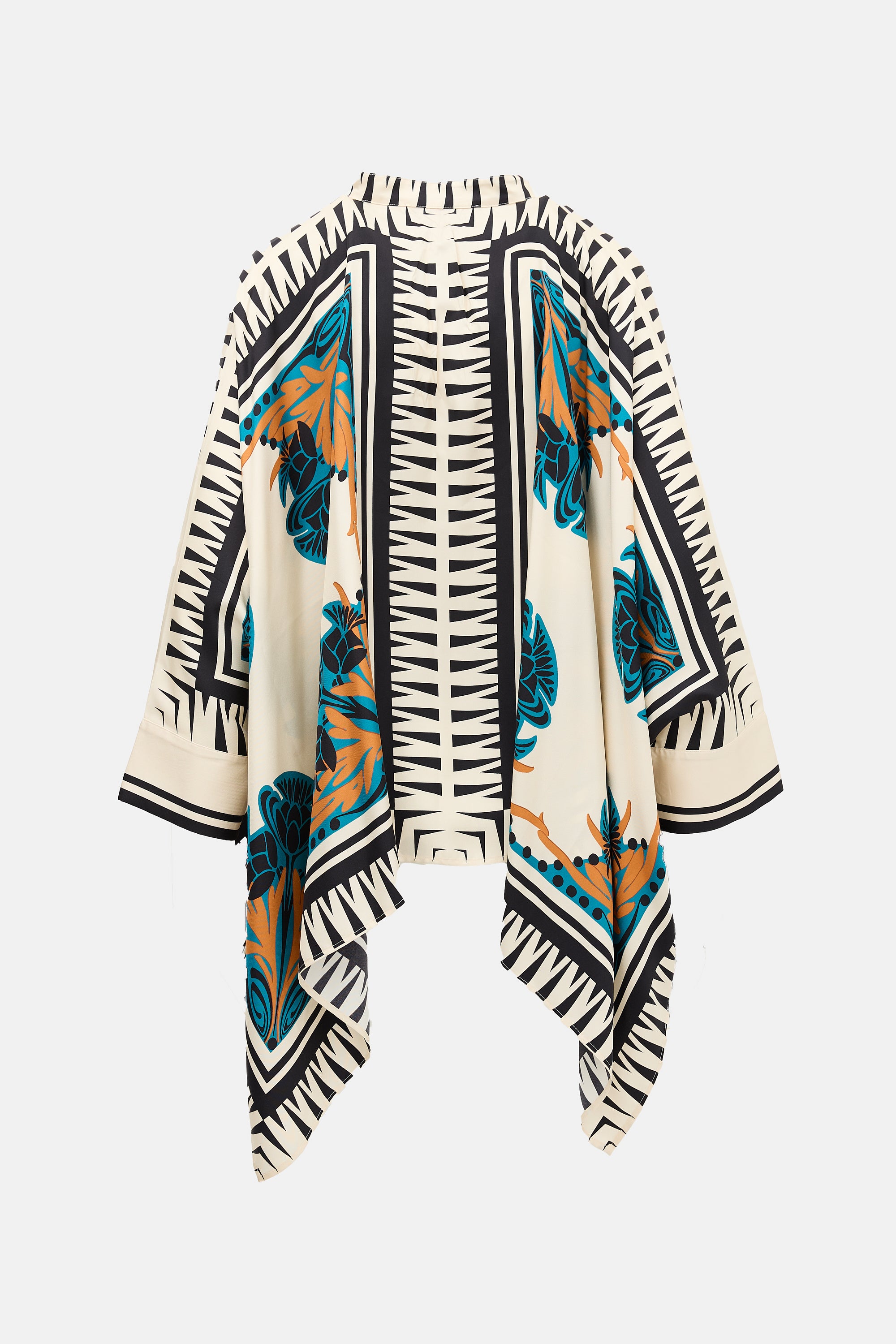 Pre-owned La DoubleJ cream and multicolour silk Foulard shirt featuring a stand collar, button front, floral and geometric print throughout, dolman sleeves with buttoned cuffs, and a handkerchief hem.