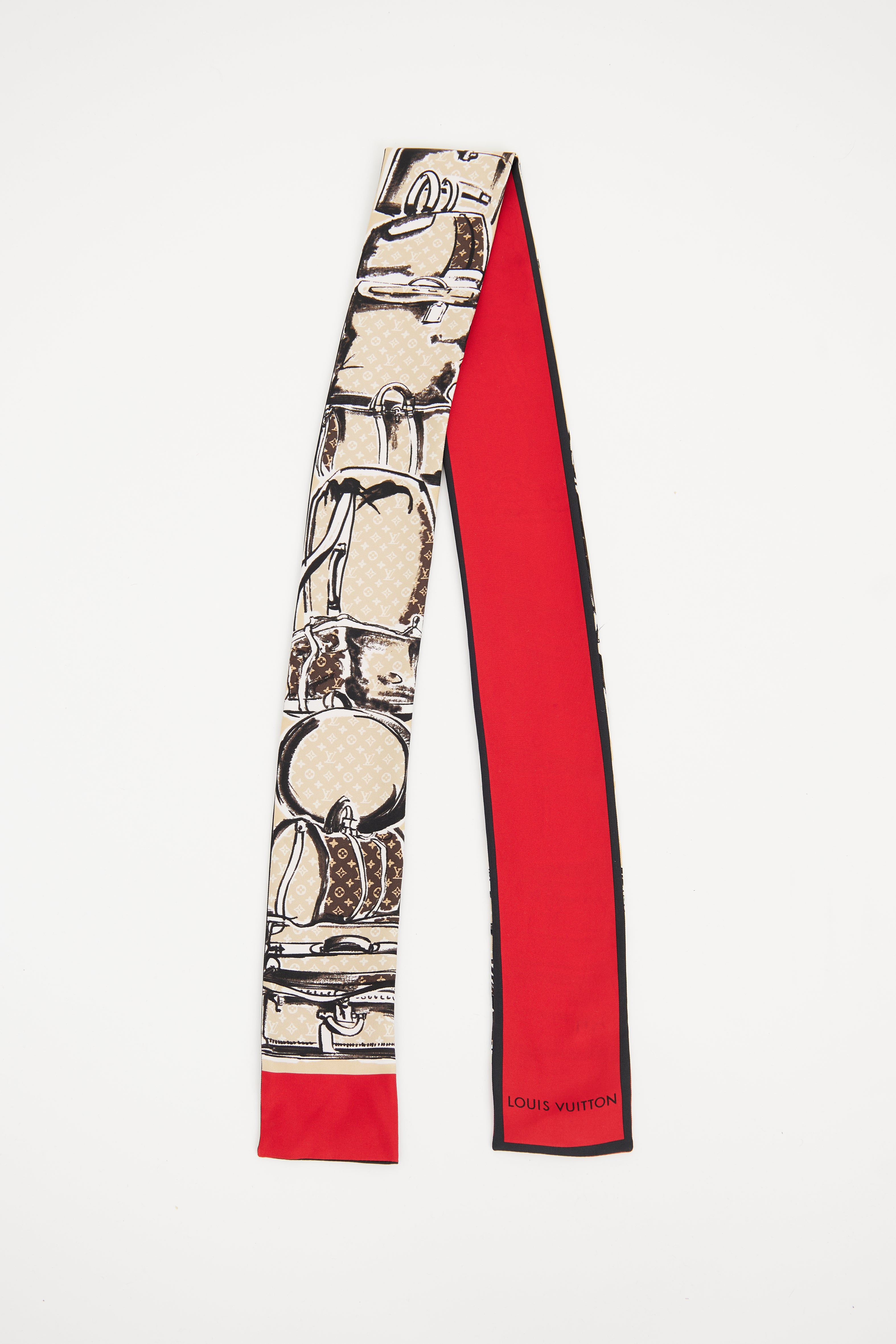 Pre-owned Louis Vuitton red trunks silk bandeau scarf featuring monogram trunks and handbags graphic and logo text on back.