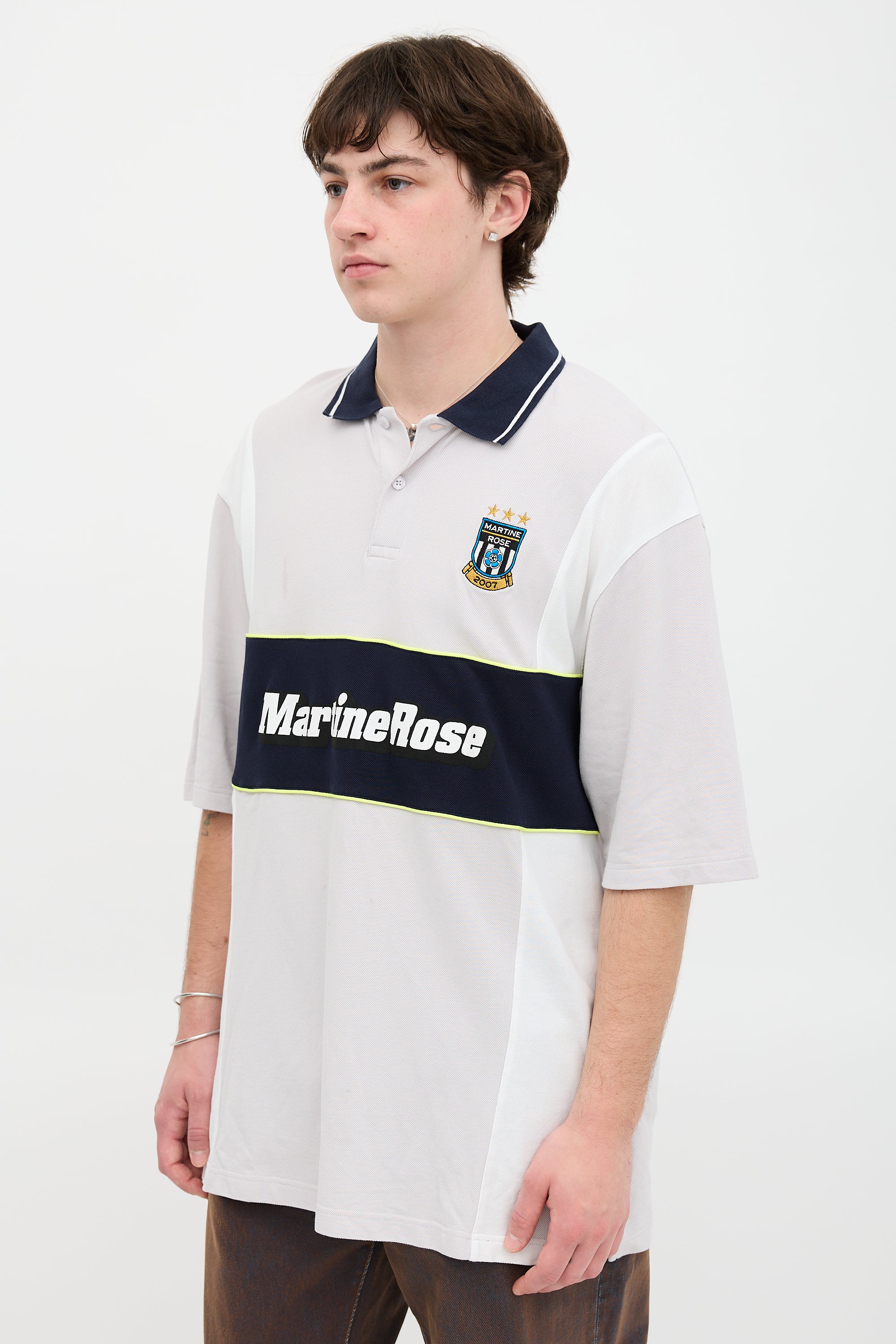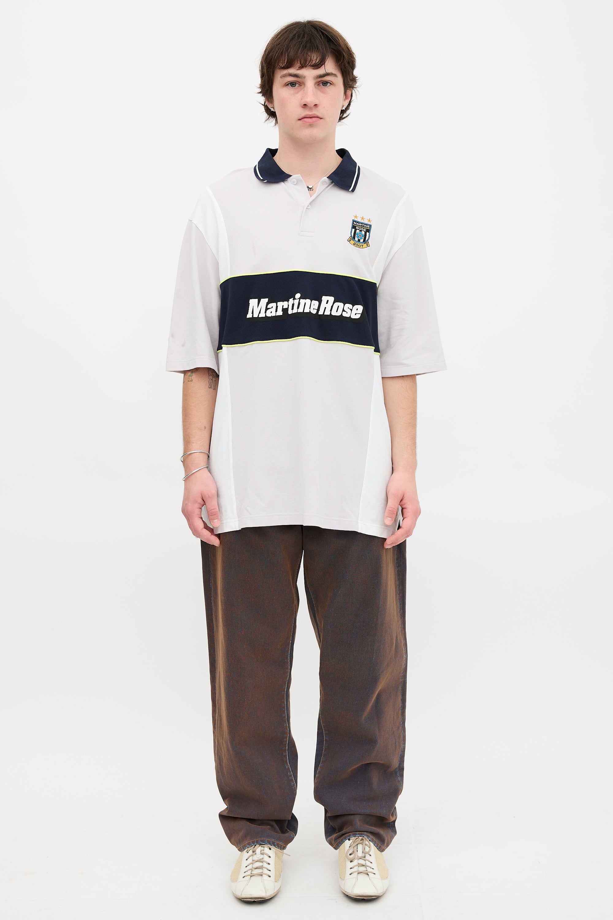 Pre-owned Martine Rose purple Oversized Panelled Polo featuring a navy striped point collar, embroidered logo at chest, and printed logo at chest.