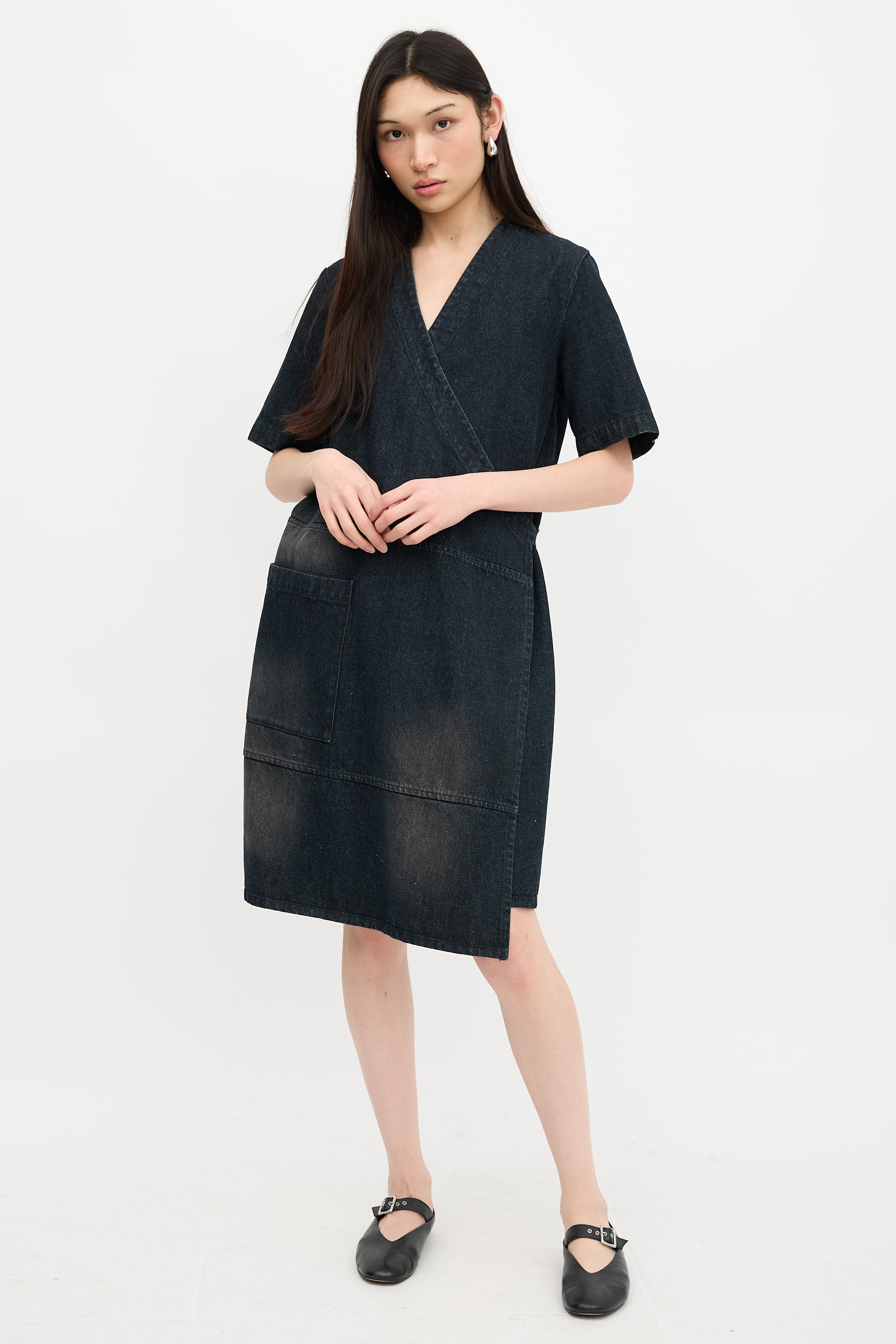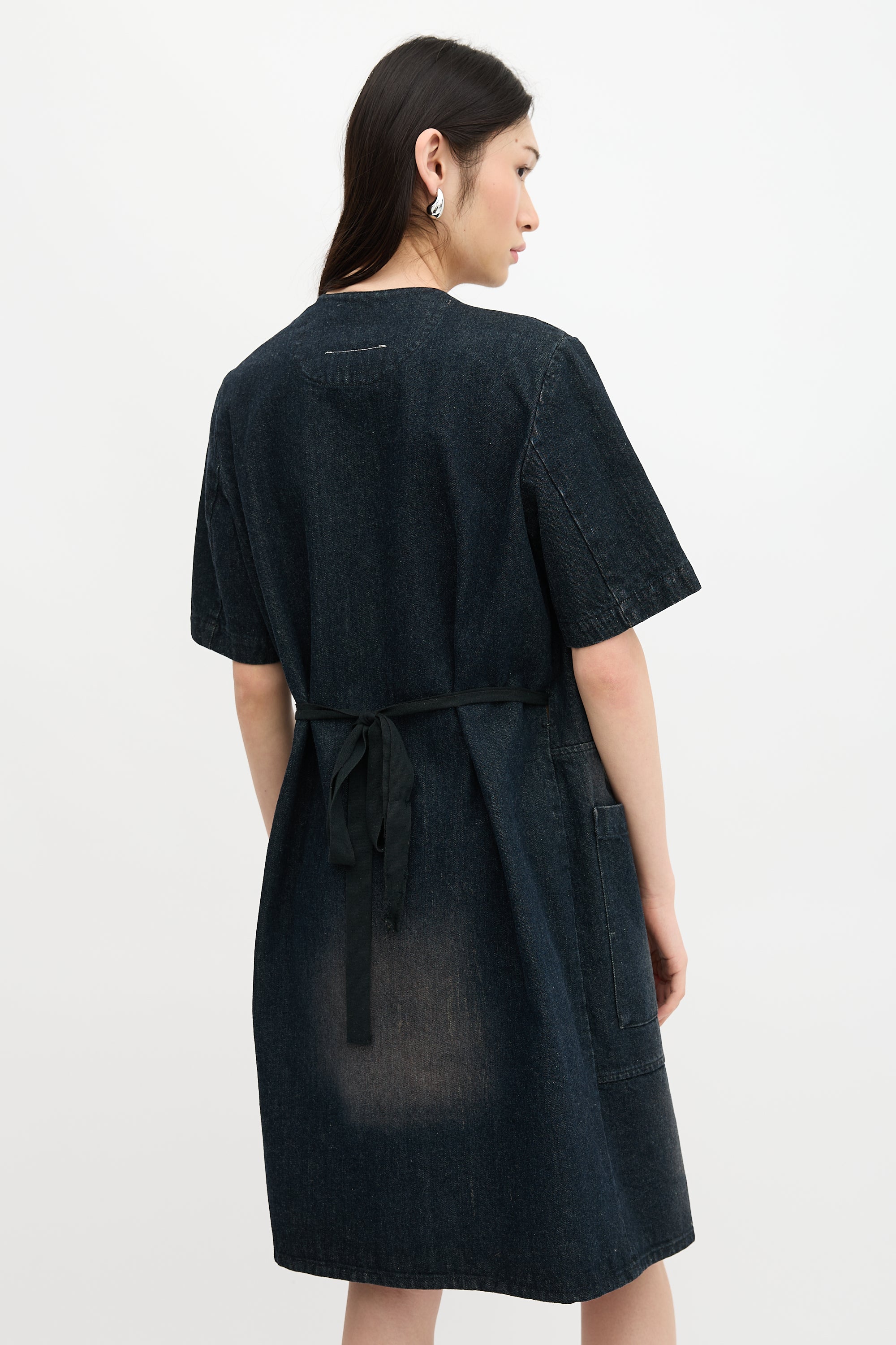 Pre-owned MM6 Maison Margiela dark wash denim midi dress featuring surplice neckline, wrap front, tie closures, signature white stitched line at upper back, patch pocket at right side, and fading at surface. Clipped to fit model.