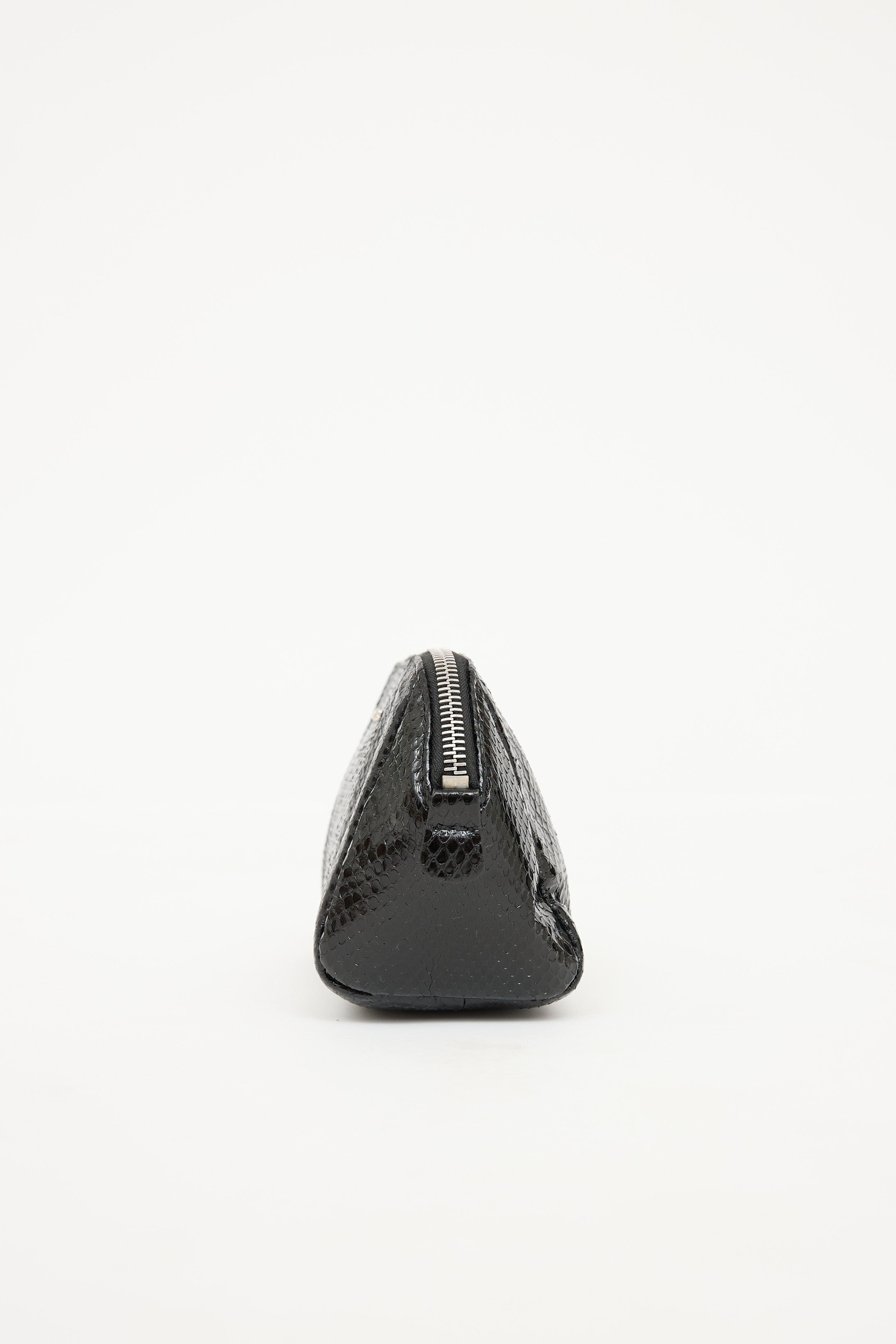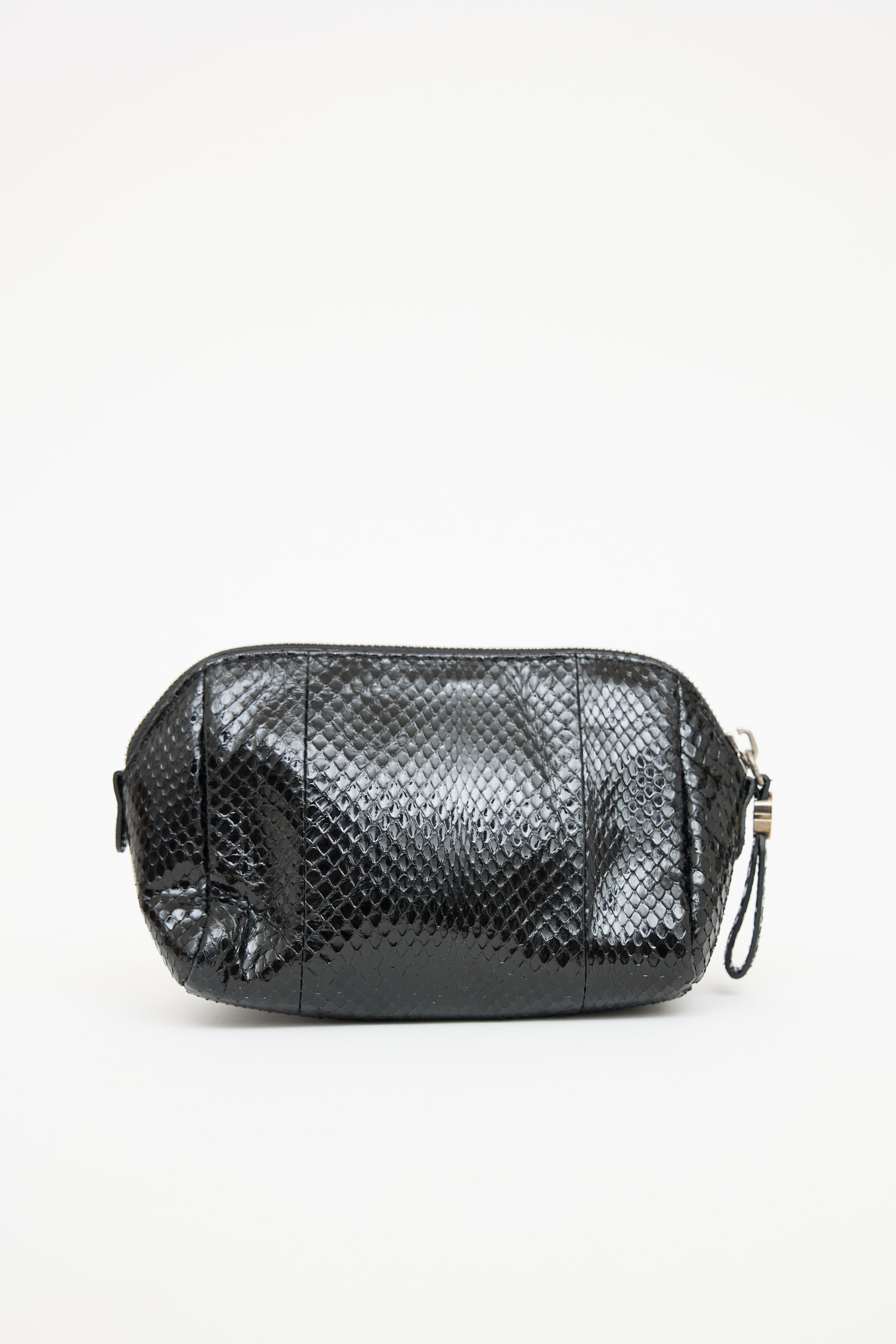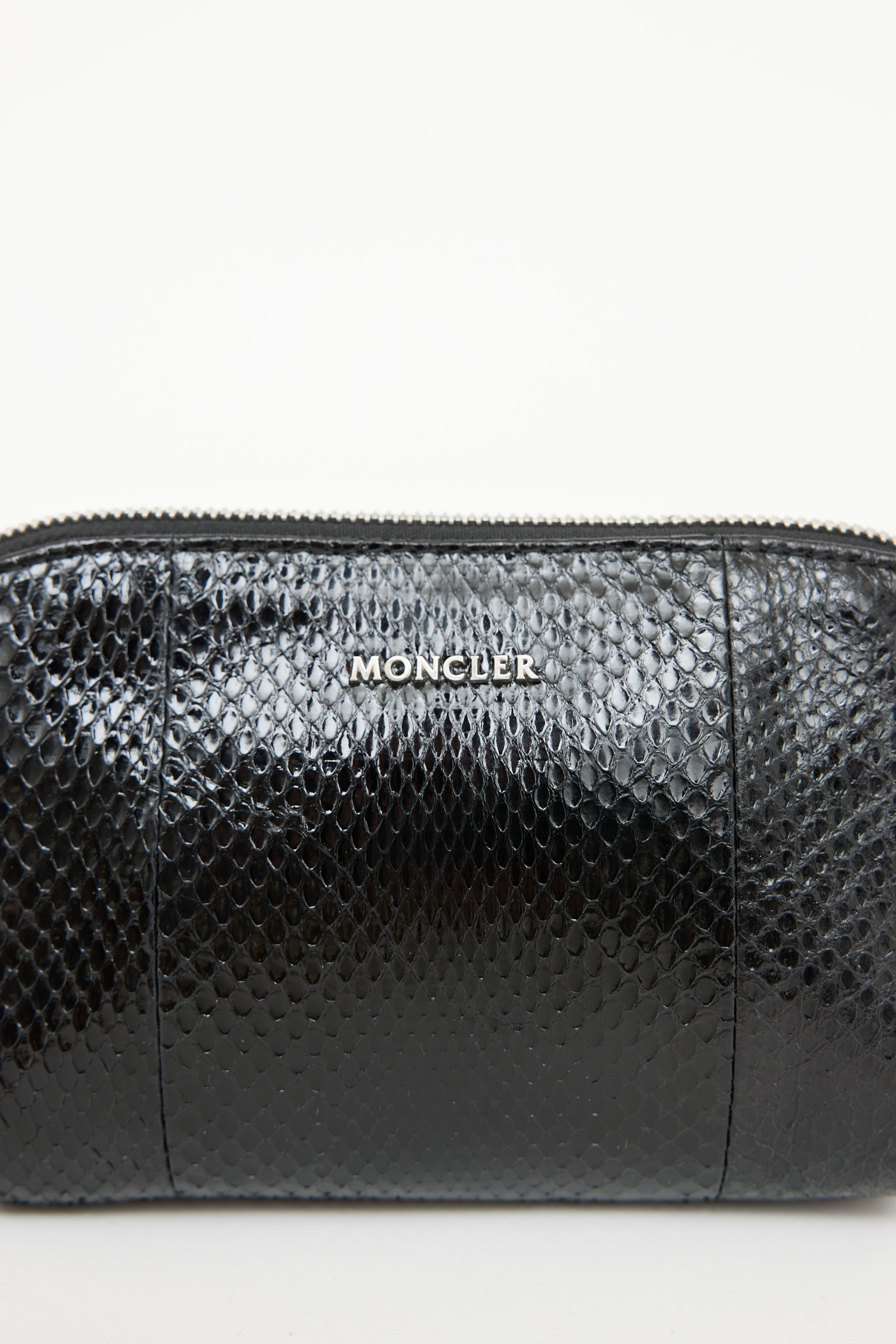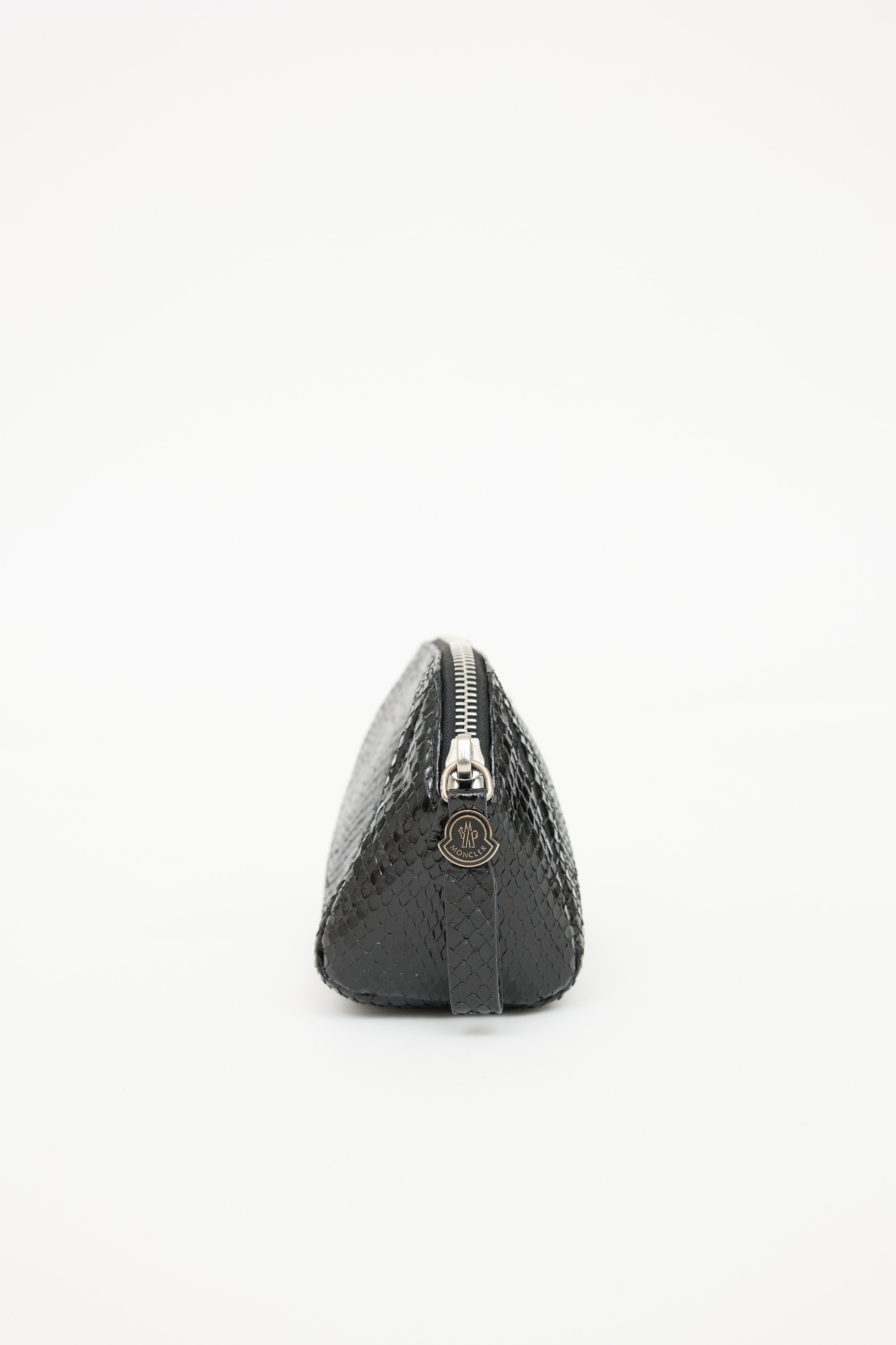 Pre-owned Moncler black cosmetic bag featuring snakeskin leather exterior, silver tone hardware logo at front, top zip closure with leather pull tab and one main compartment with zip closure.