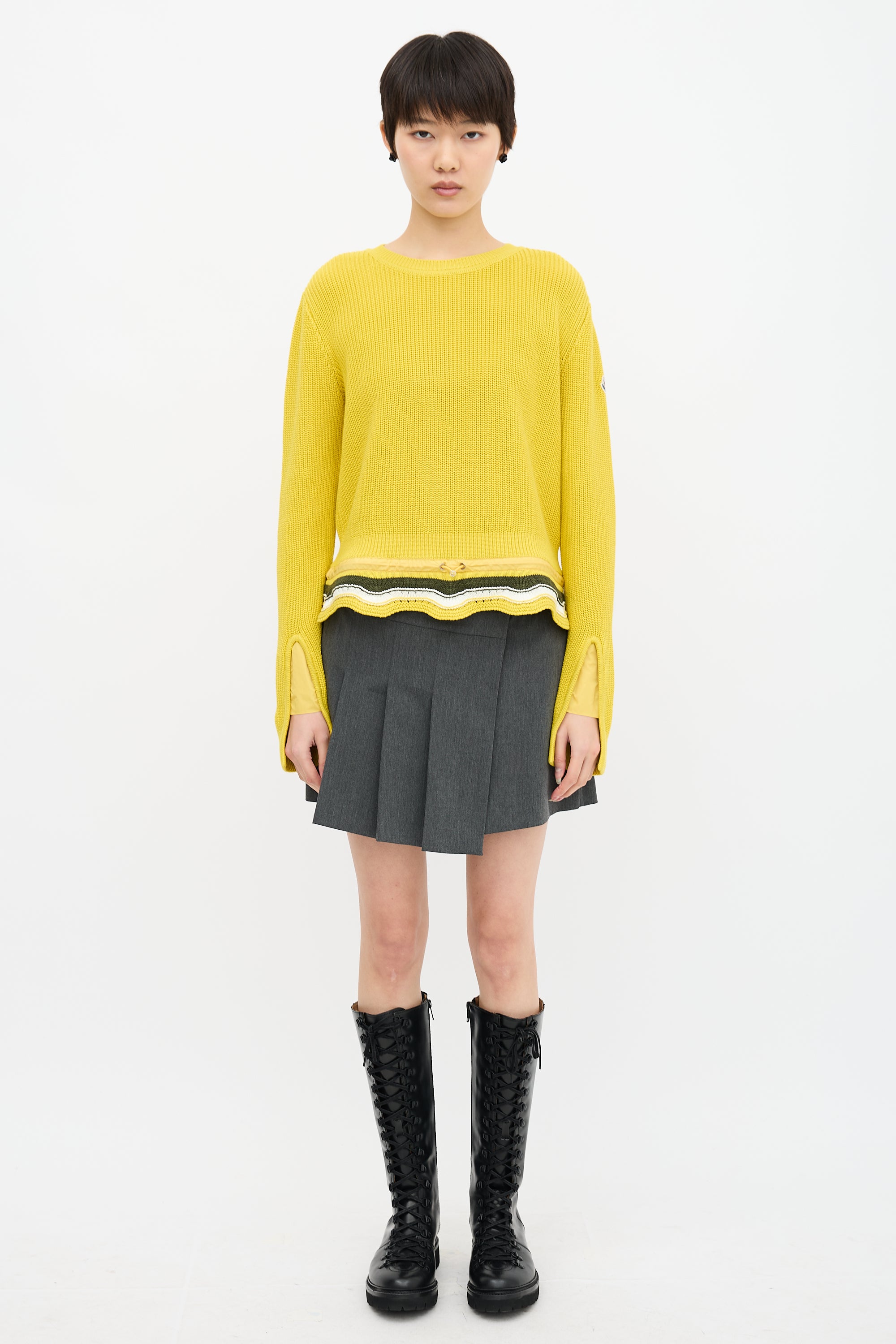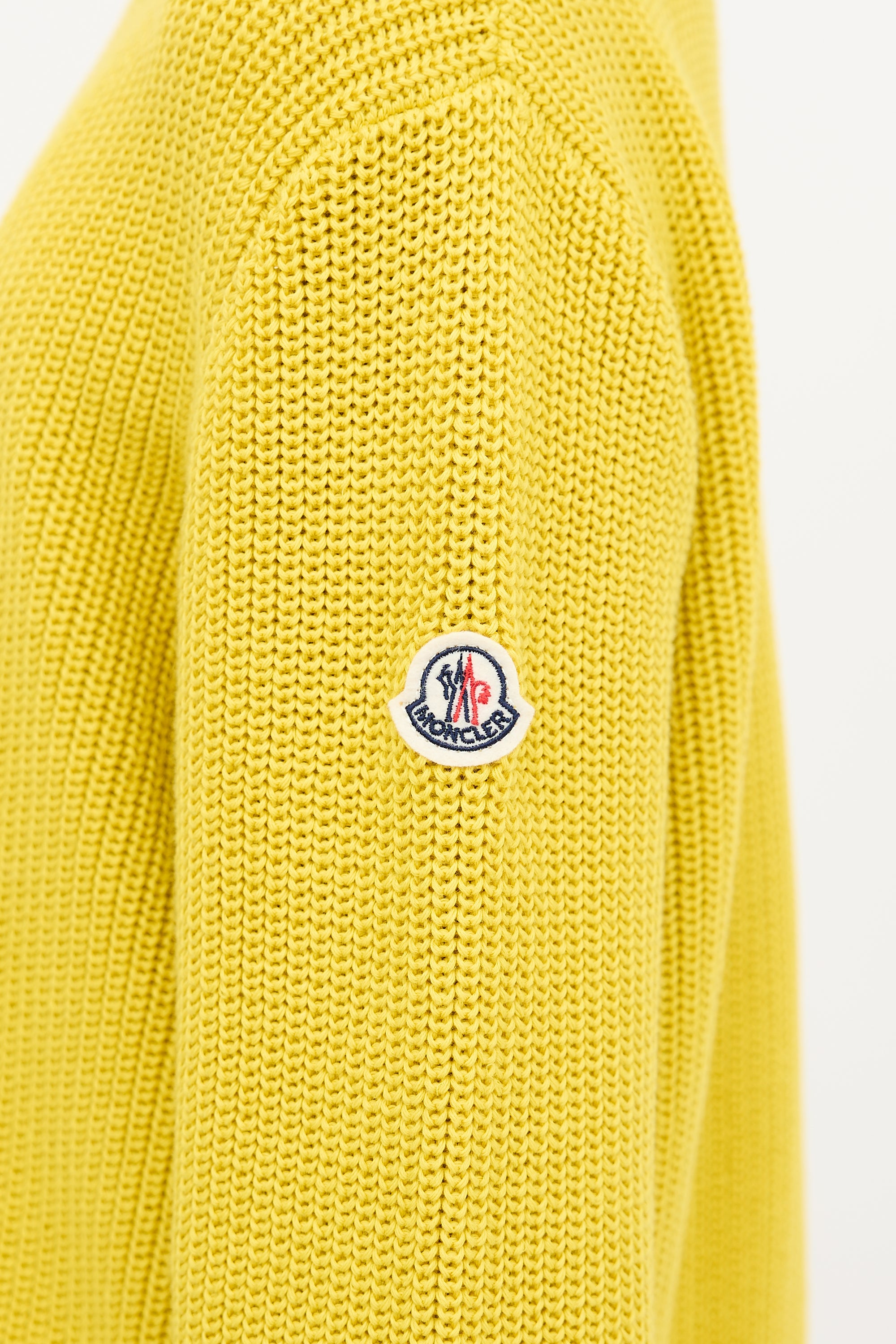 Pre-owned Moncler yellow knit sweater featuring a ribbed crew neckline, felted logo patch at left sleeve, drawcord at striped scallop hem, and a ribbed cuff with nylon gusset vents.