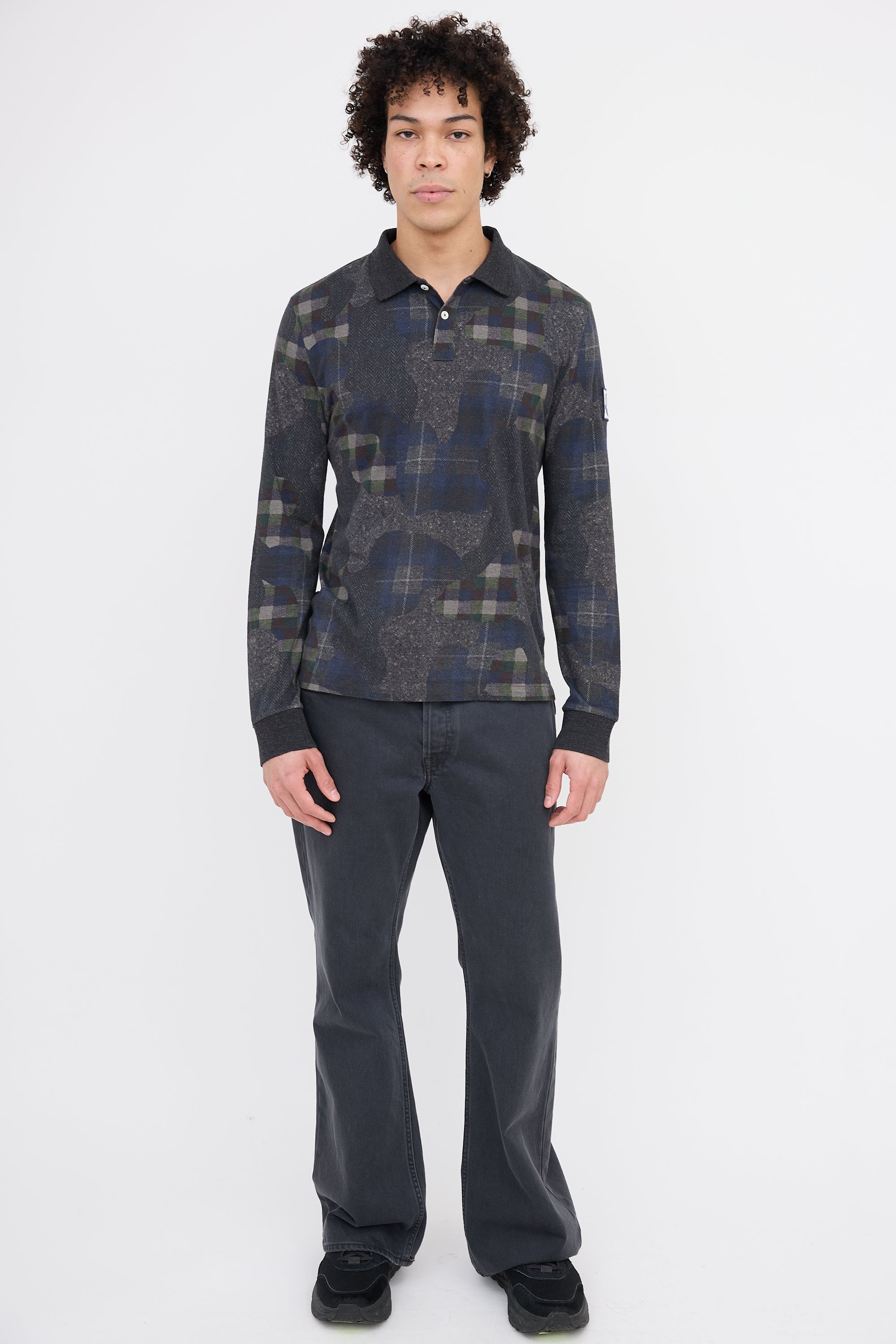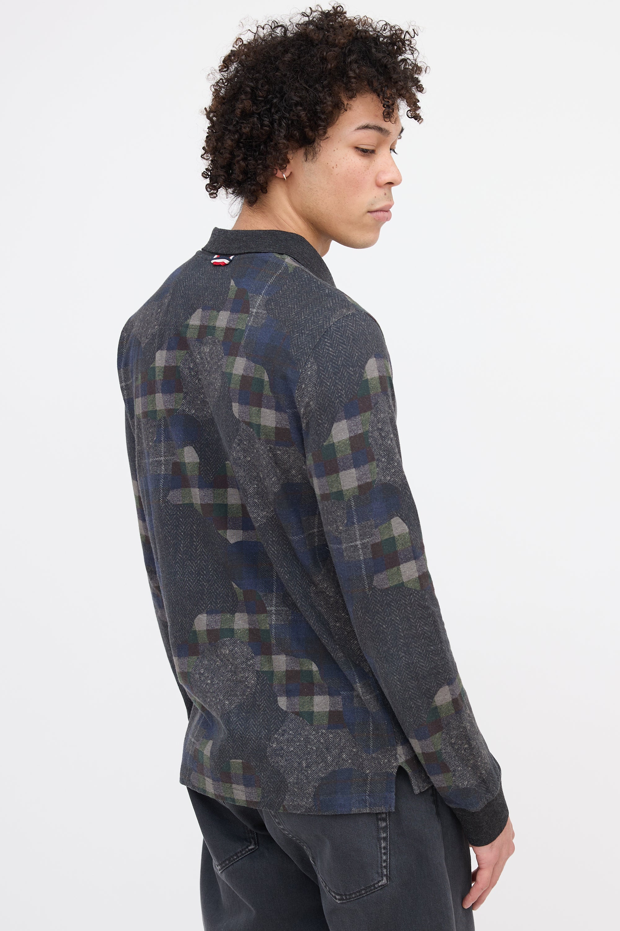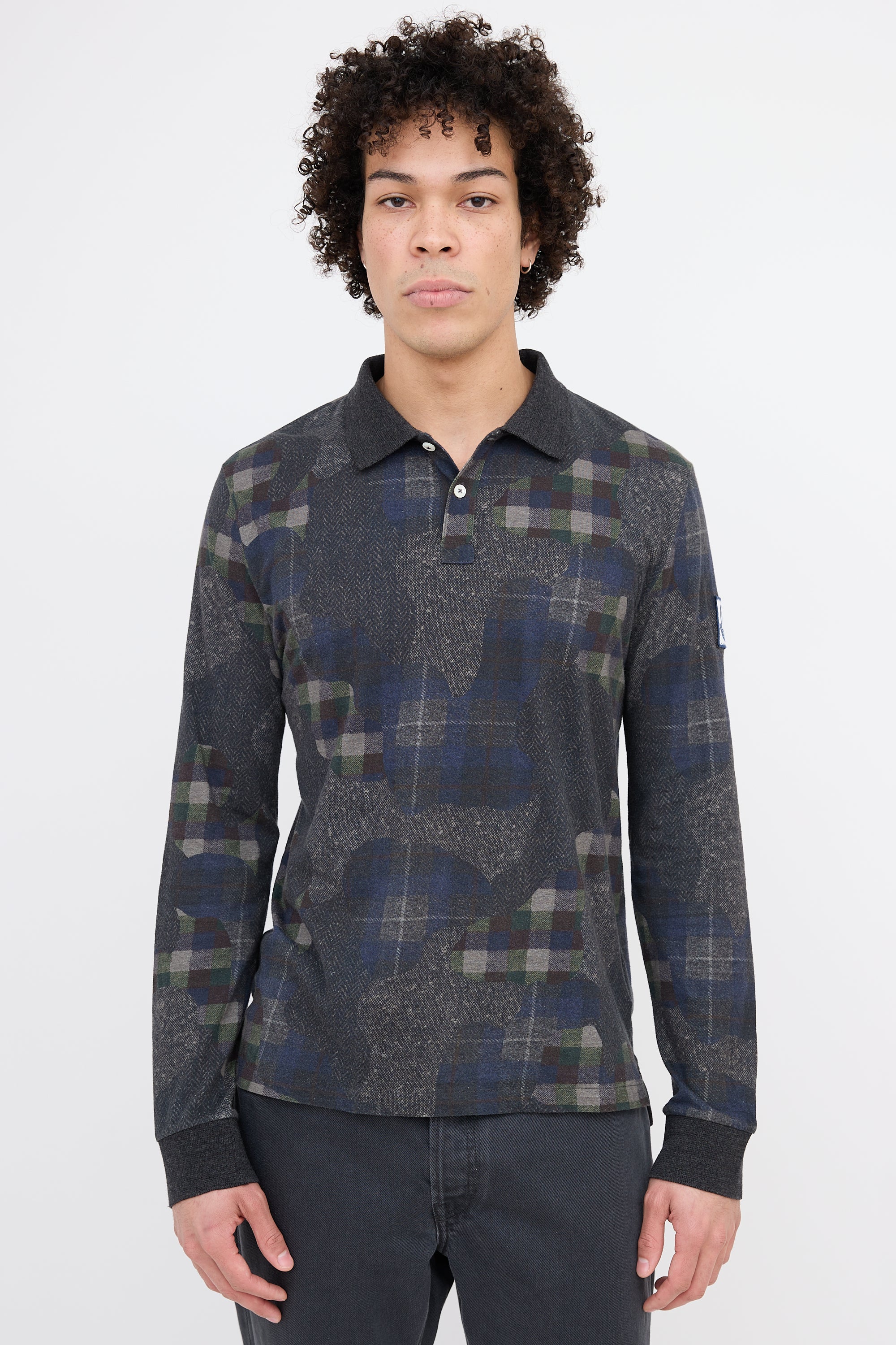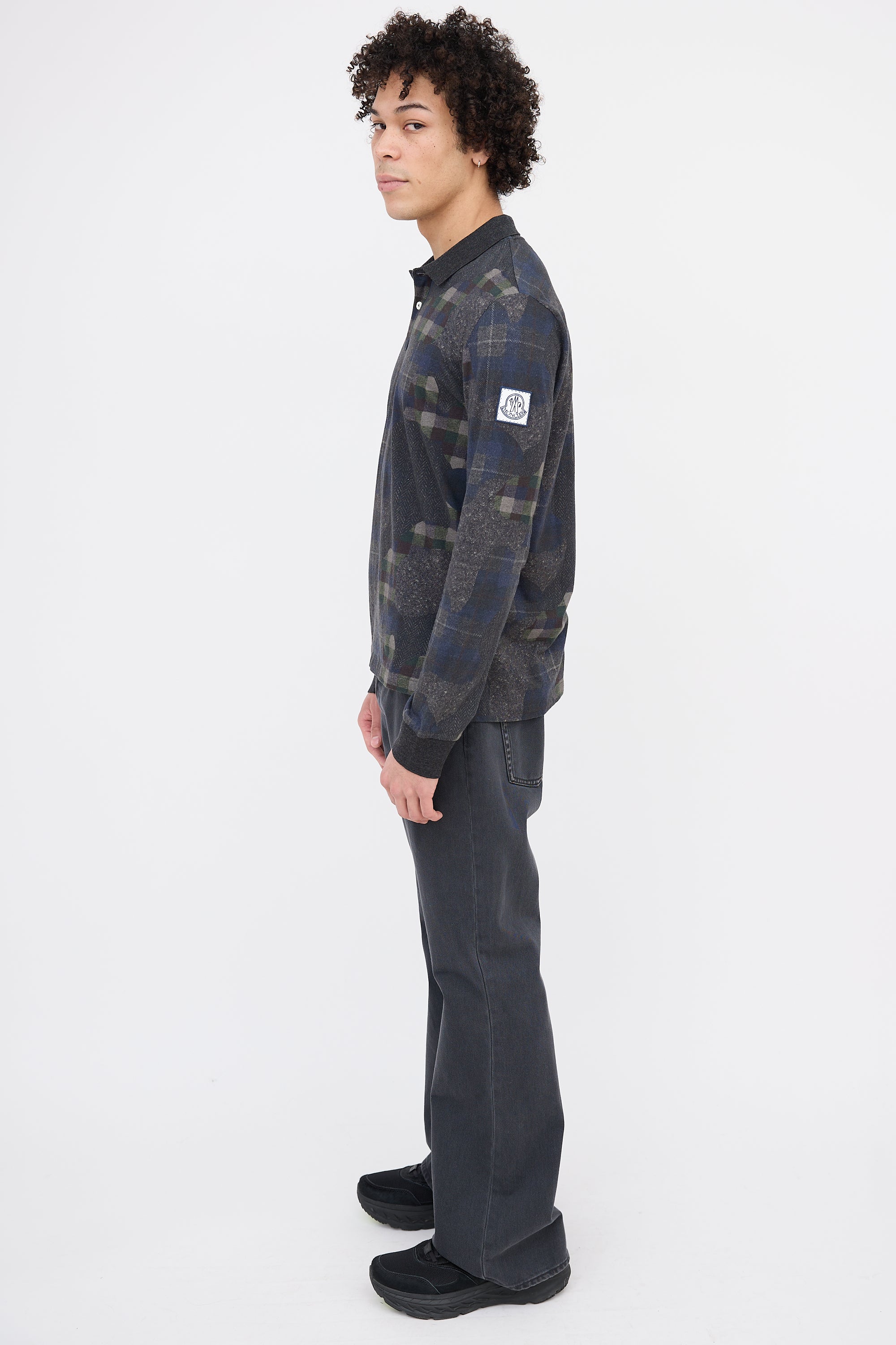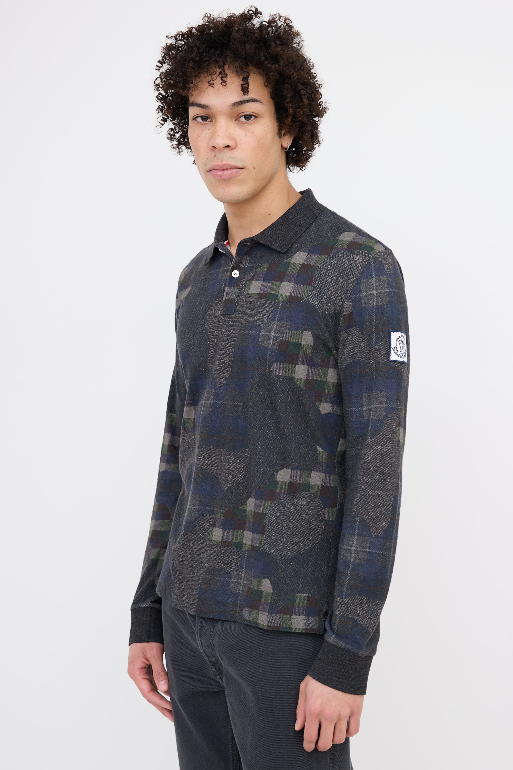 Pre-owned Moncler dark grey and multicolor long sleeve top featuring a polo collar, plaid camo print, ribbed cuffs, logo patch at left sleeve, hang loop at back collar, and a split hem.