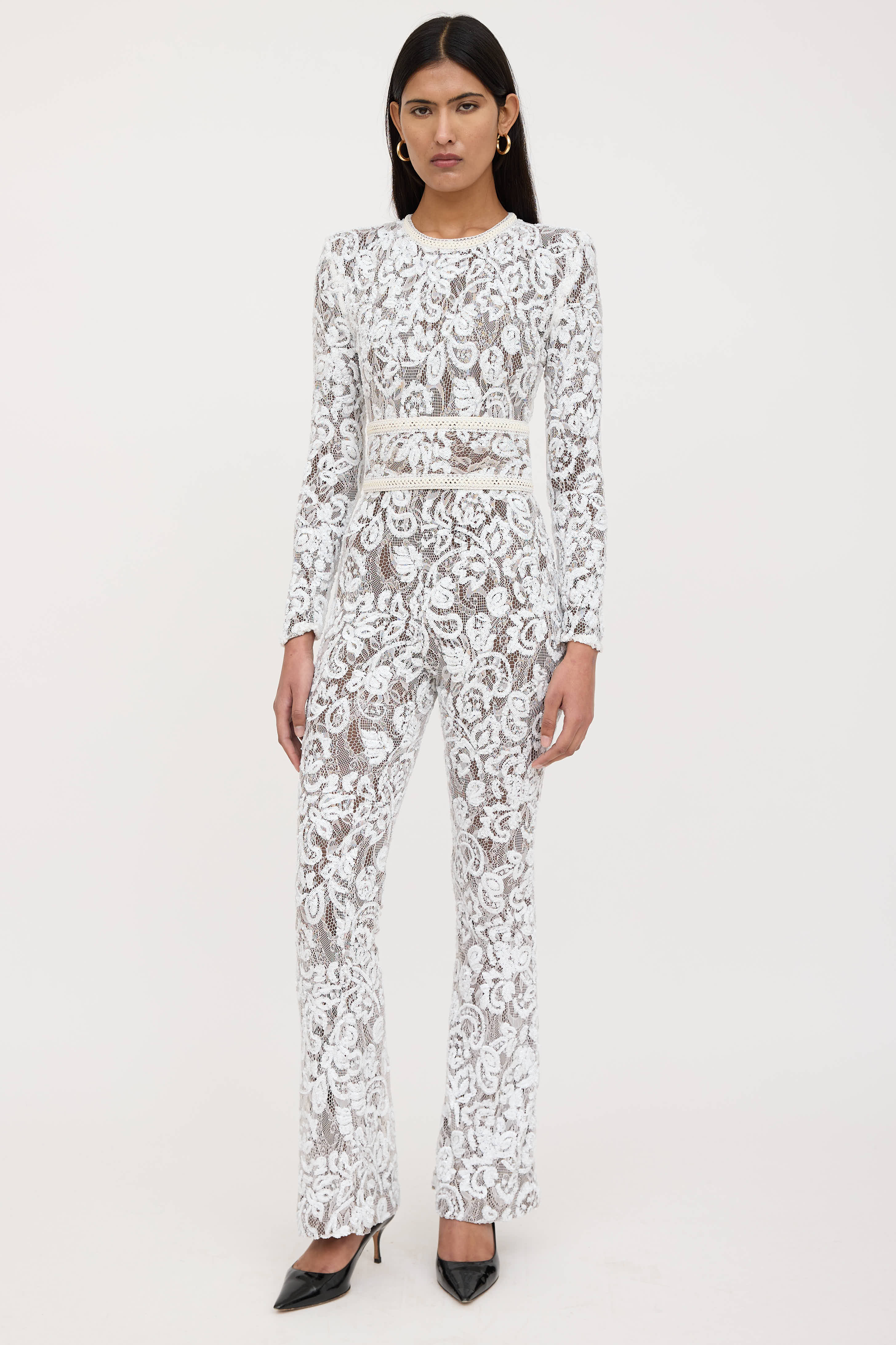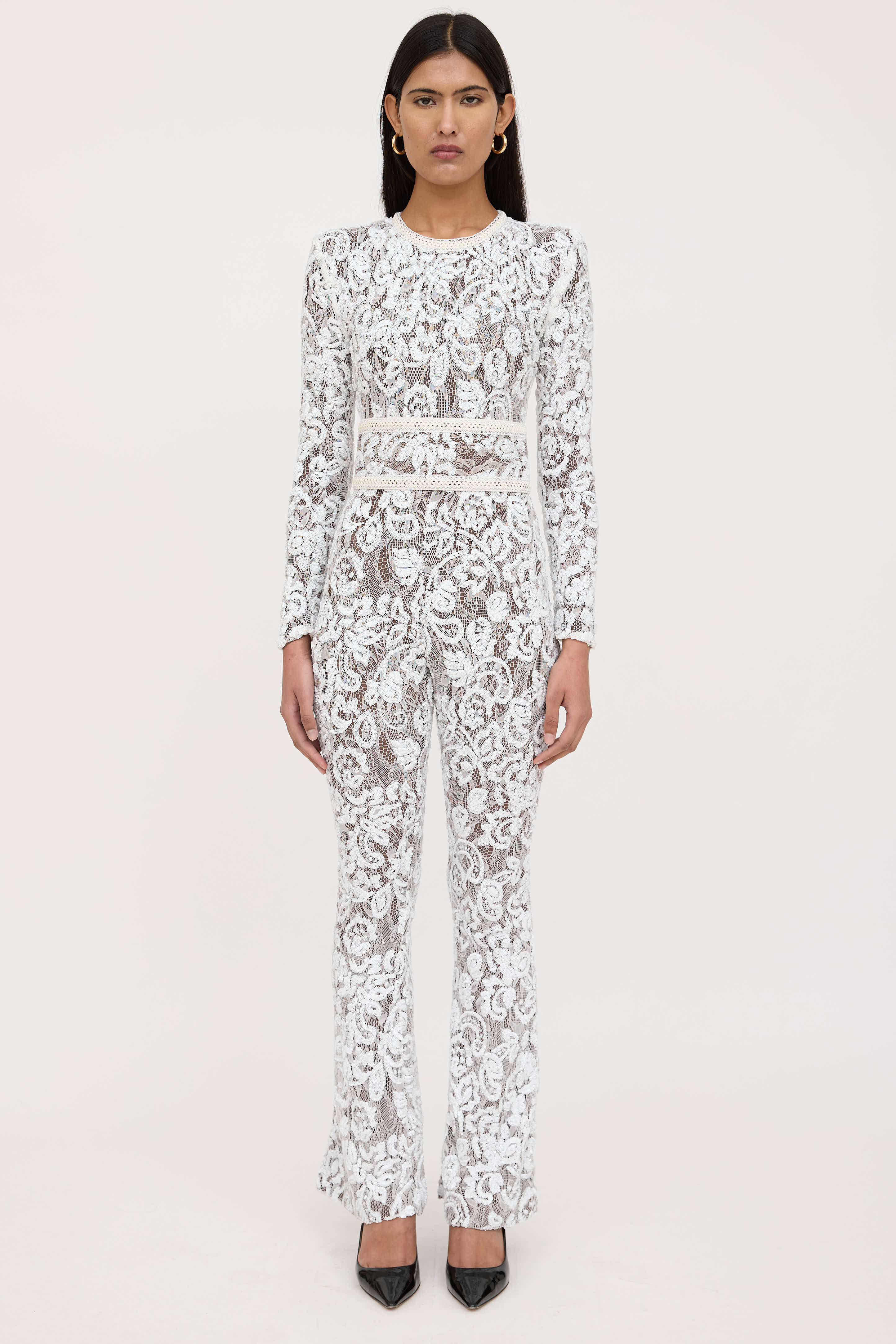 Nadine Merabi white lace jumpsuit featuring tonal sequin embellishment throughout, round braided neckline, long sleeves, adjustable tie belt, flared wide hem, and zip closure. Lined.