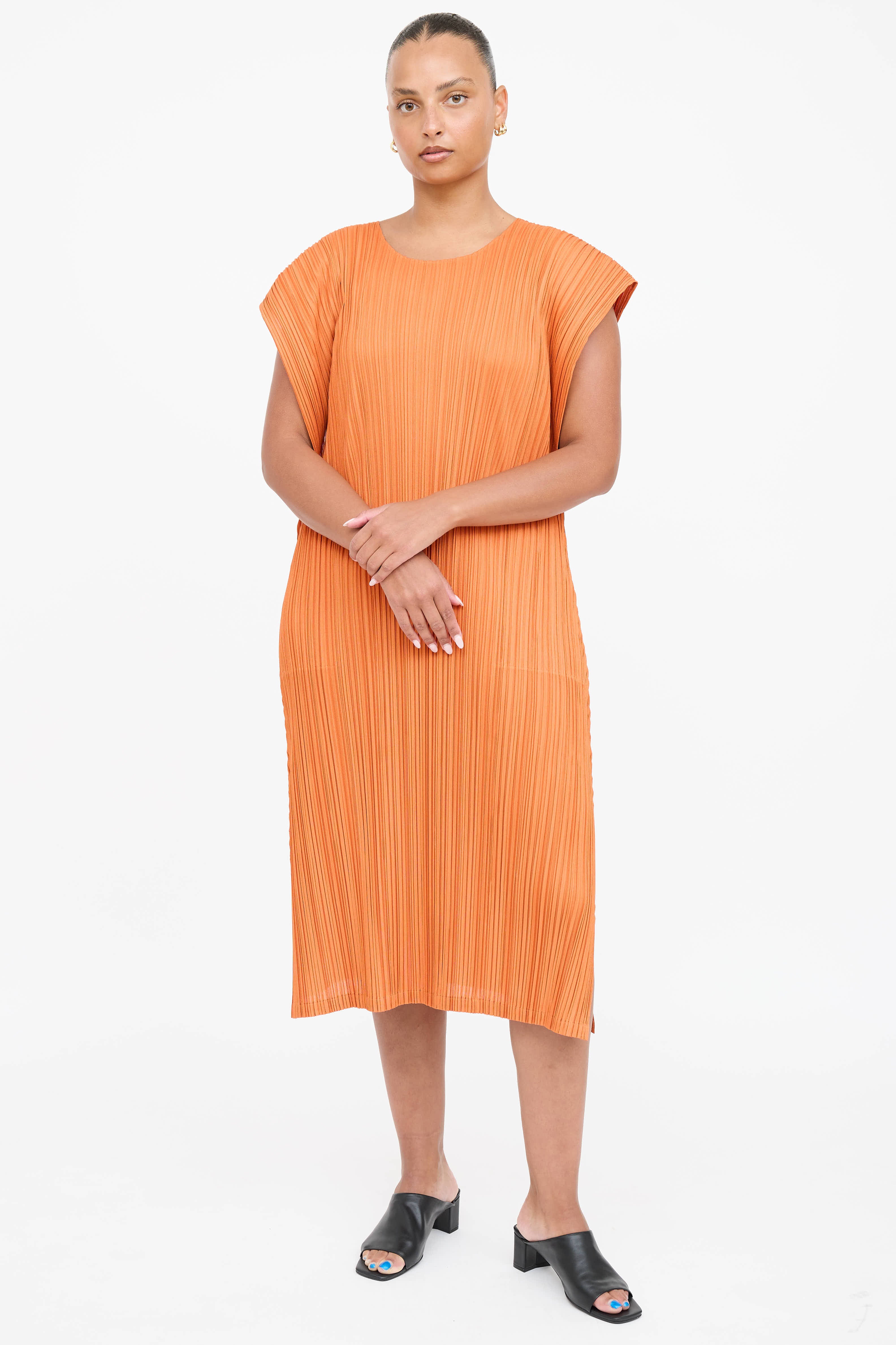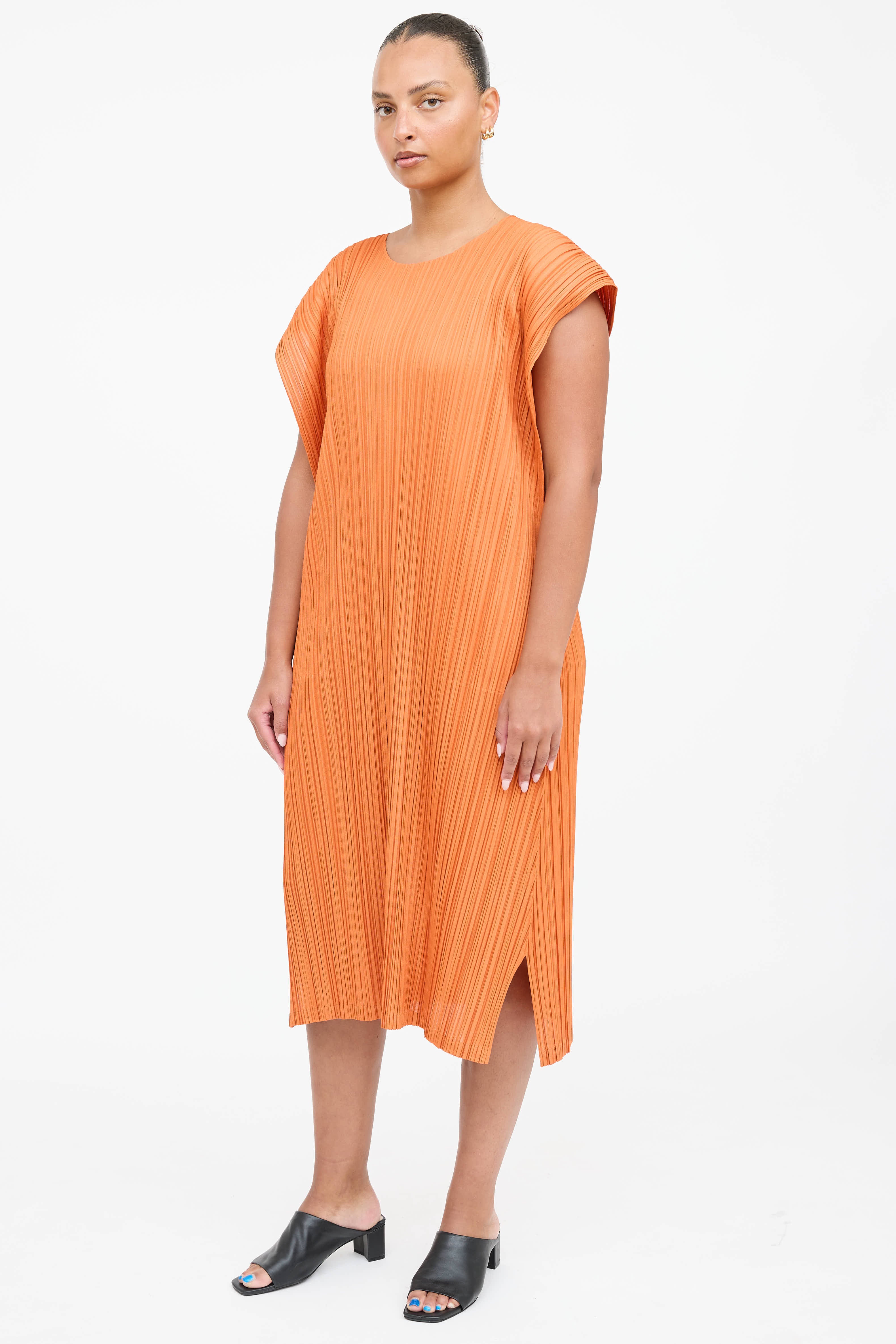 Pre-owned Pleats Please Issey Miyake orange pleated dress featuring a round neckline, layered cap sleeves, and two slip pockets at hip.