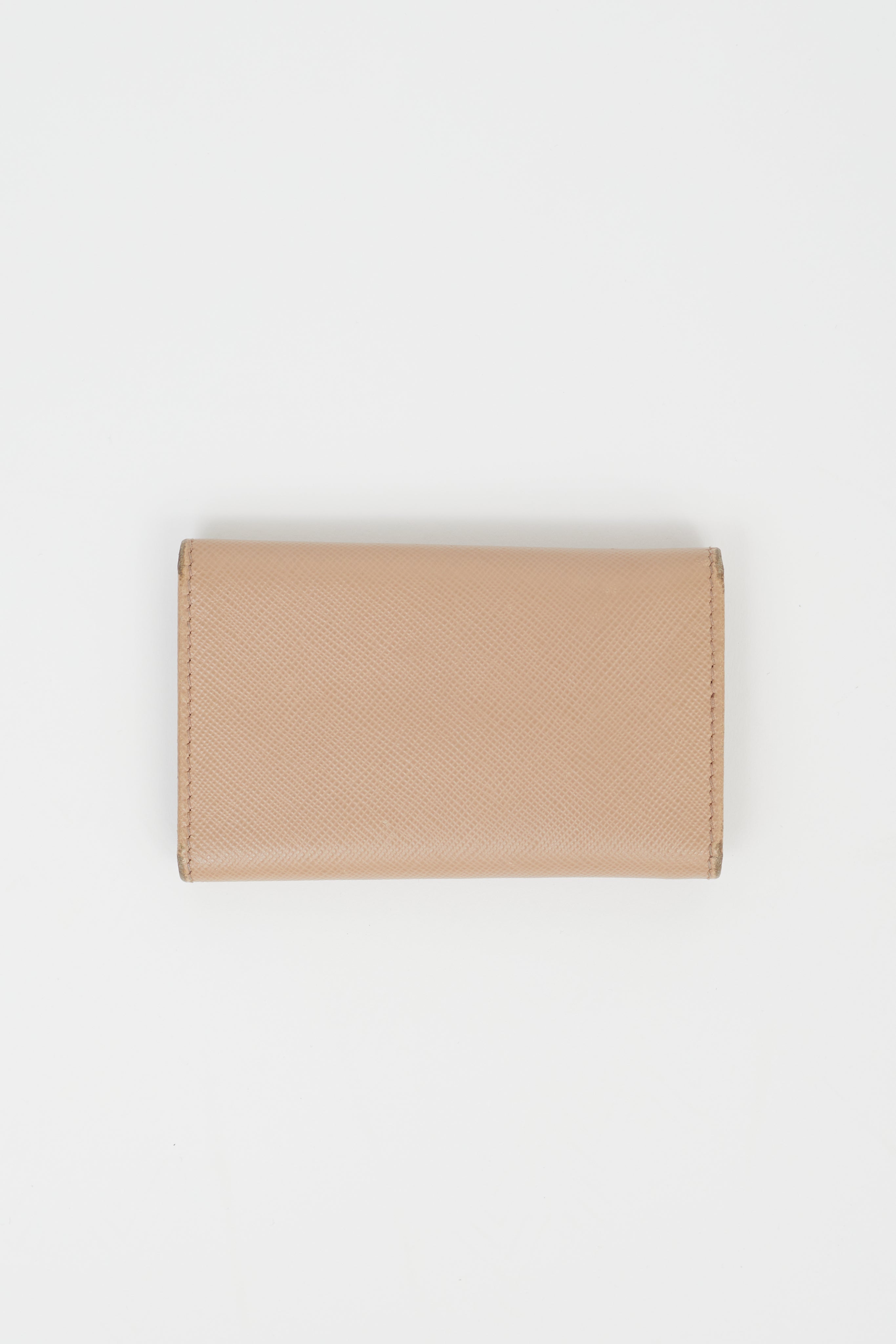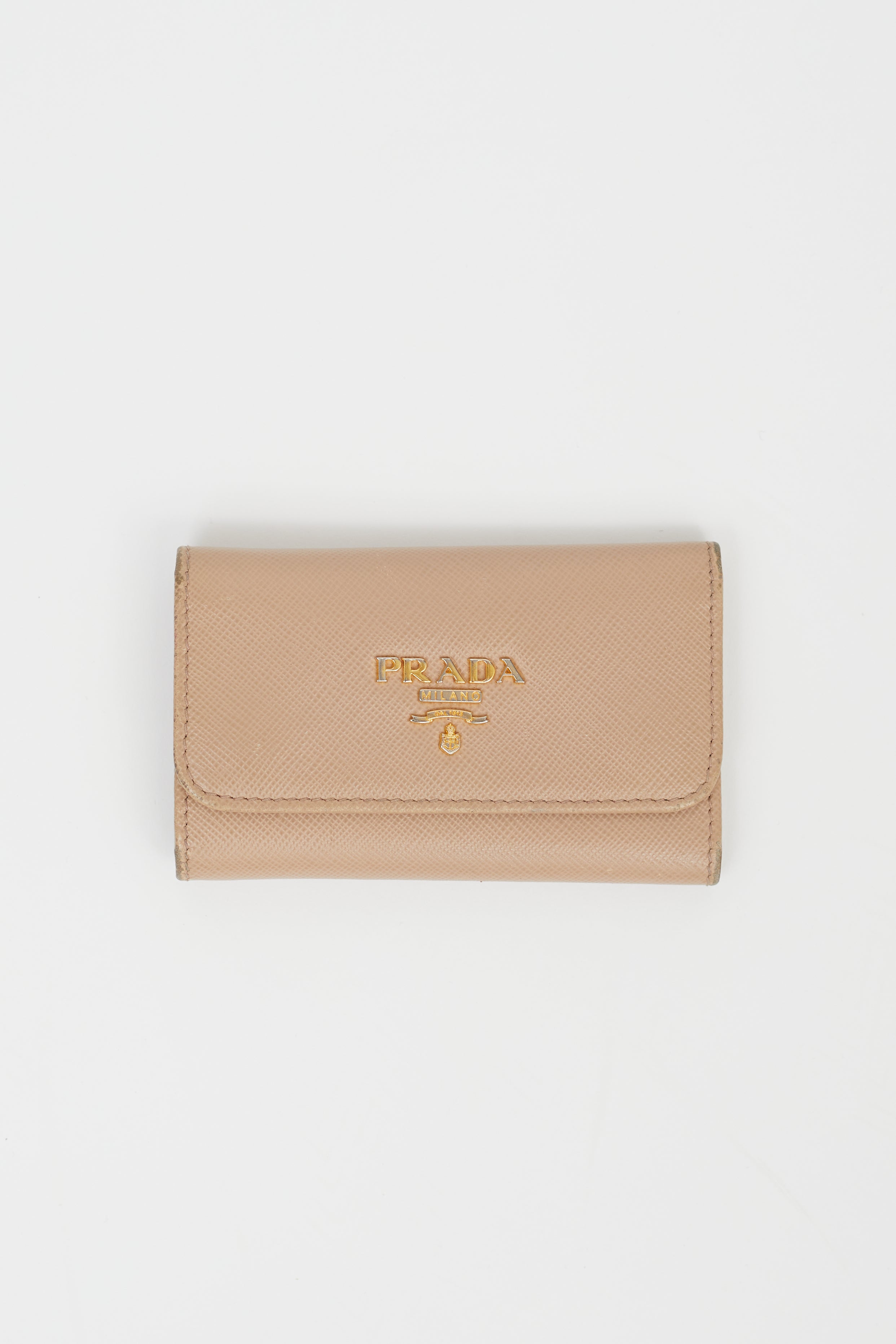 Pre-owned Prada beige Saffiano leather keyholder featuring gold-tone logo lettering plaque at front, snap closure, gold-tone metal ring, moire and Saffiano leather lining, six keychain hooks and one card slot at interior.
