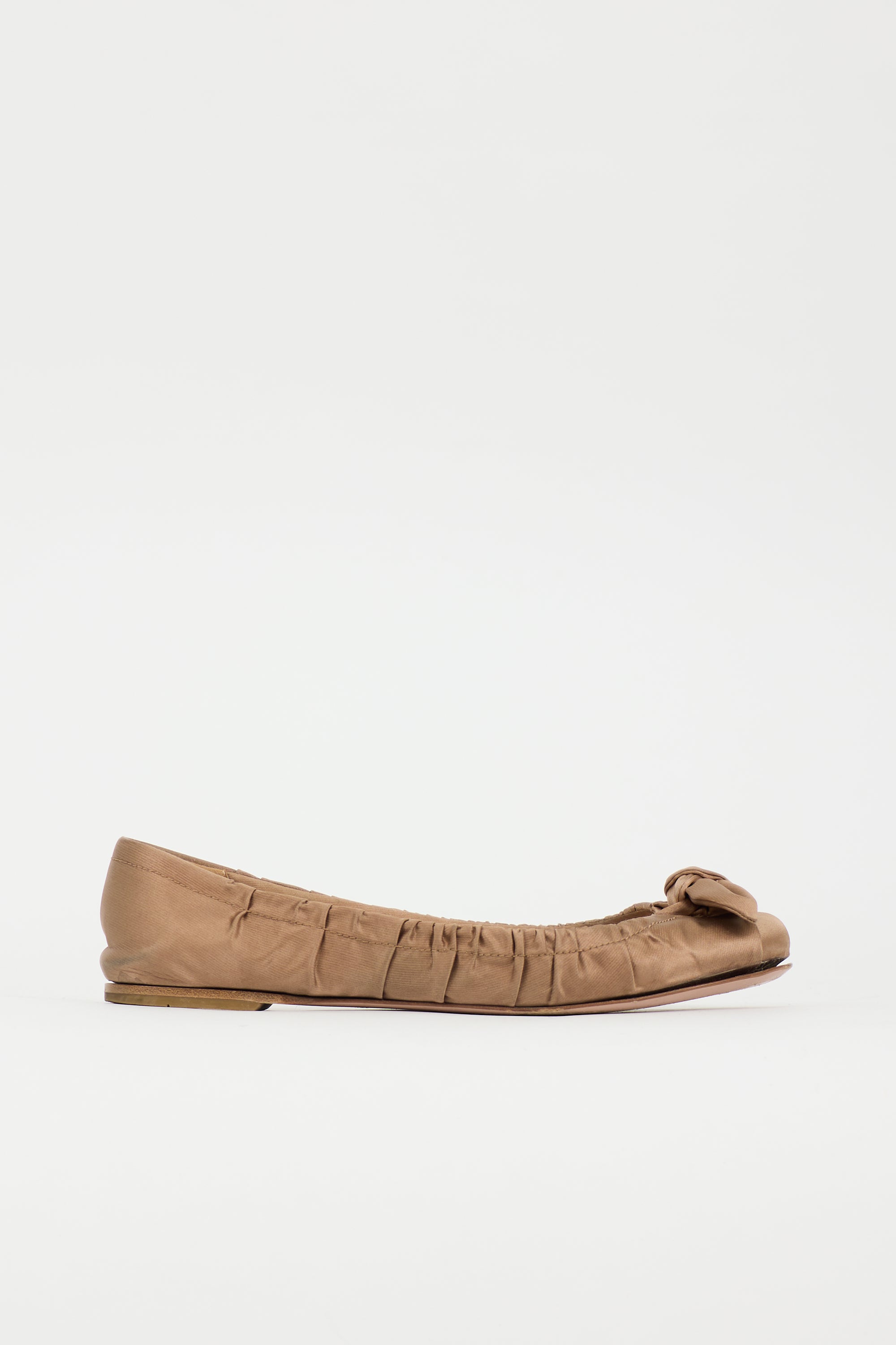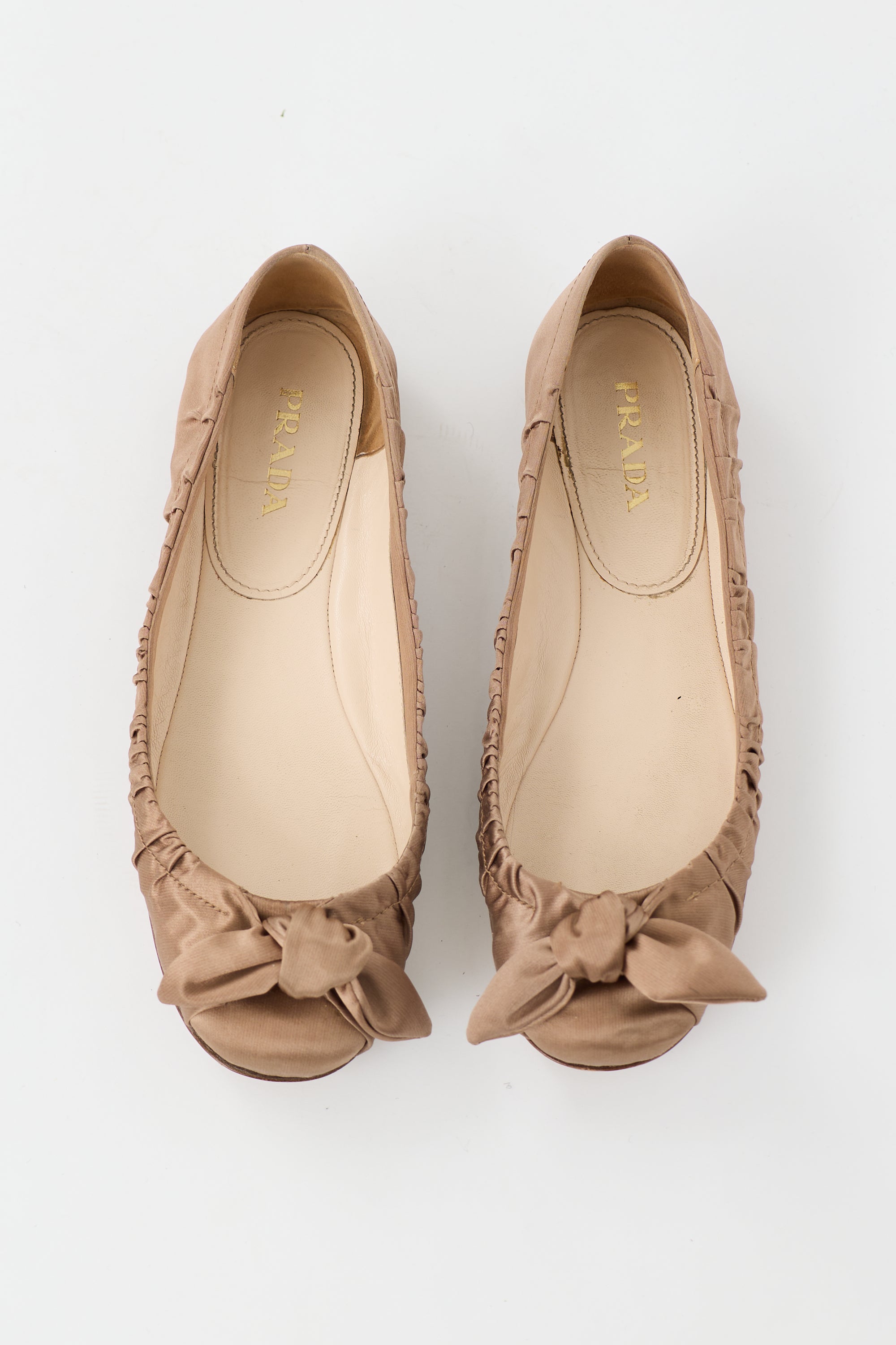 Pre-owned Prada beige satin flat featuring rounded toe, ruched collar, and attached bow at front. Includes original dust bag.