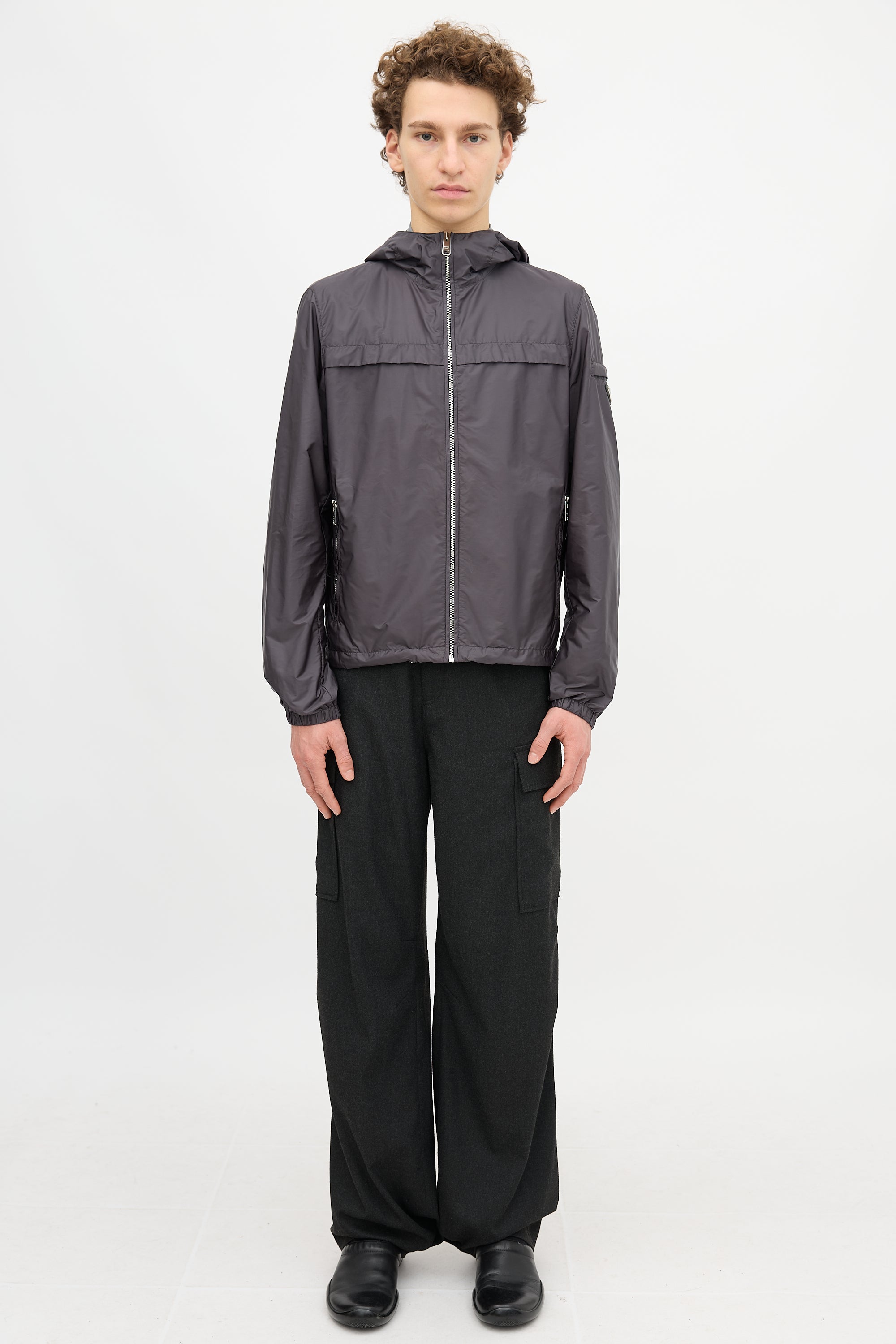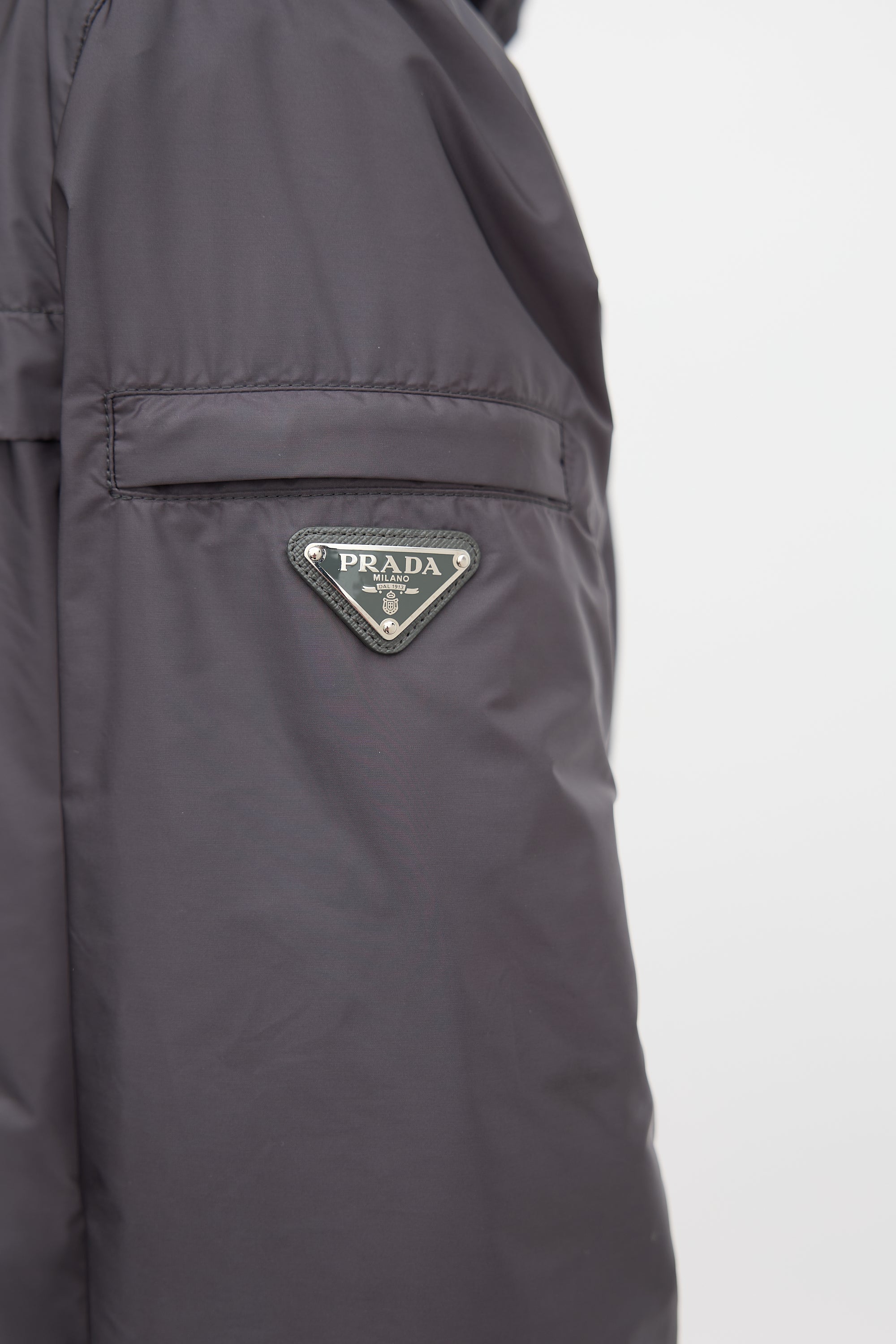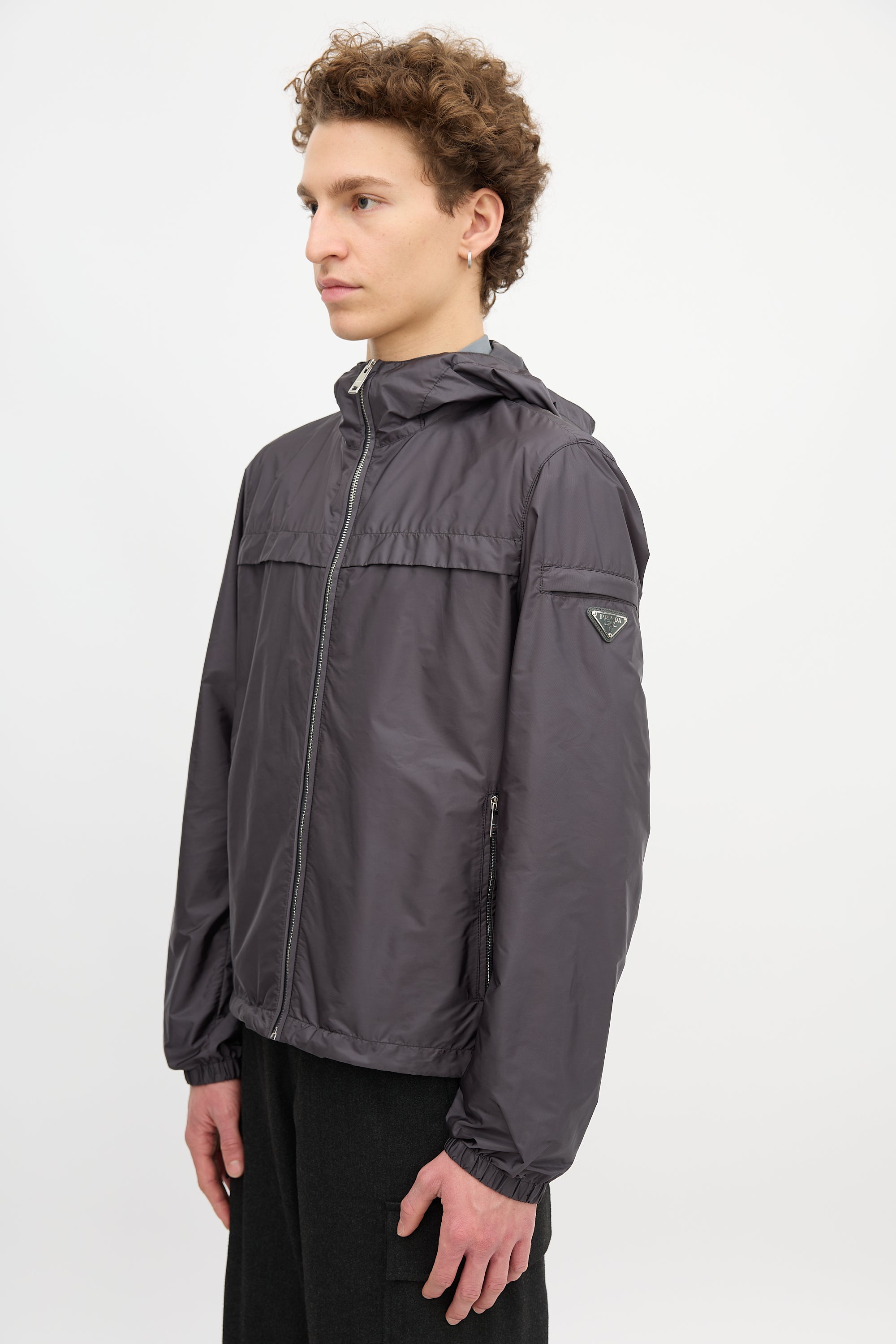 Pre-owned Prada Sport dark grey nylon windbreaker jacket featuring drawcord hood, zip up front, two front zip pockets, drawcord hem, zip pocket with triangle logo plaque at left arm, and elasticized cuffs.