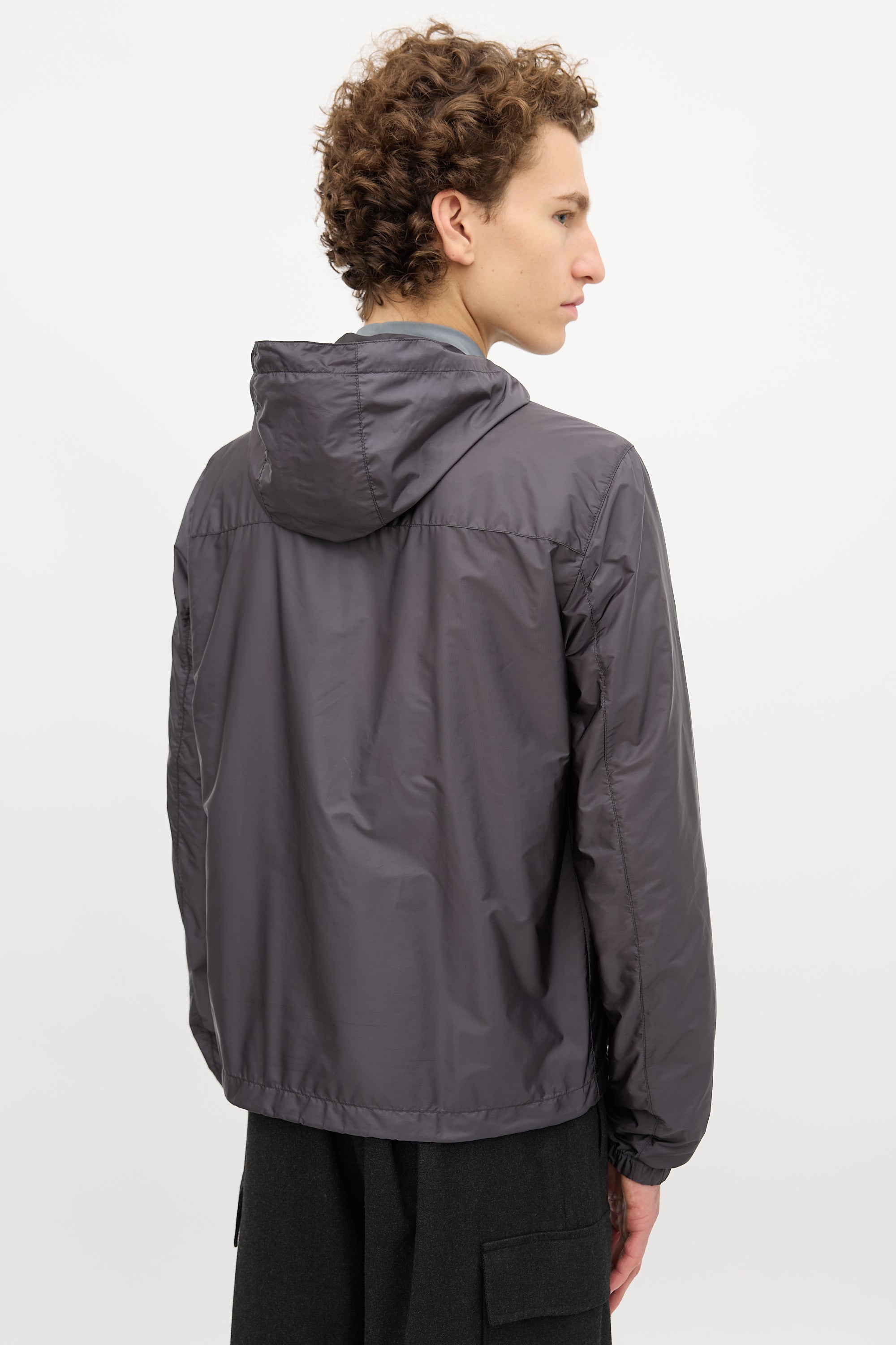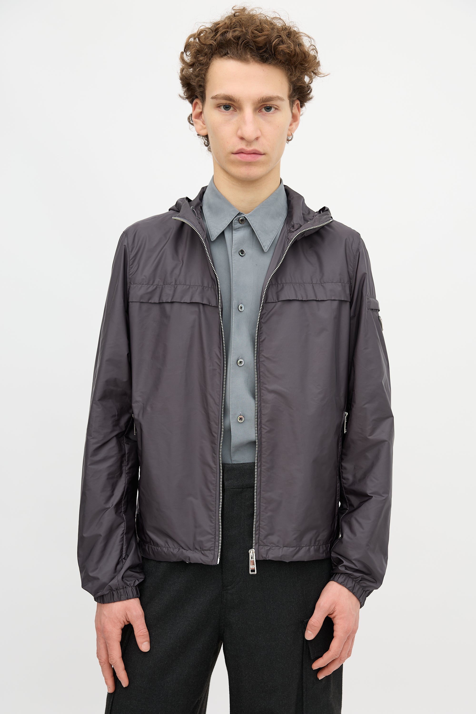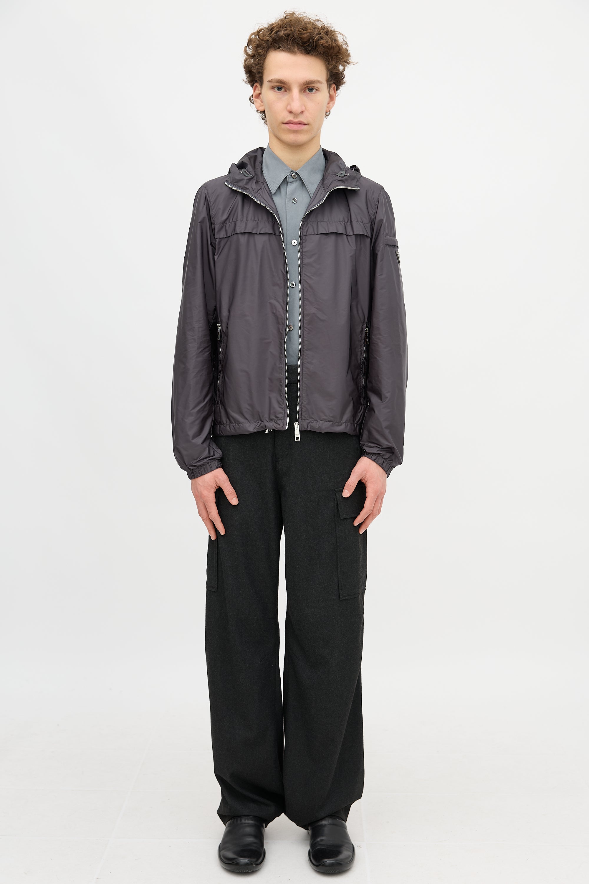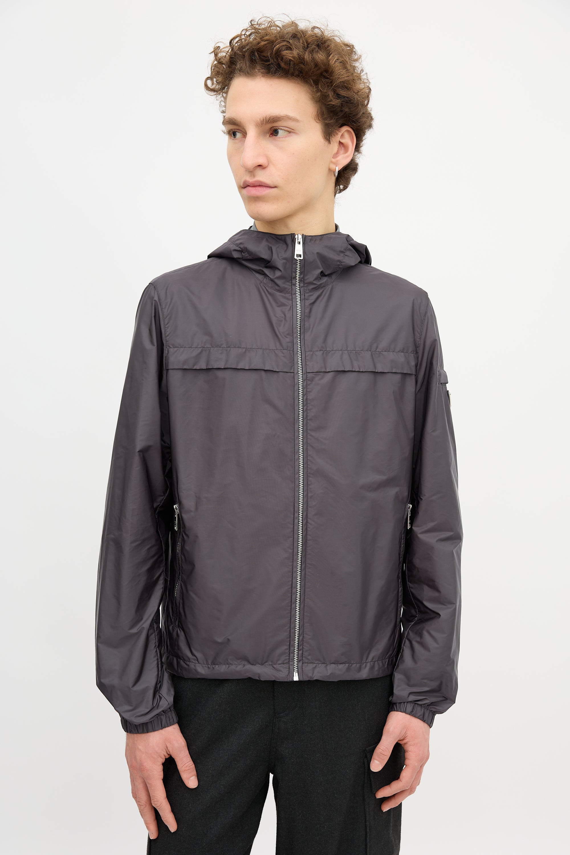 Pre-owned Prada Sport dark grey nylon windbreaker jacket featuring drawcord hood, zip up front, two front zip pockets, drawcord hem, zip pocket with triangle logo plaque at left arm, and elasticized cuffs.