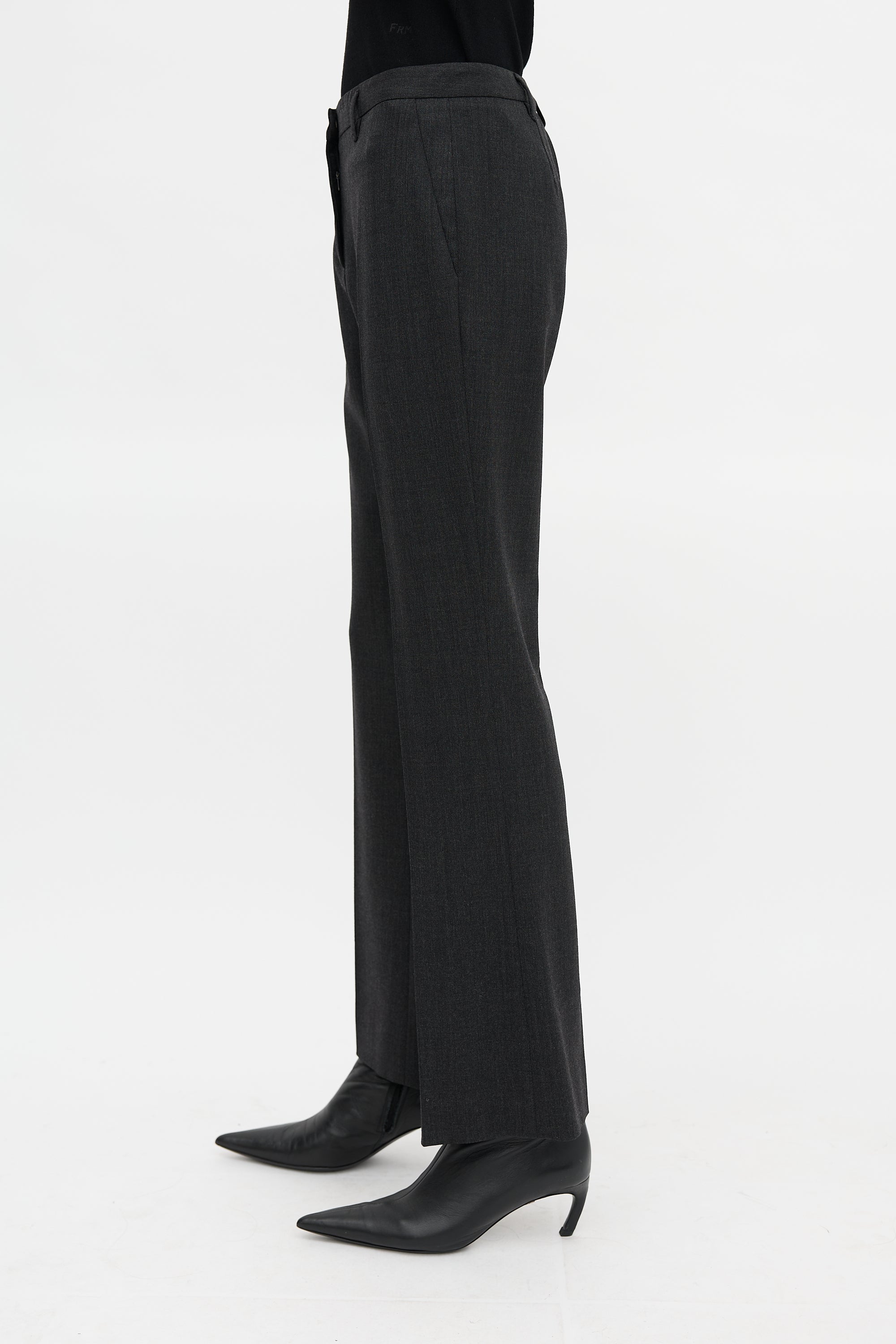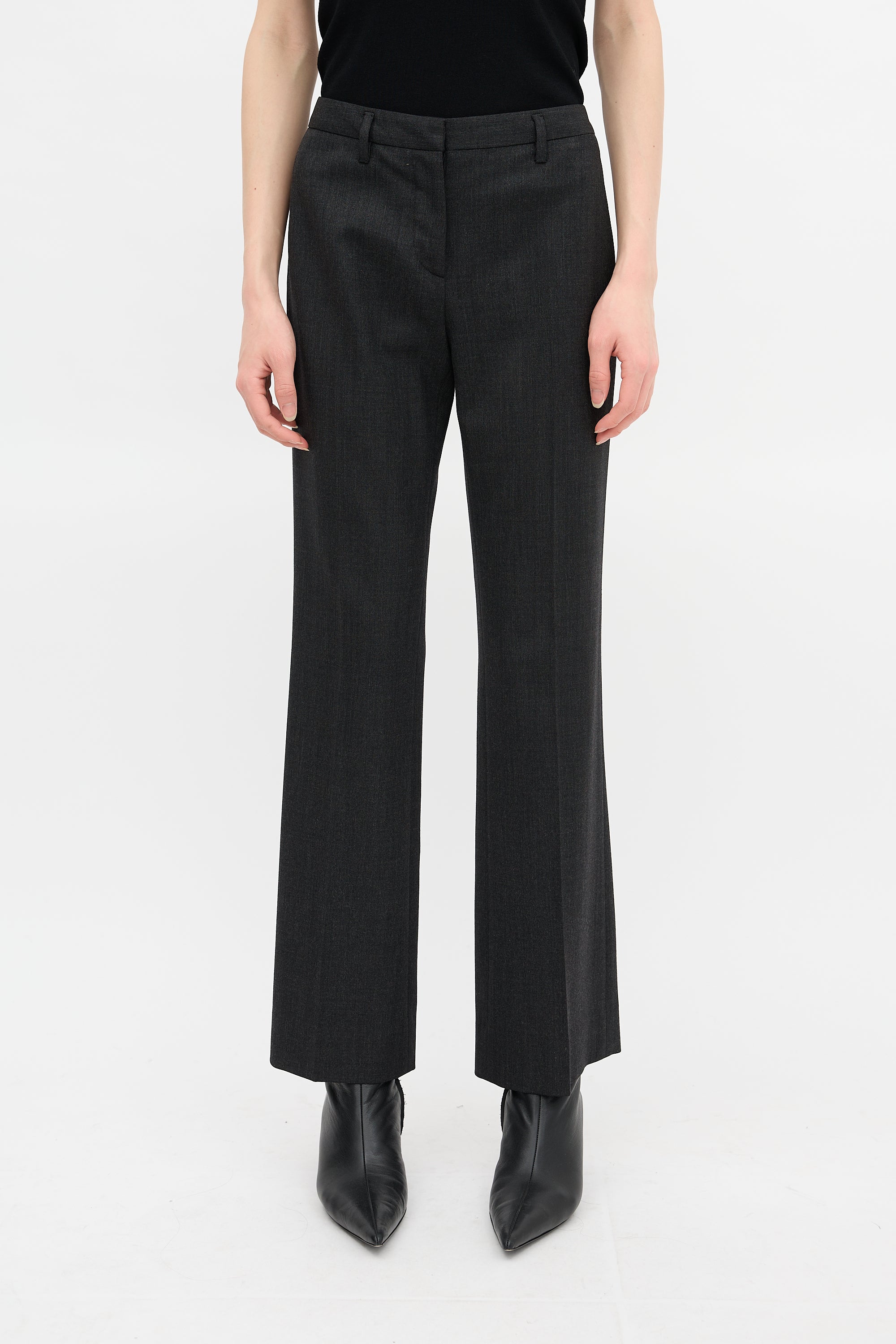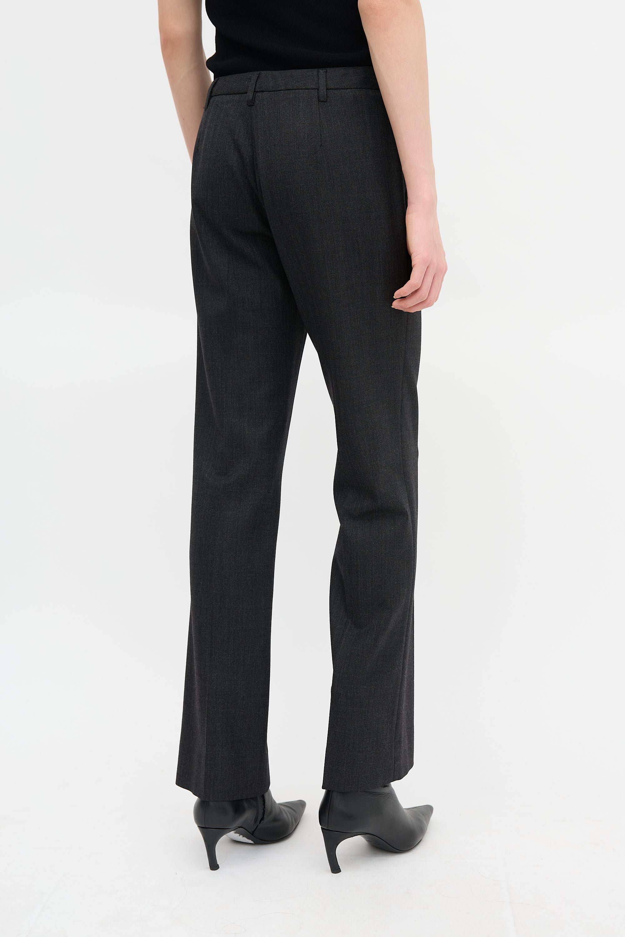 Pre-owned Prada dark grey wool blend trousers featuring a low rise, zip fly with hook and eye fastening, and straight leg. Unlined.