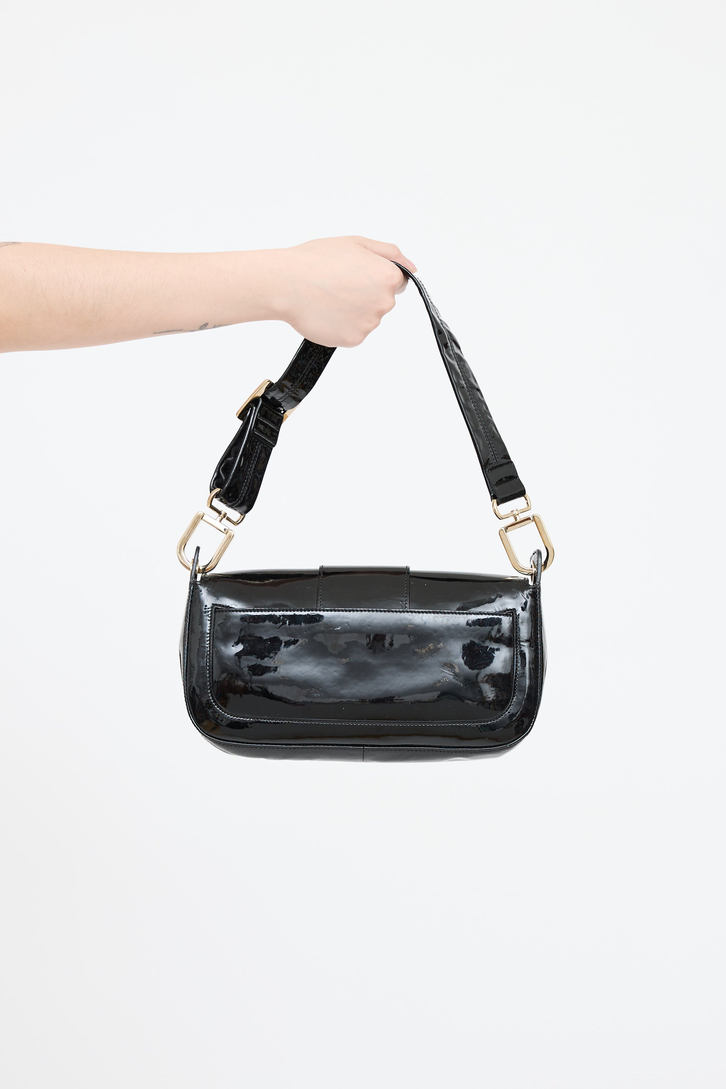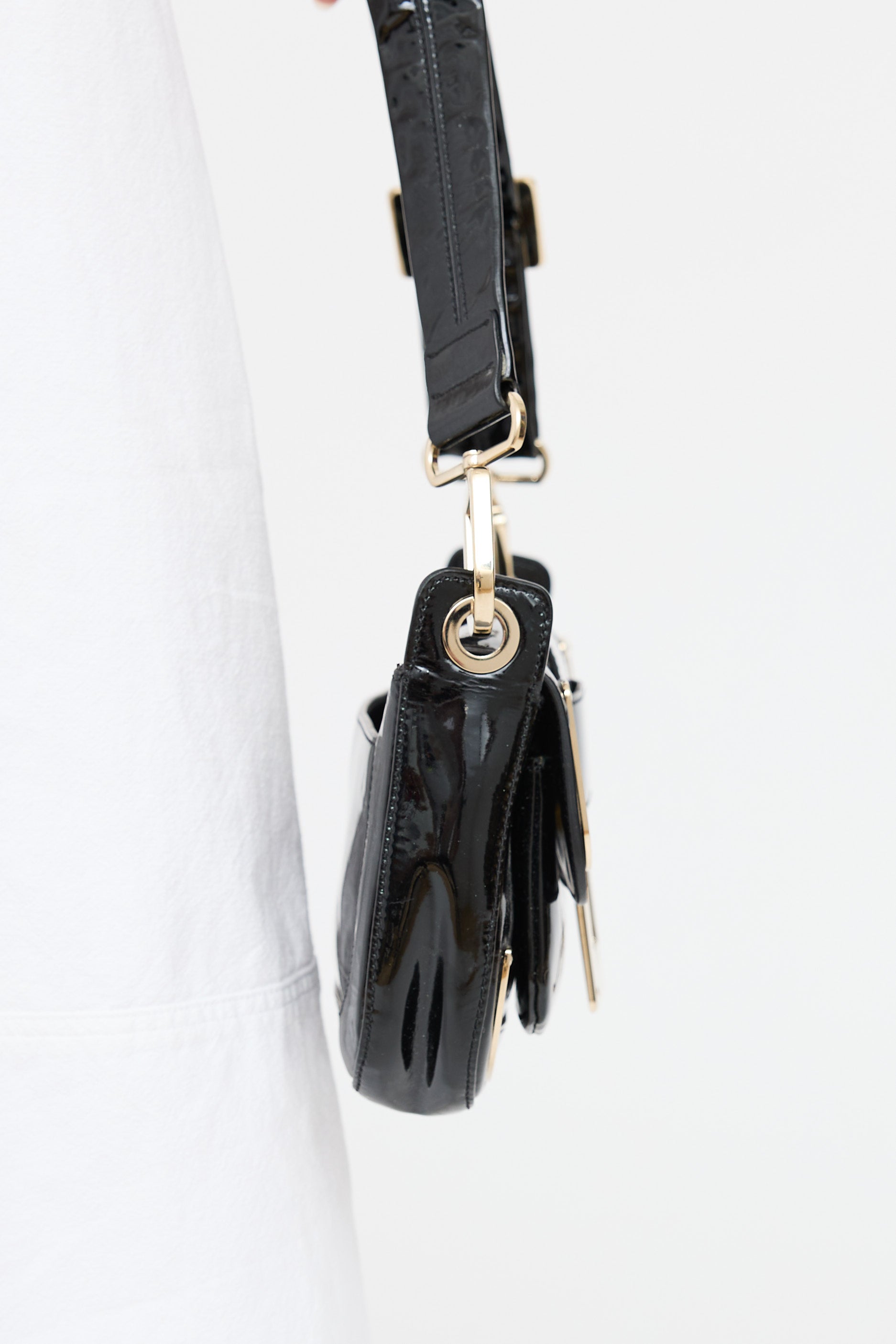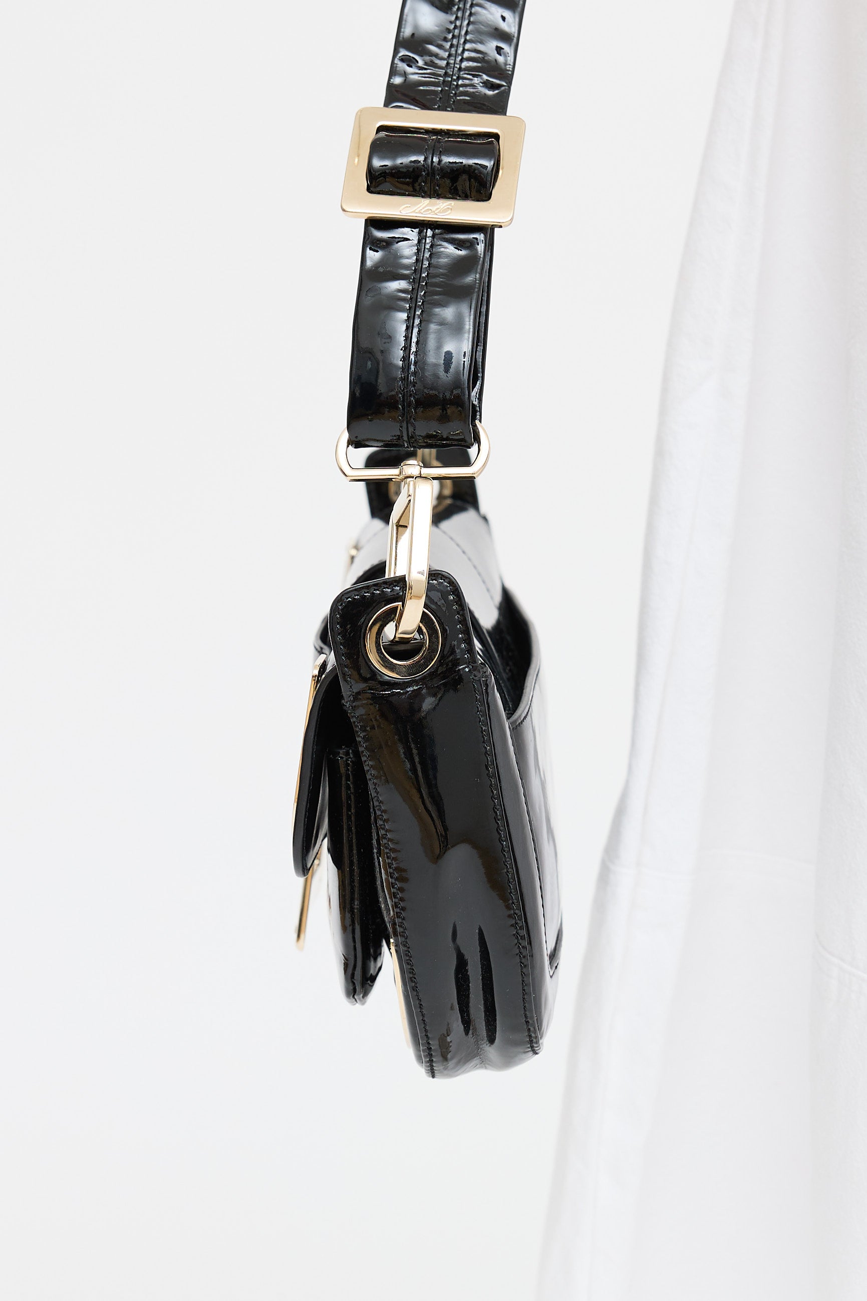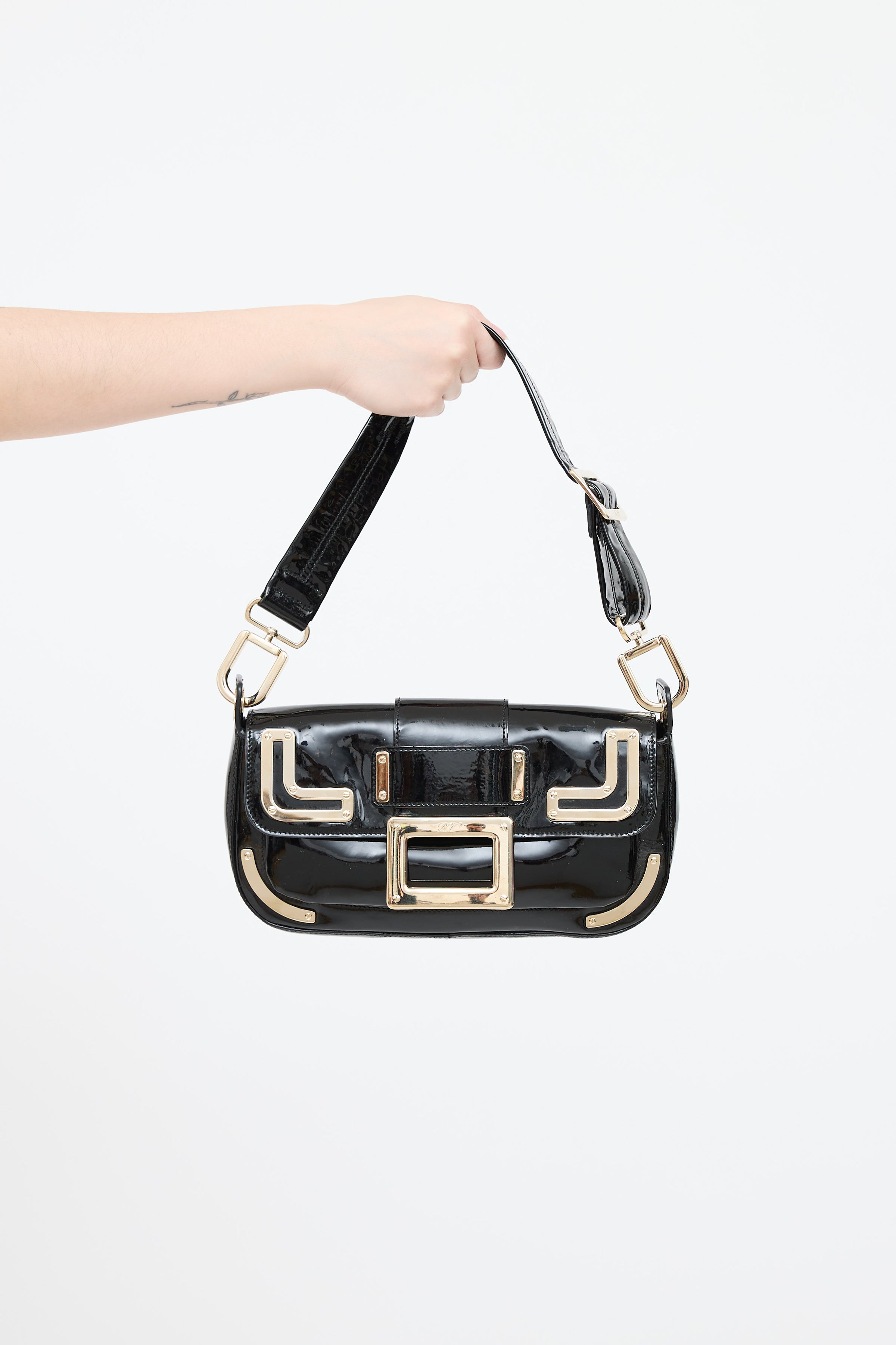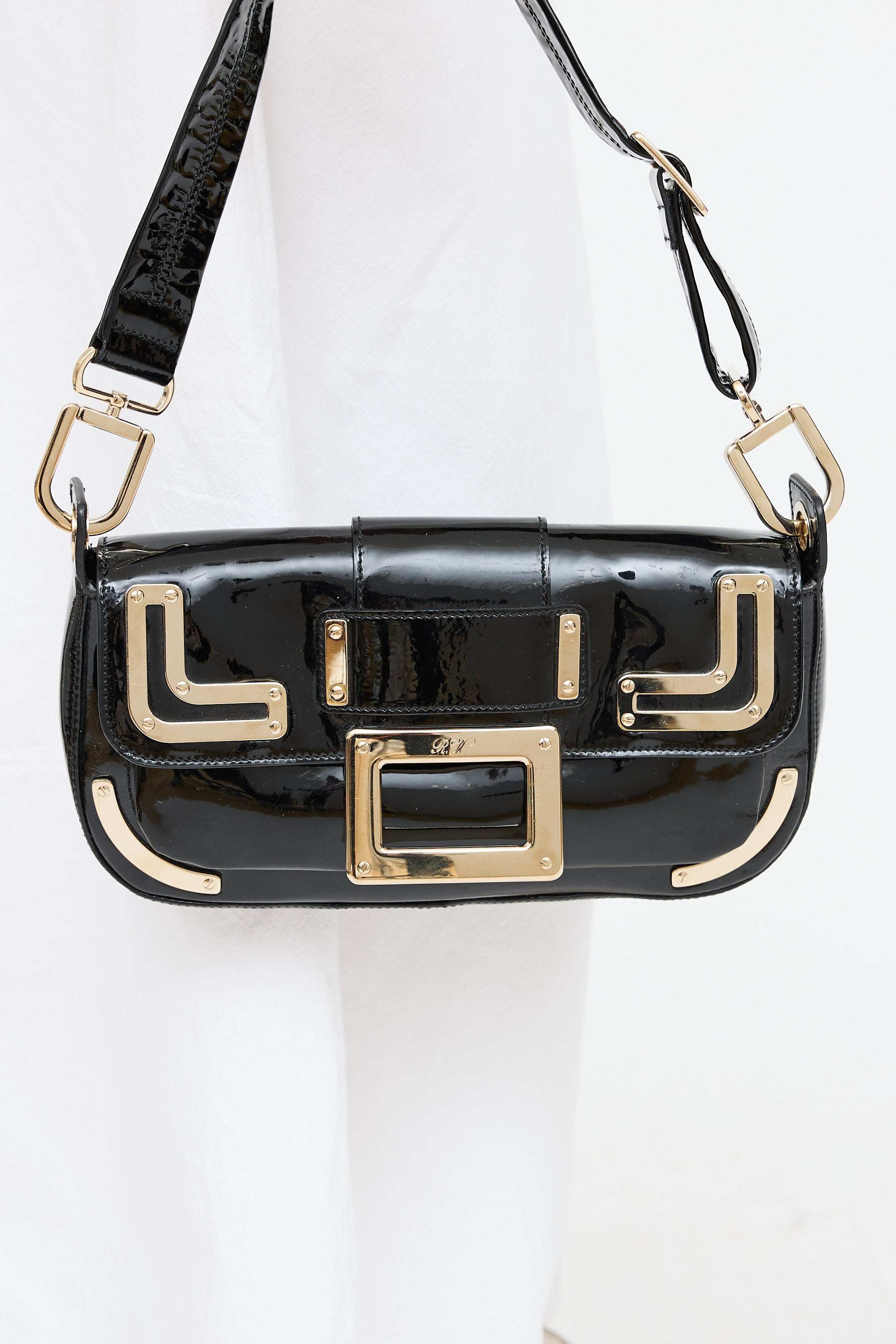 Pre-owned Roger Vivier black patent leather pochette featuring singular adjustable flat shoulder bag strap, gold tone hardware at front and at sides, exterior slip pocket at back, top flap with one main compartment, singular interior zip pocket, and slip pocket.