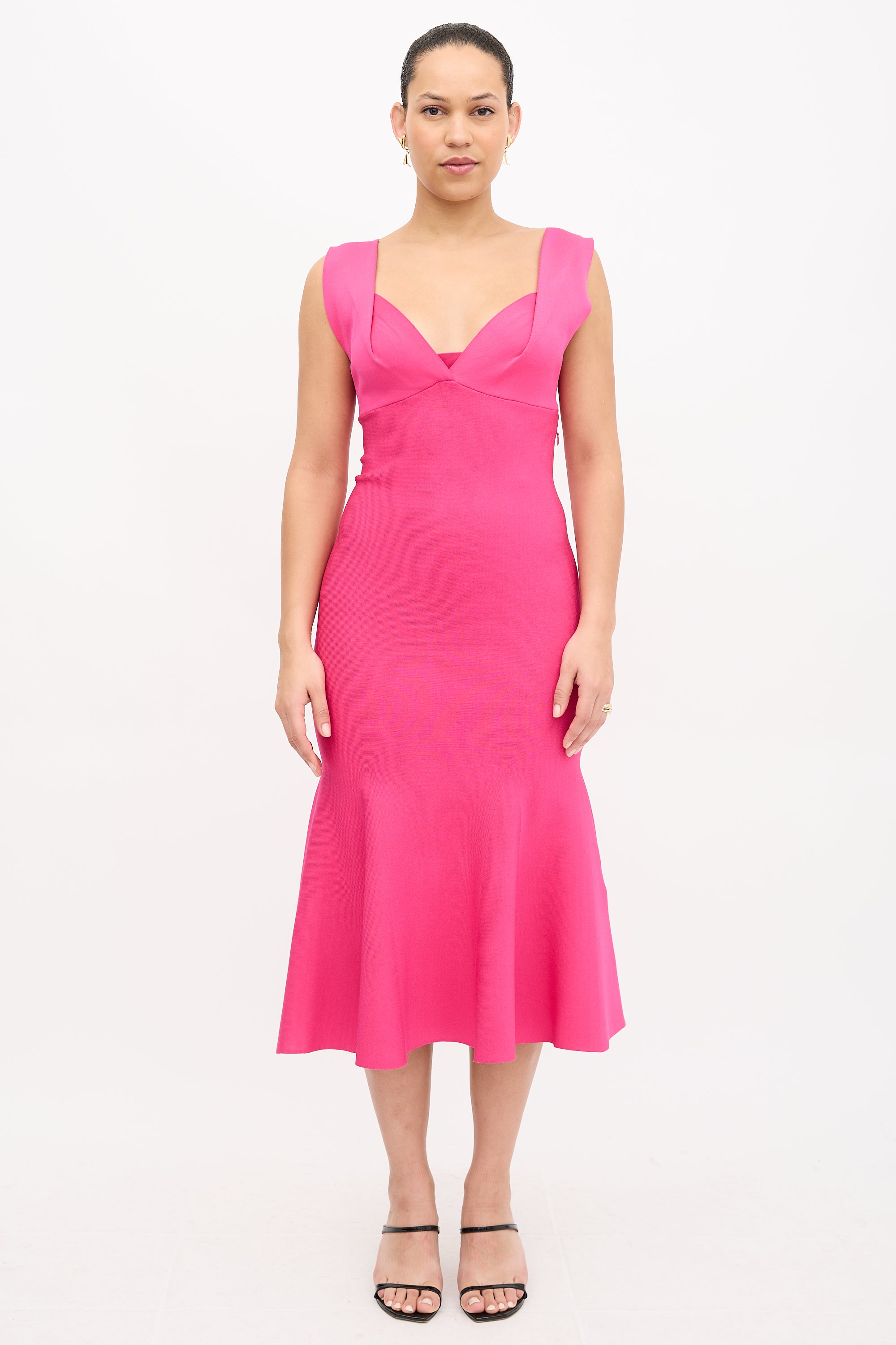 Pre-owned Roland Mouret pink knit midi dress featuring sweetheart neckline, fold detail, deep cut back, fluted hem, and concealed side zip closure.