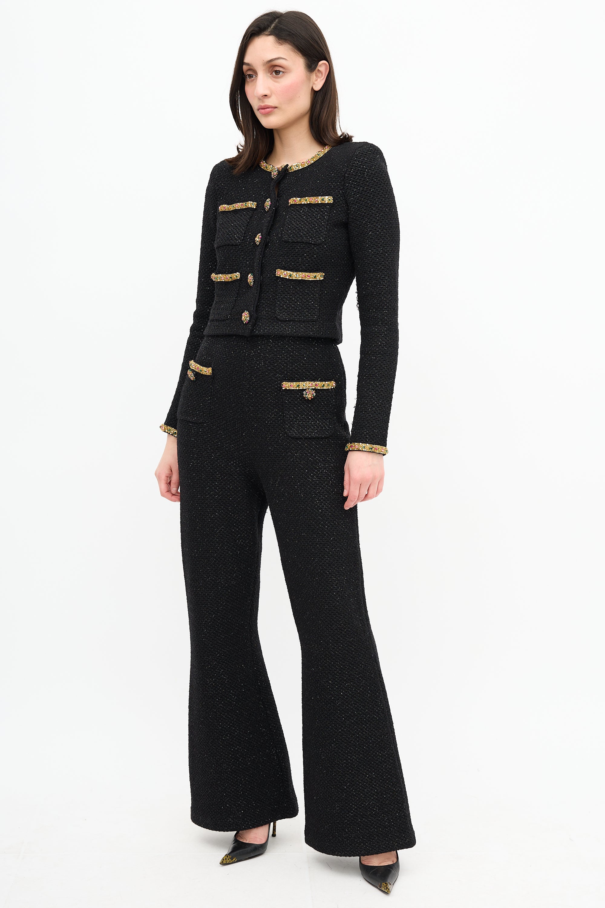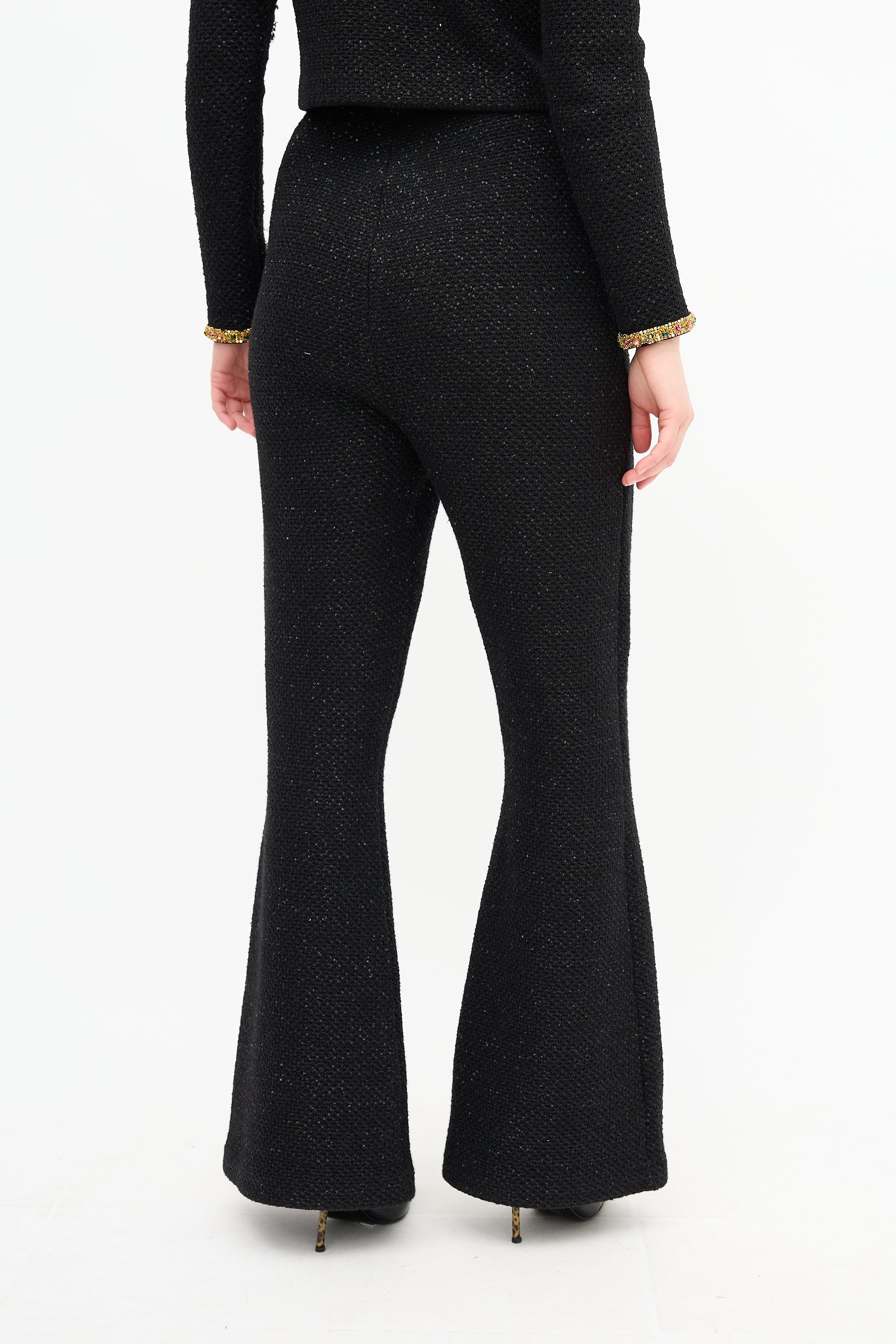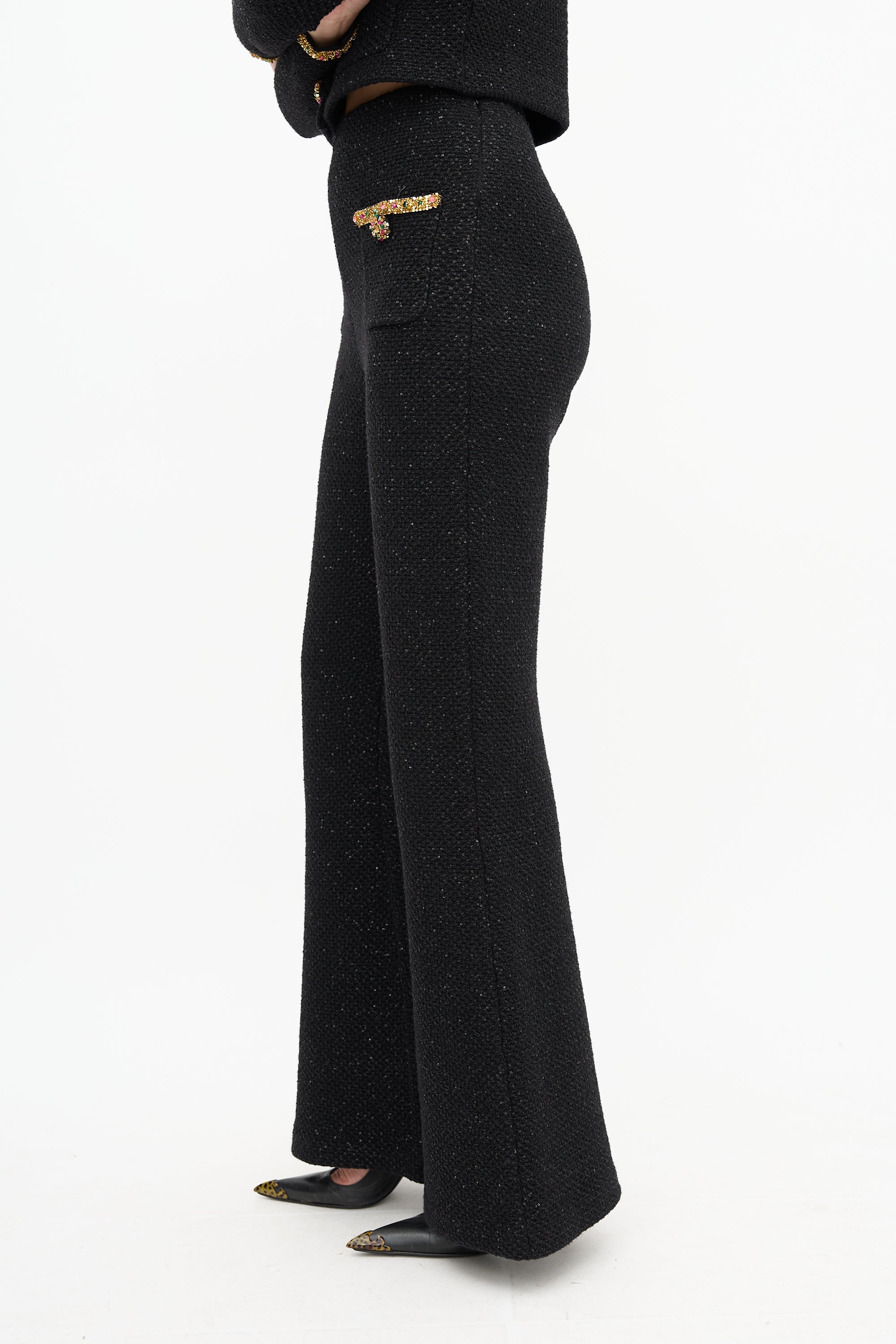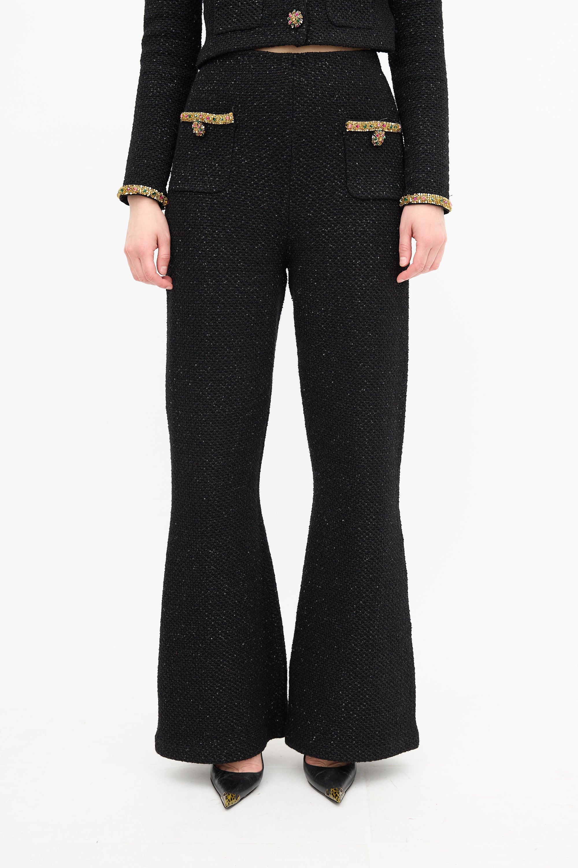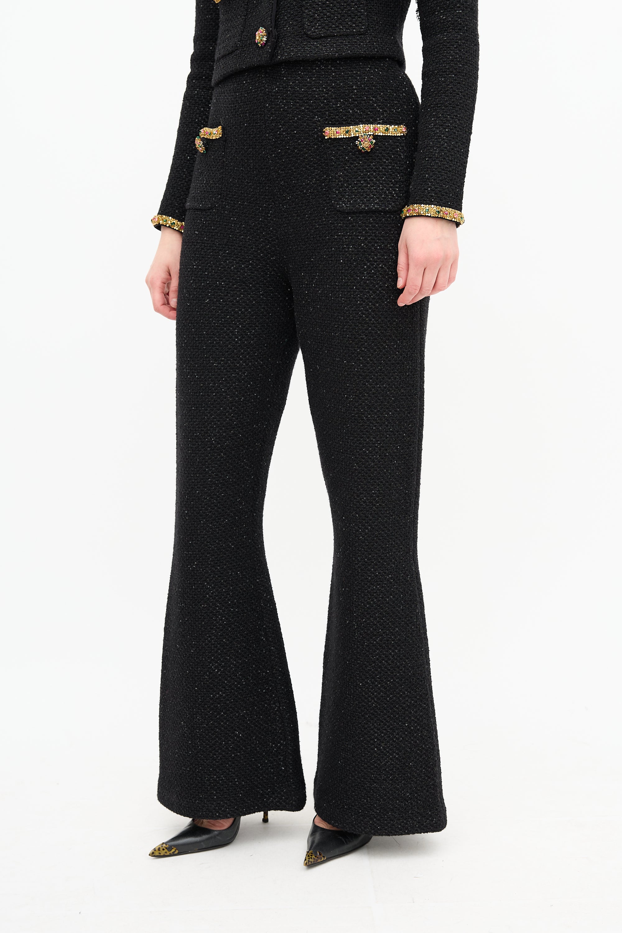 Pre-owned Self-Portrait knit black pants featuring tonal sequin, gold and multicolour embellished patch pockets, elasticized waistband, concealed side zip, and flared leg. Unlined.