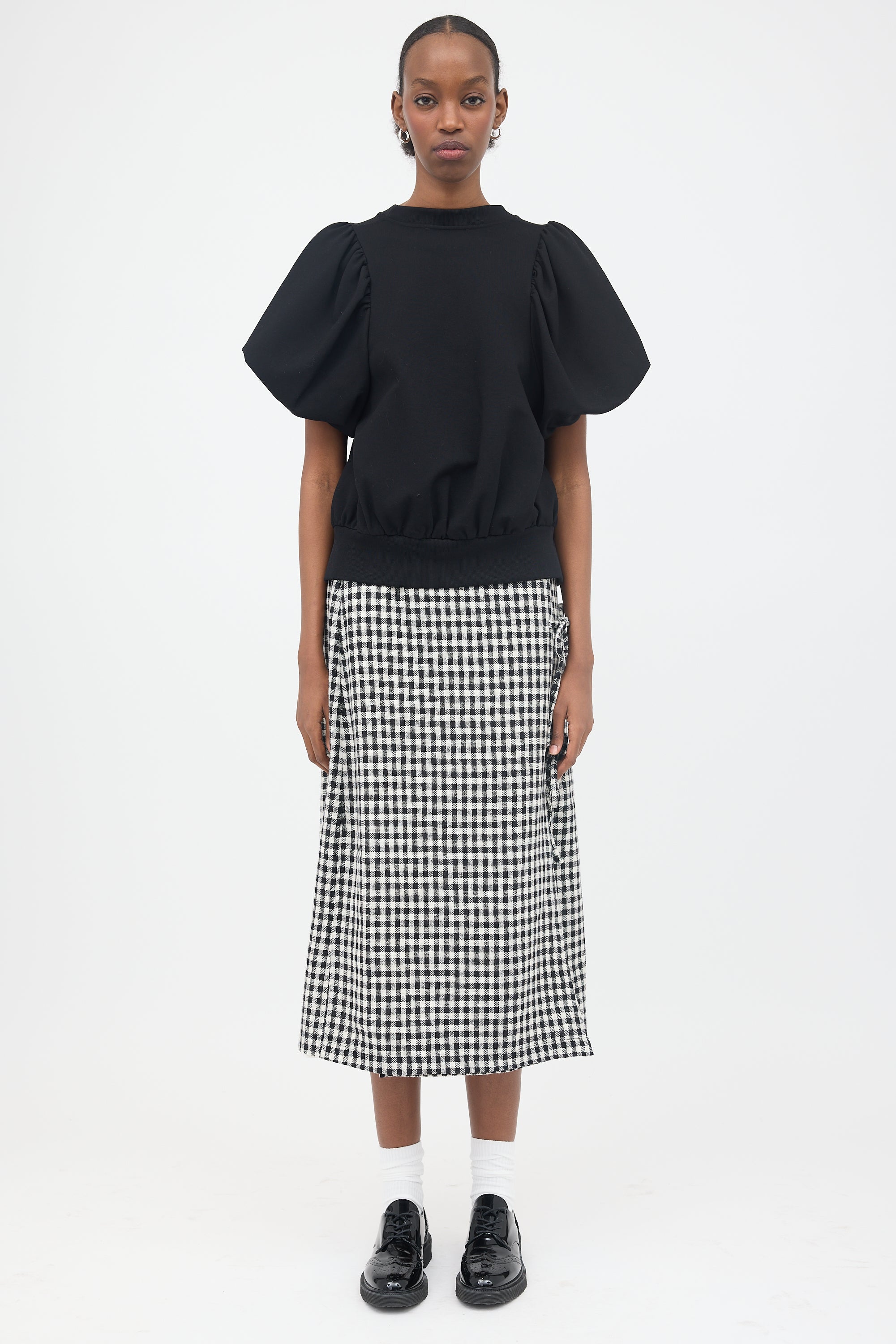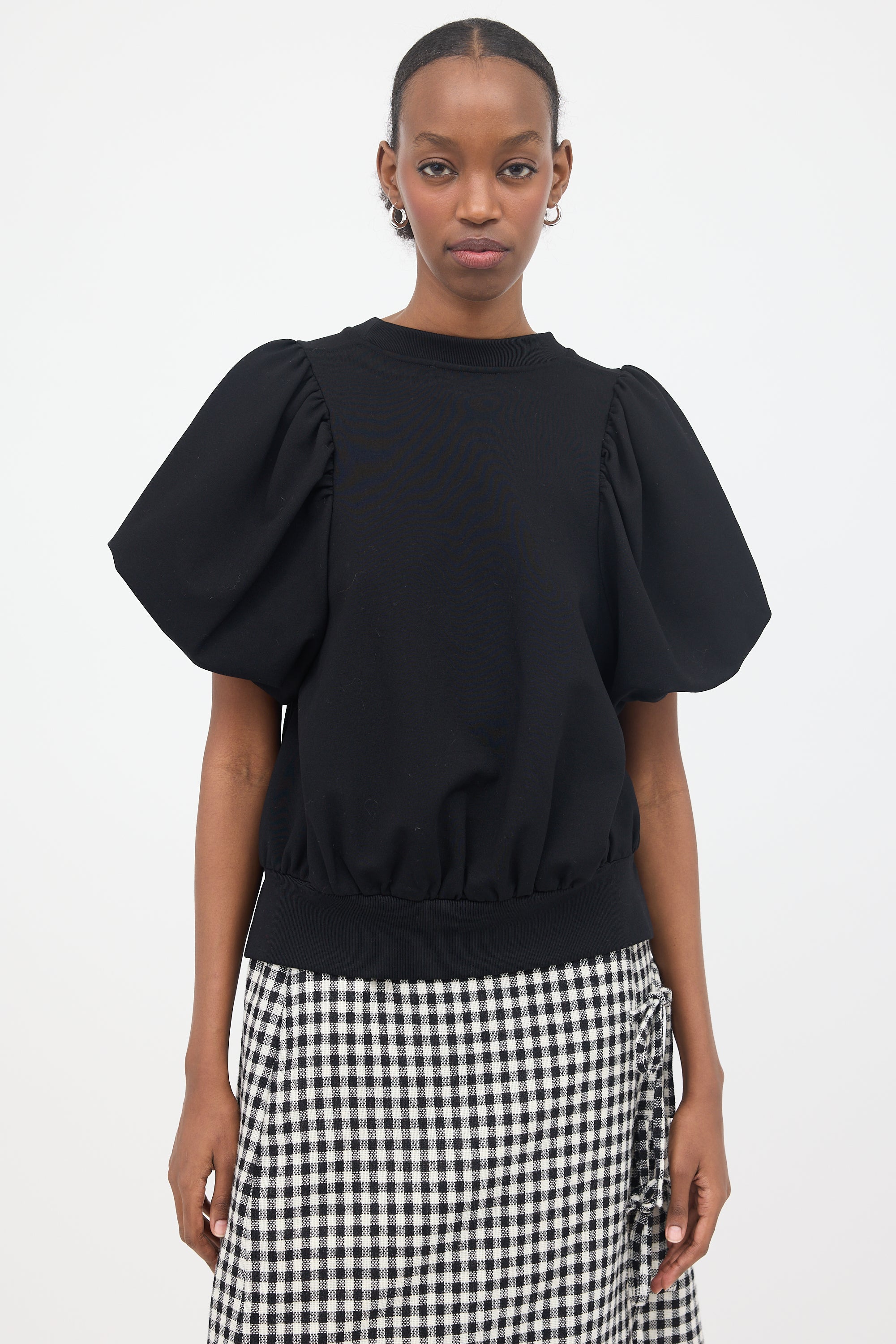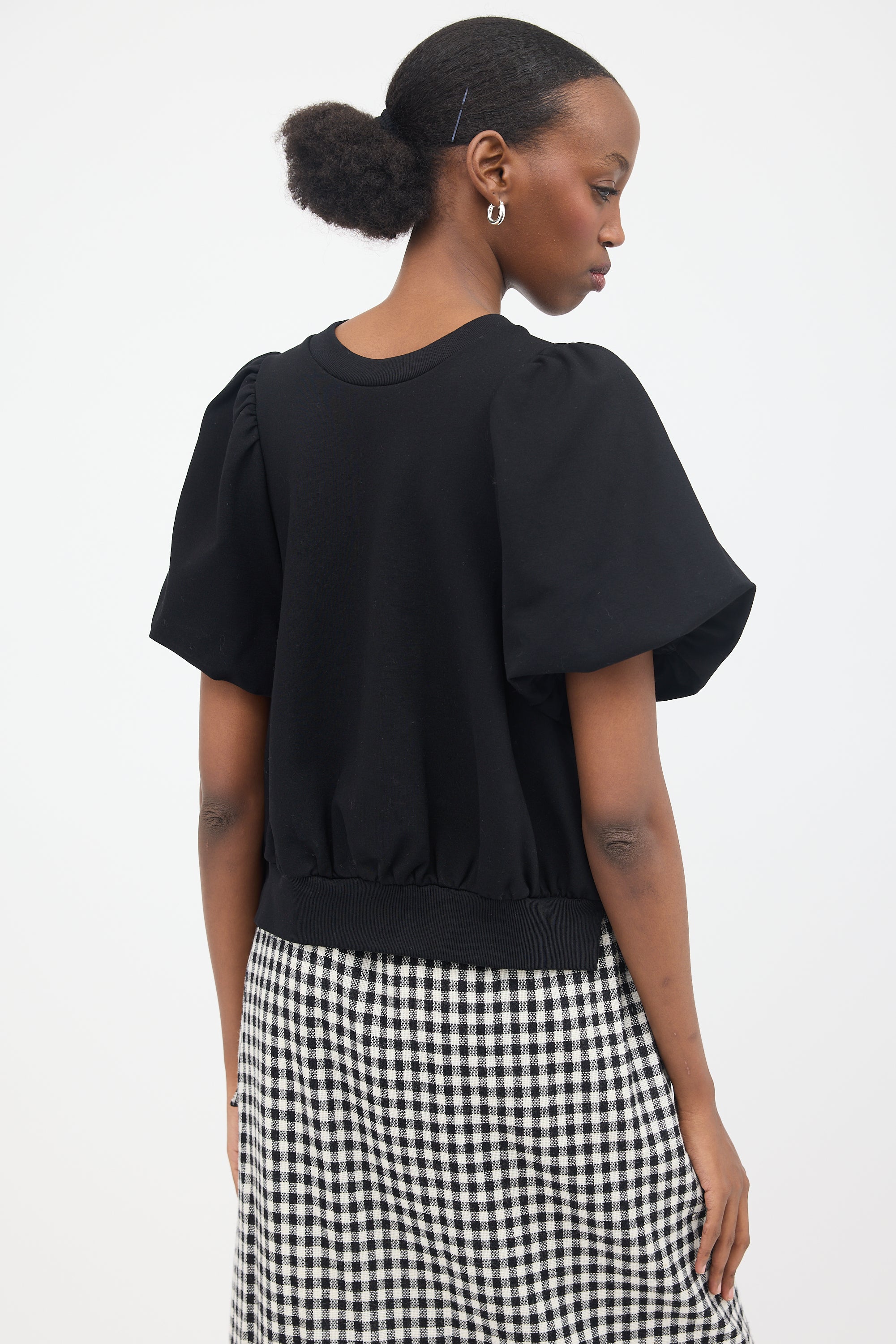 Pre-owned Simone Rocha black knit top featuring a crew neckline, puff sleeves, hi-low hem, and ribbed trim.