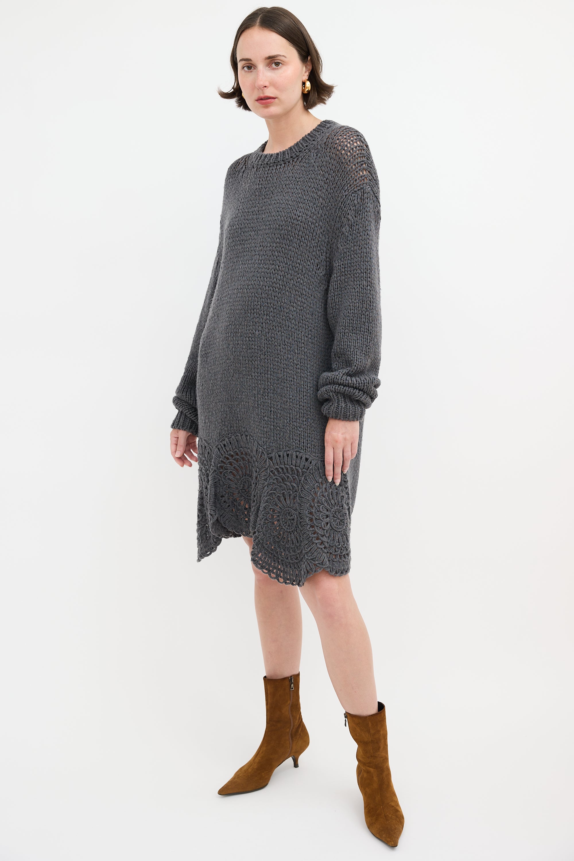 Pre-owned Stella McCartney dark grey midi sweater dress featuring crew neckline, crochet hem, and ribbed collar, back hem, and cuffs.