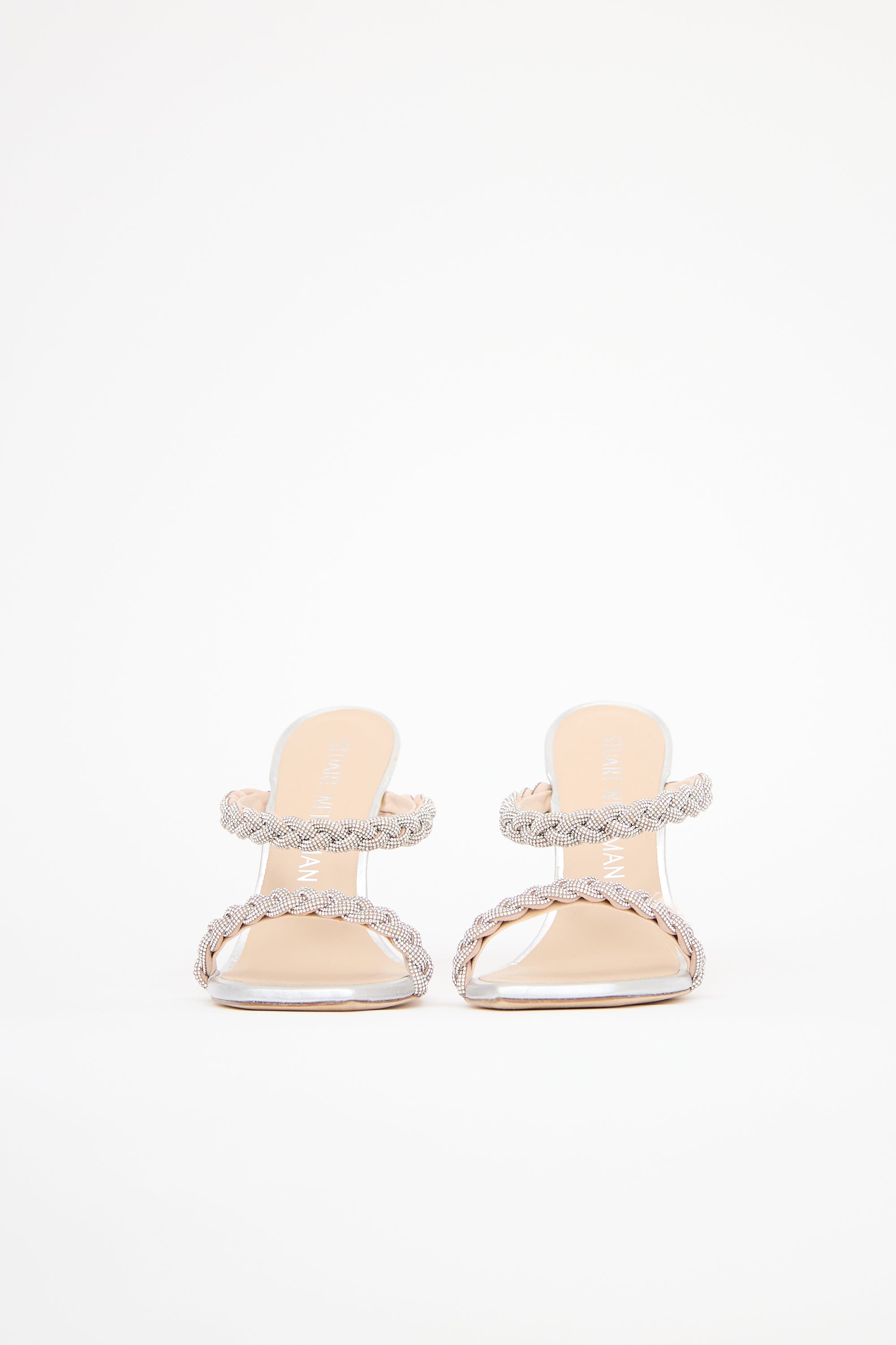 Pre-owned Stuart Weitzman silver metallic leather Addison 100 sandals featuring an open square toe, crystal embellished braided straps at vamp, slip on entry, and covered stiletto heel.
