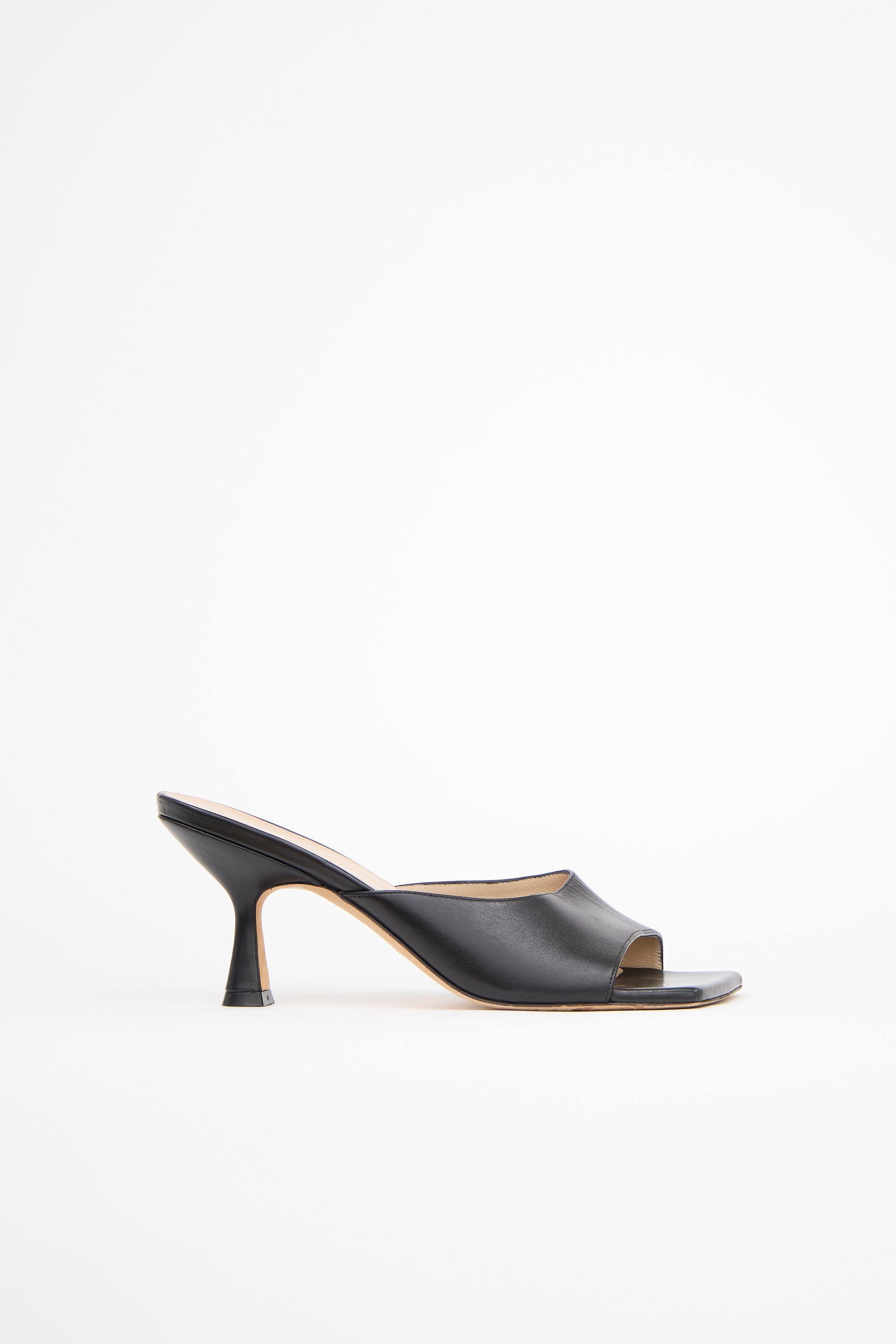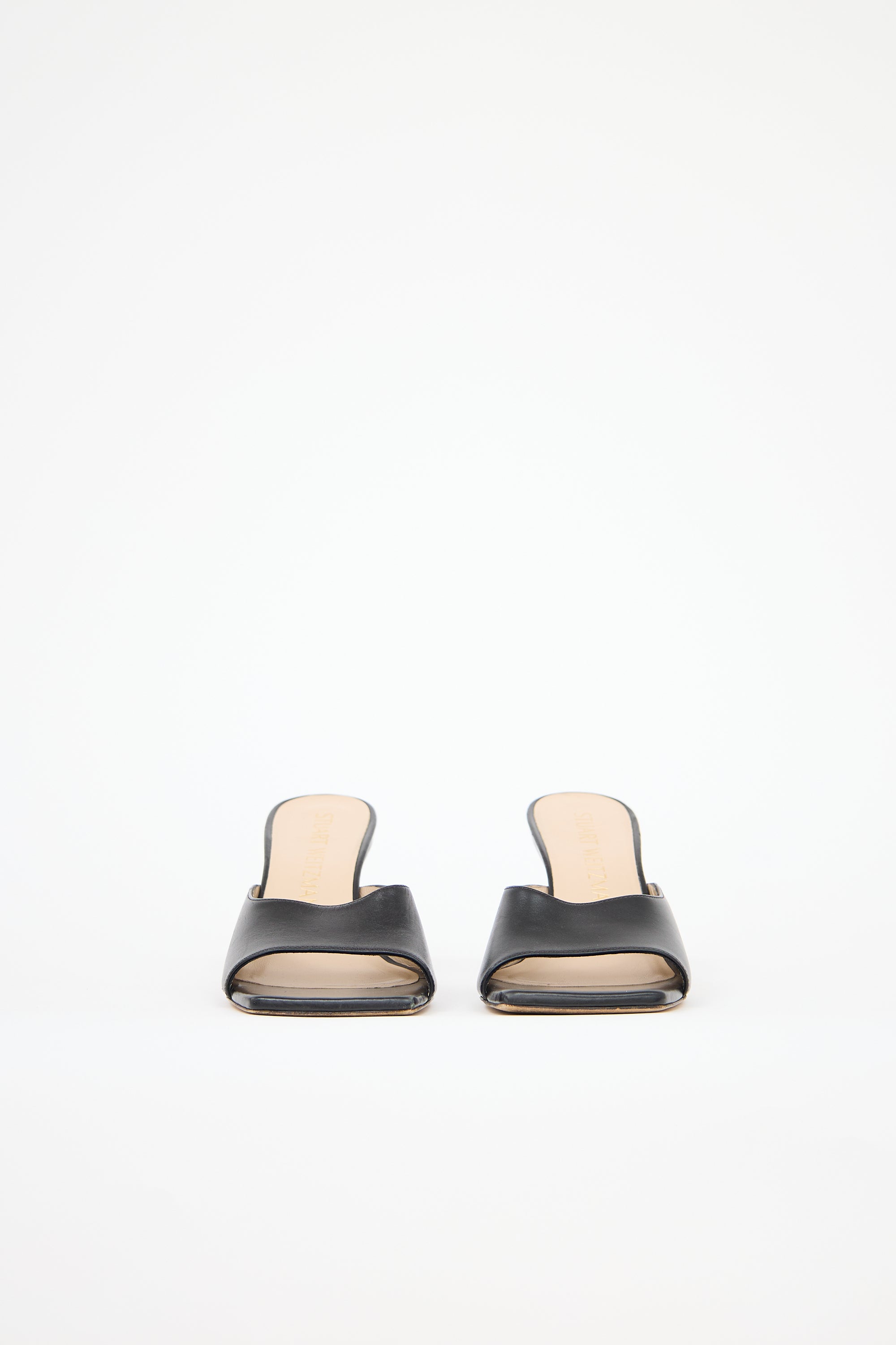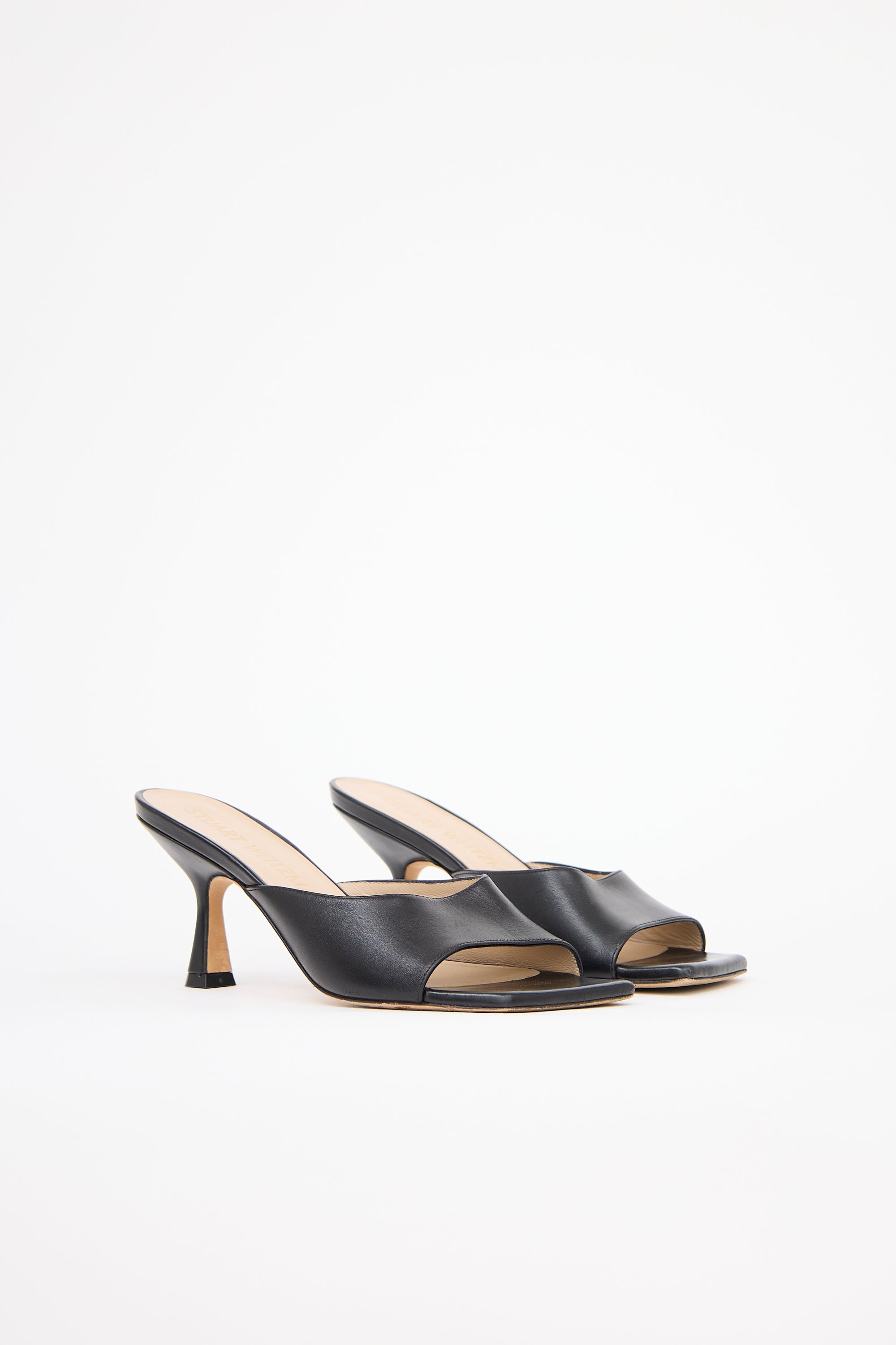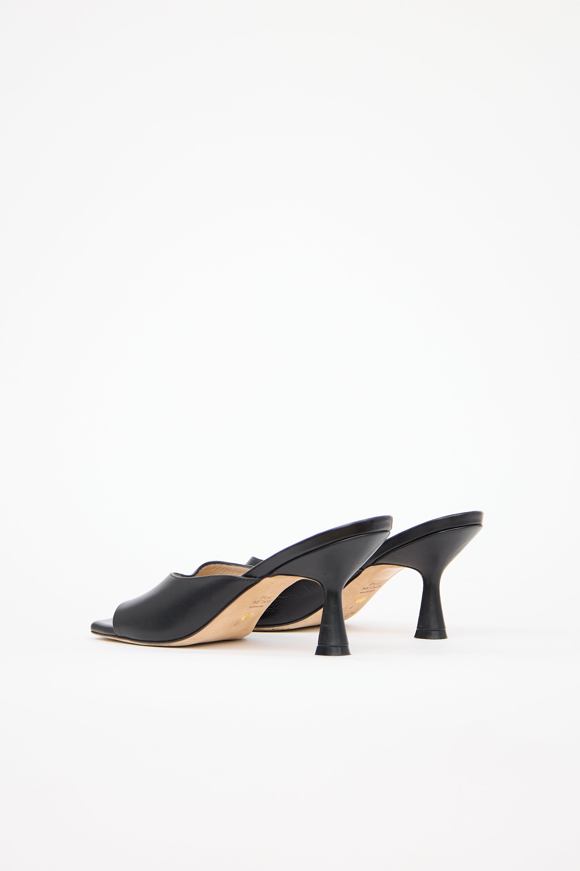 Pre-owned Stuart Weitzman black leather Tia 75 sandals featuring an open square toe, slip on entry, and covered spool heel. Comes with original dust bag.