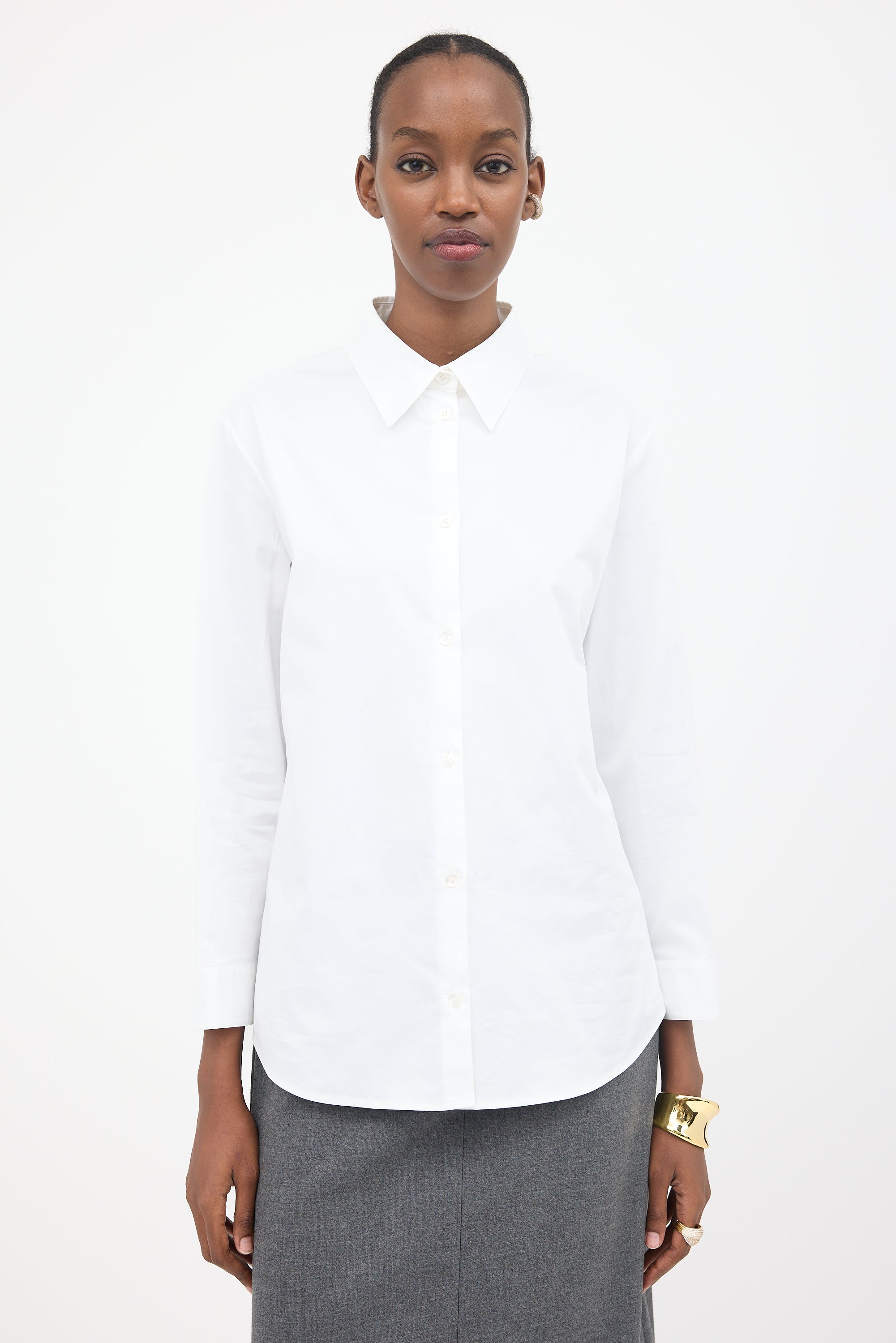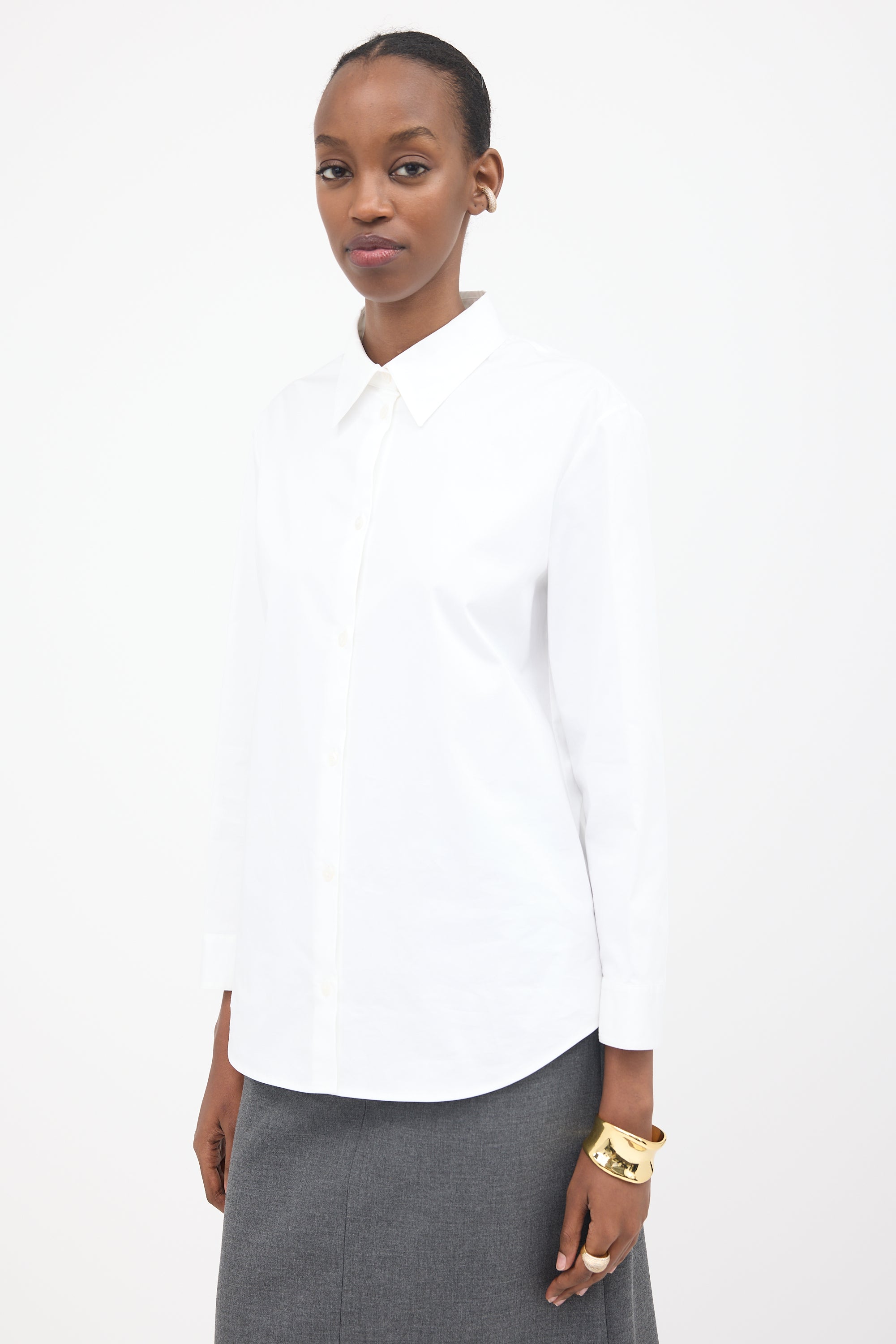 Pre-owned The Row white long sleeve Petra button down featuring pointed collar, exposed button front and buttoned cuffs.