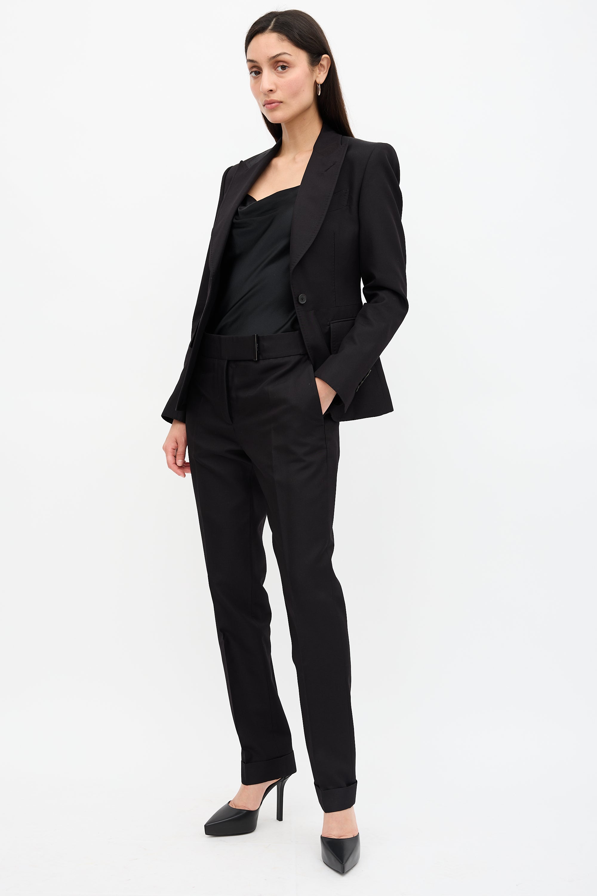 Pre-owned Tom Ford black wool and silk blend trousers featuring mid rise, adjustable waistband, four pocket styling, zip fly, slim leg, and cuffed hems. Lined.