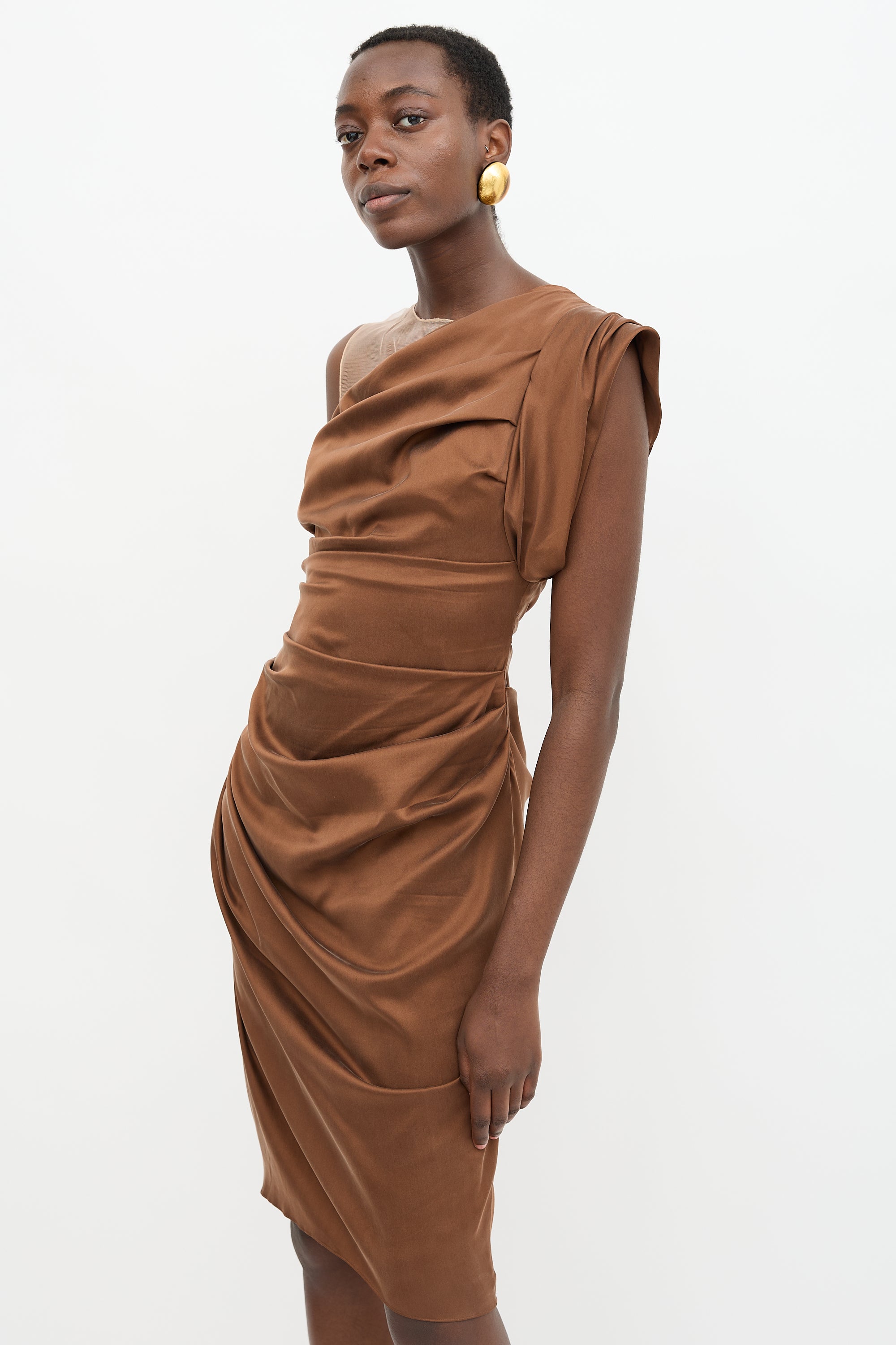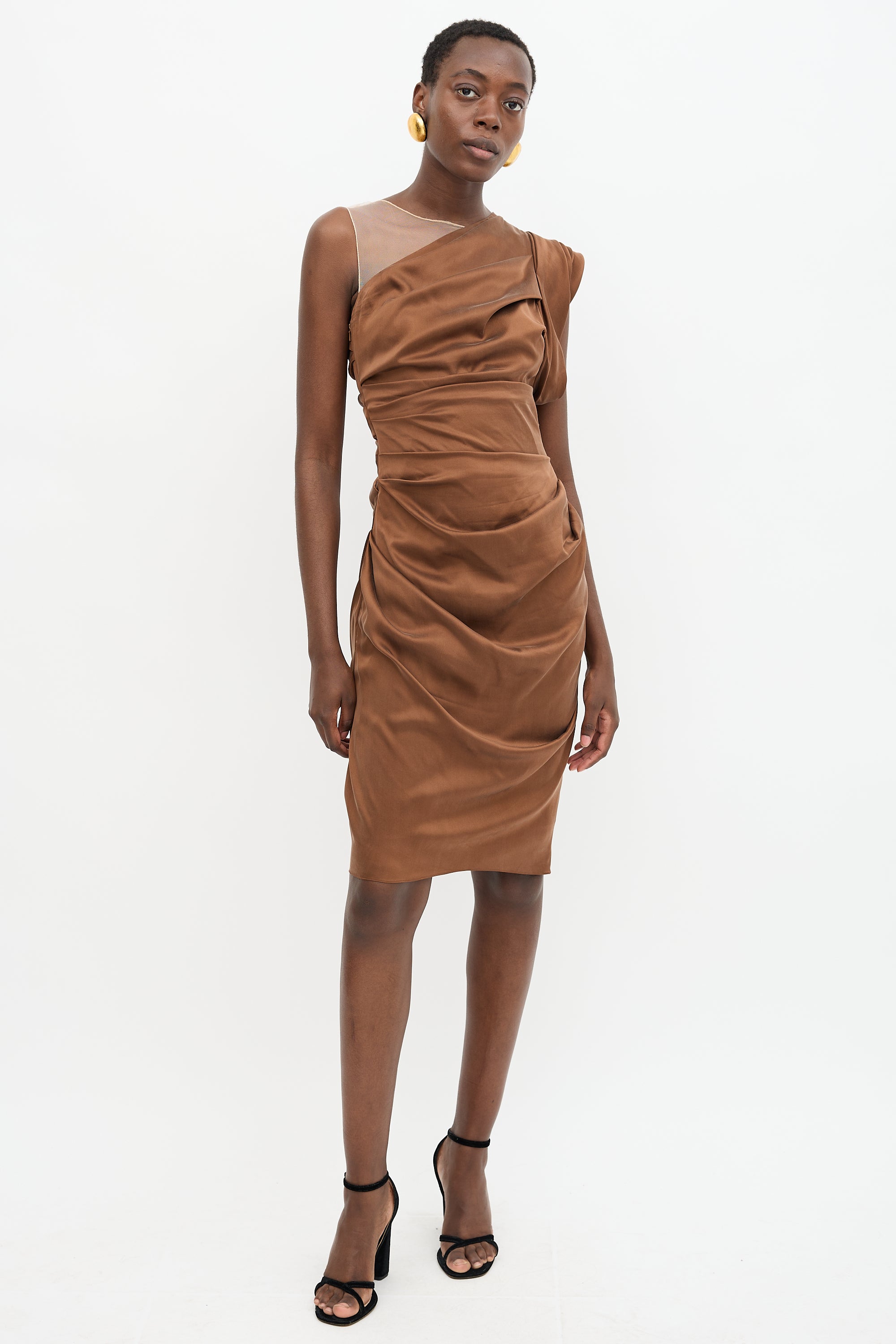 Pre-owned Vera Wang brown silk dress featuring one shoulder cap sleeve, draping throughout, beige mesh panel at right shoulder, and side zip closure. Lined.