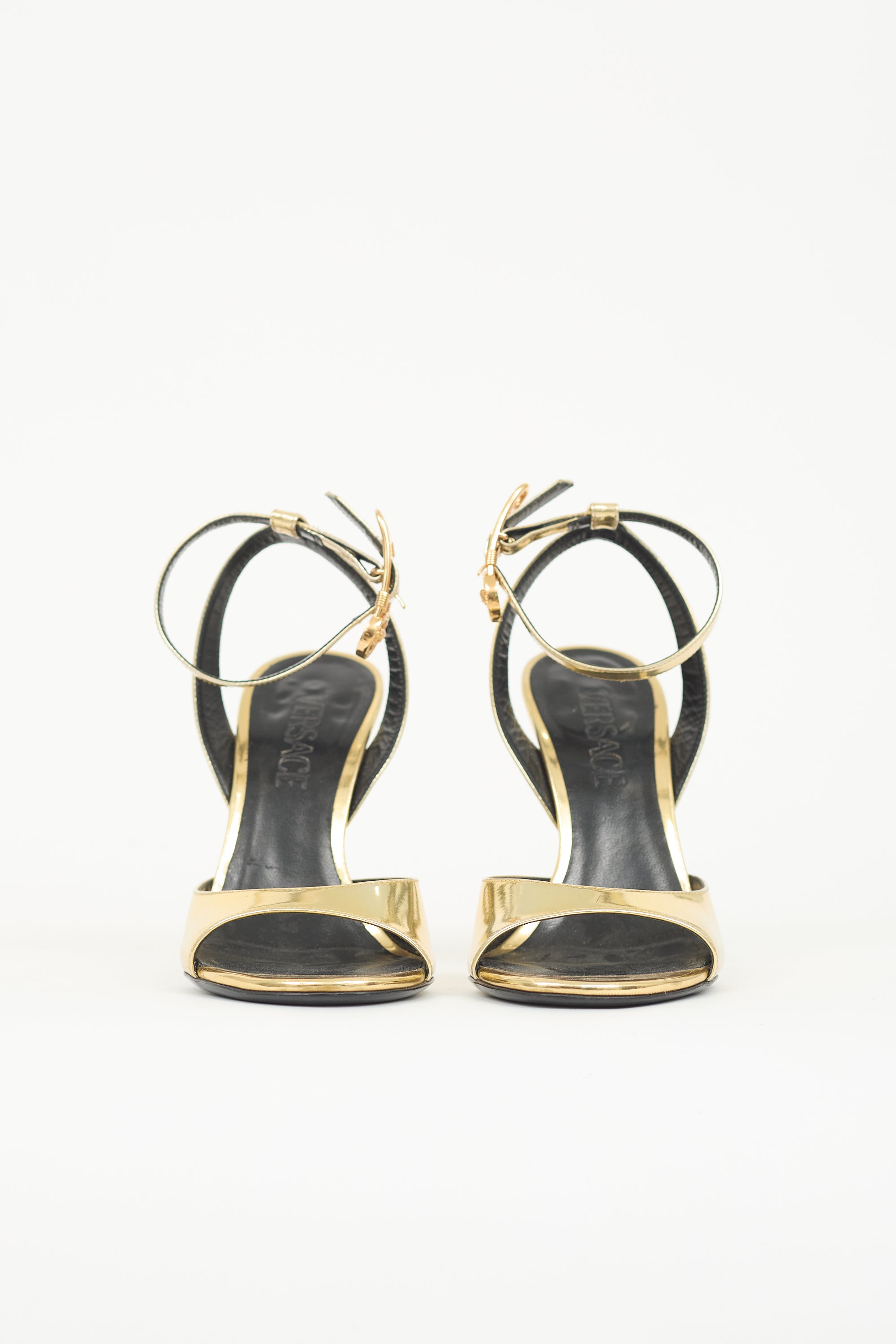 Pre-owned Versace gold metallic leather sandals featuring an open rounded toe, strap across vamp, adjustable strap at ankle with gold tone Medusa embellished safety pin hardware, and a covered stiletto heel.