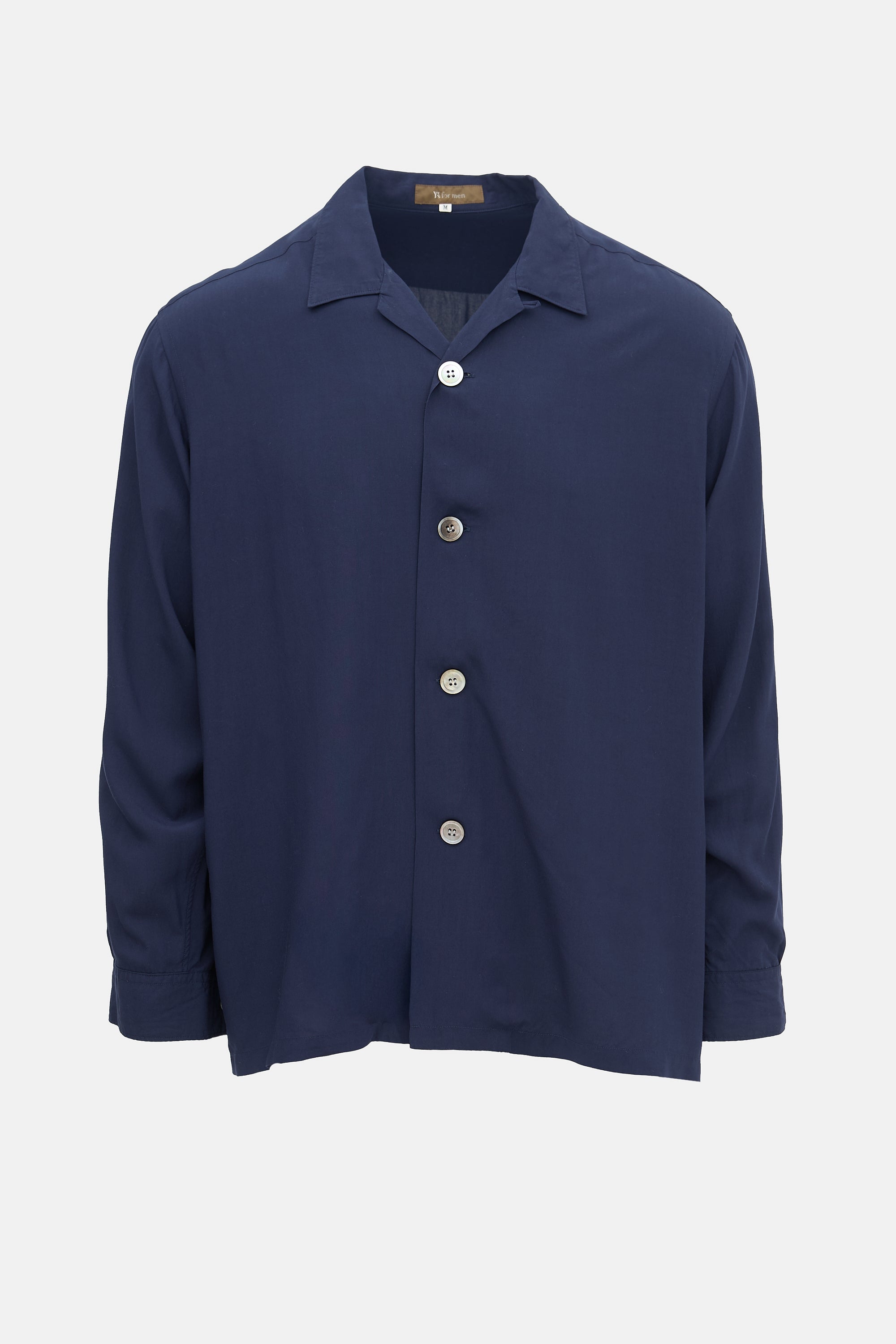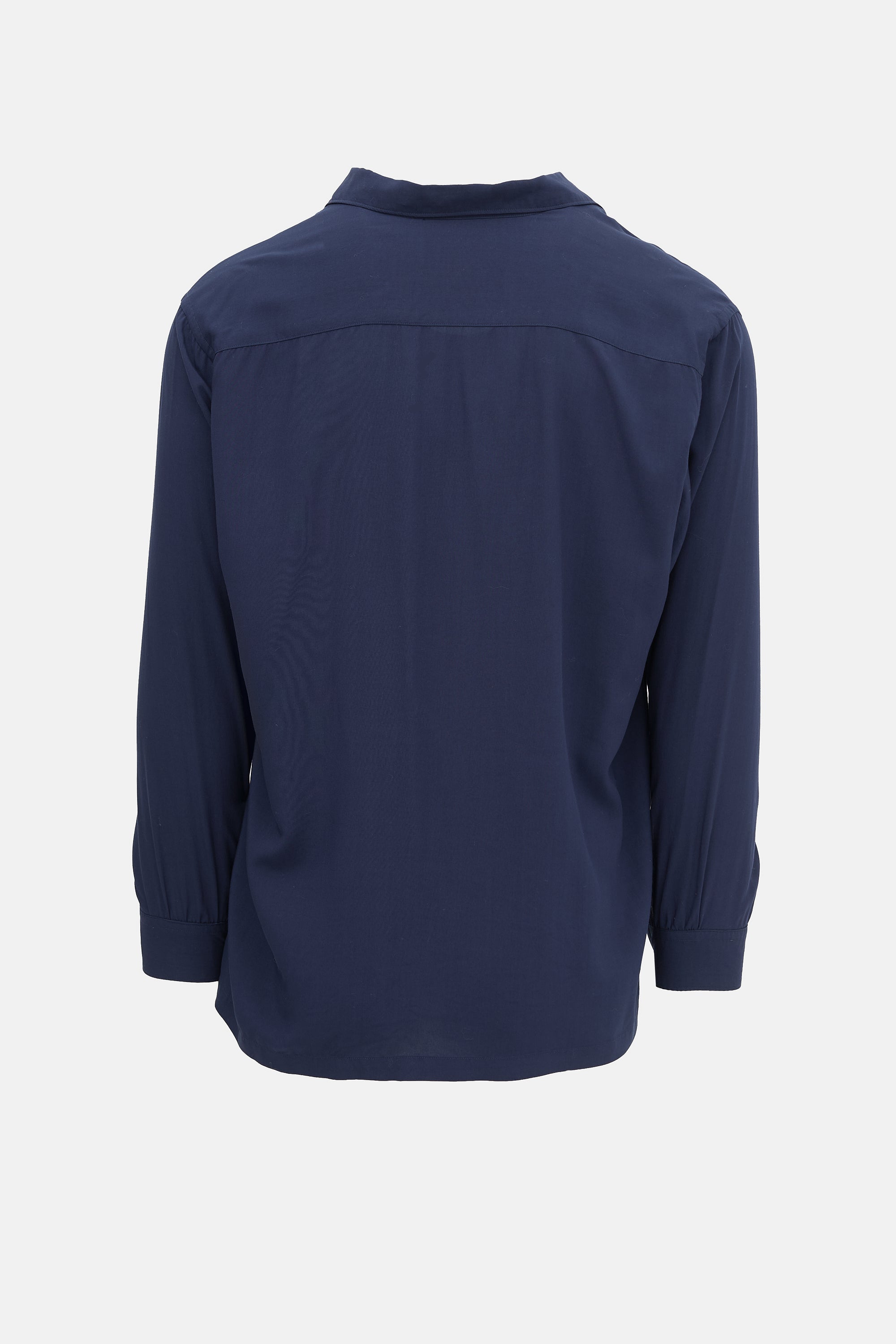 Pre-owned Y's For Men navy rayon shirt featuring convertible collar, button up front, side vents, and buttoned cuffs.