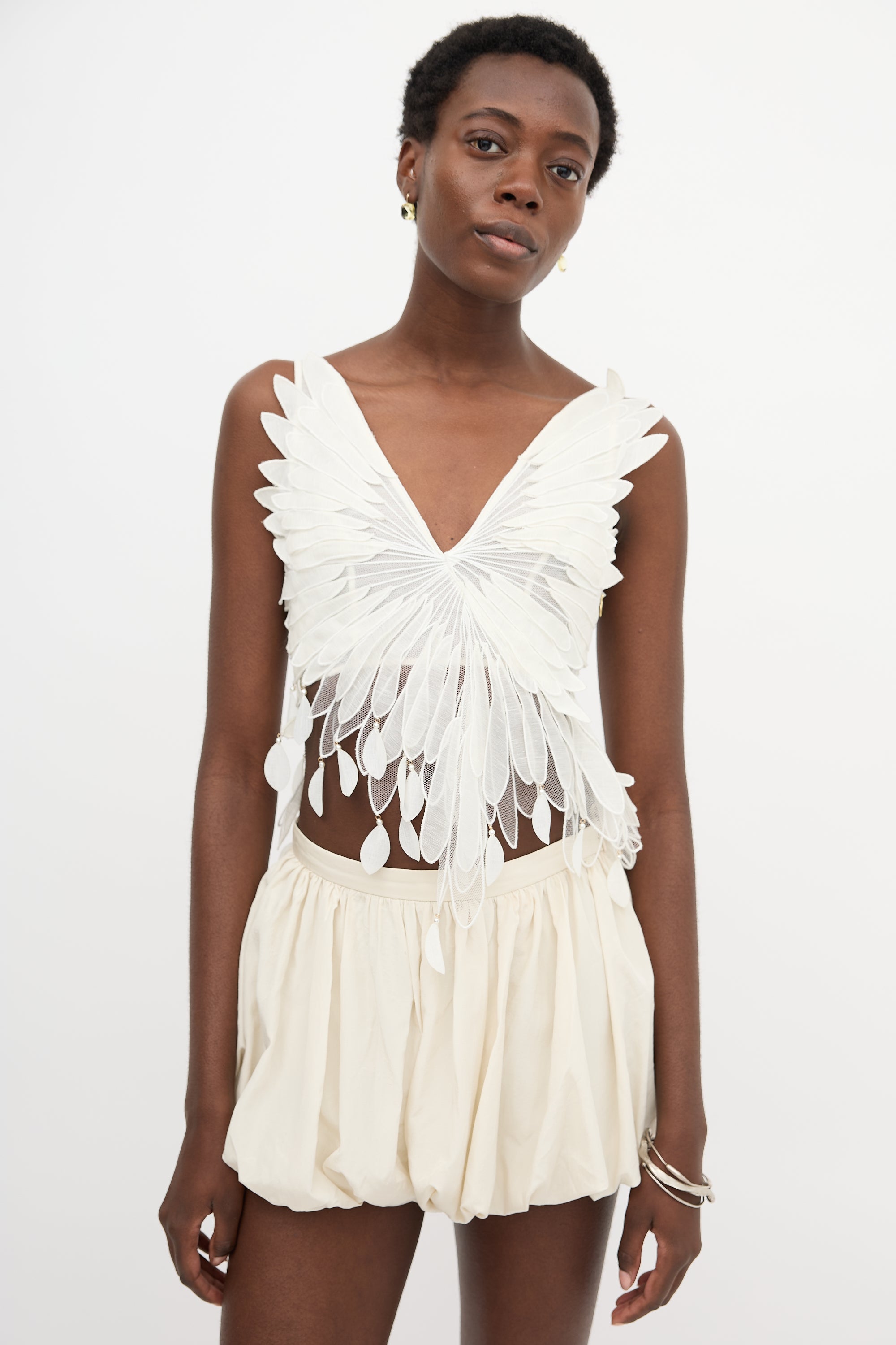 Pre-owned Zimmermann white Rhythmic Embroidered top featuring V-neckline, feather applique with faux pearl beads, and side zip closure.
