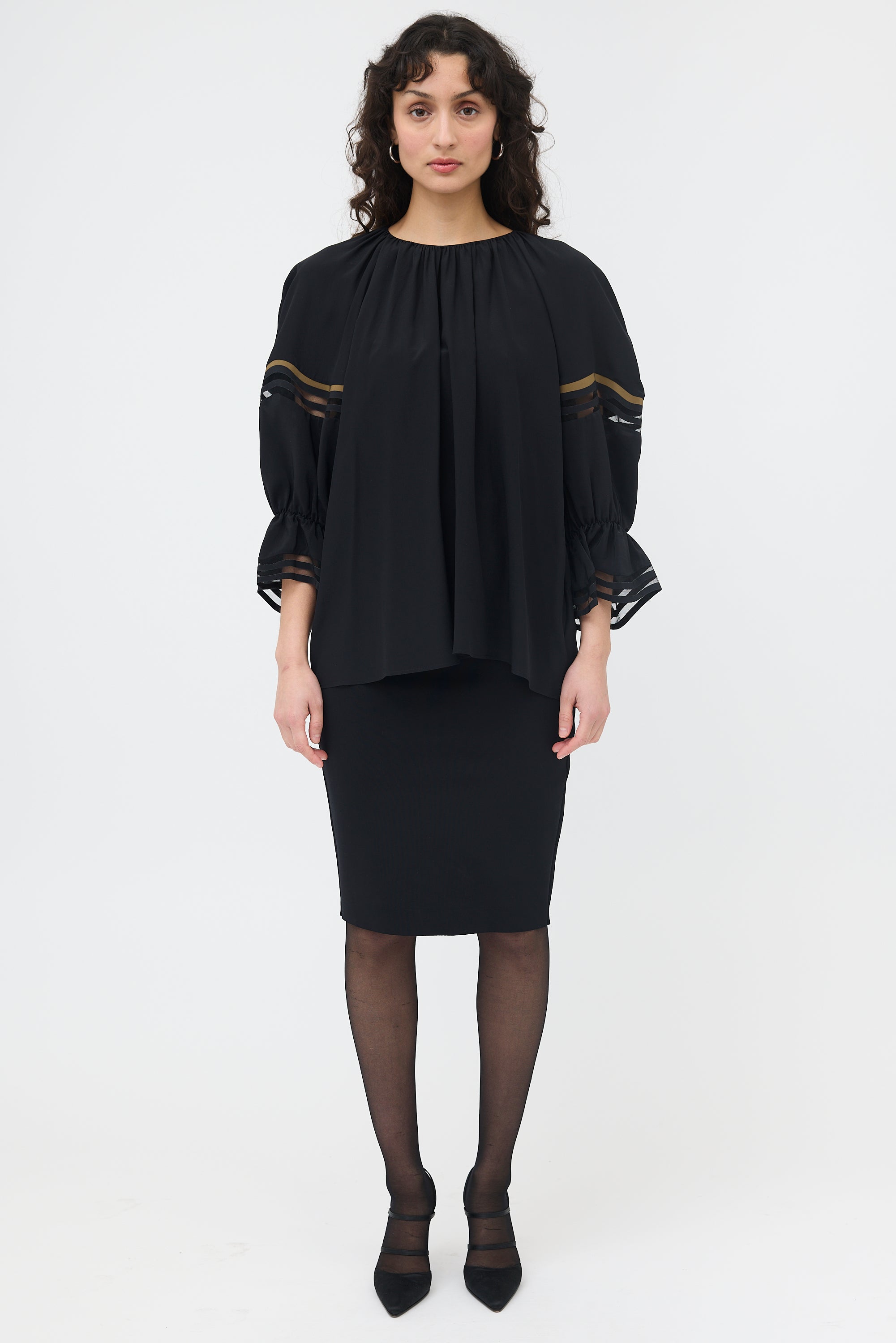 Pre-owned Fendi black silk top featuring a gathered round neckline, cutout back collar with button fastening, half length puff sleeves with brown and tonal mesh stripes, and ruffle cuffs.