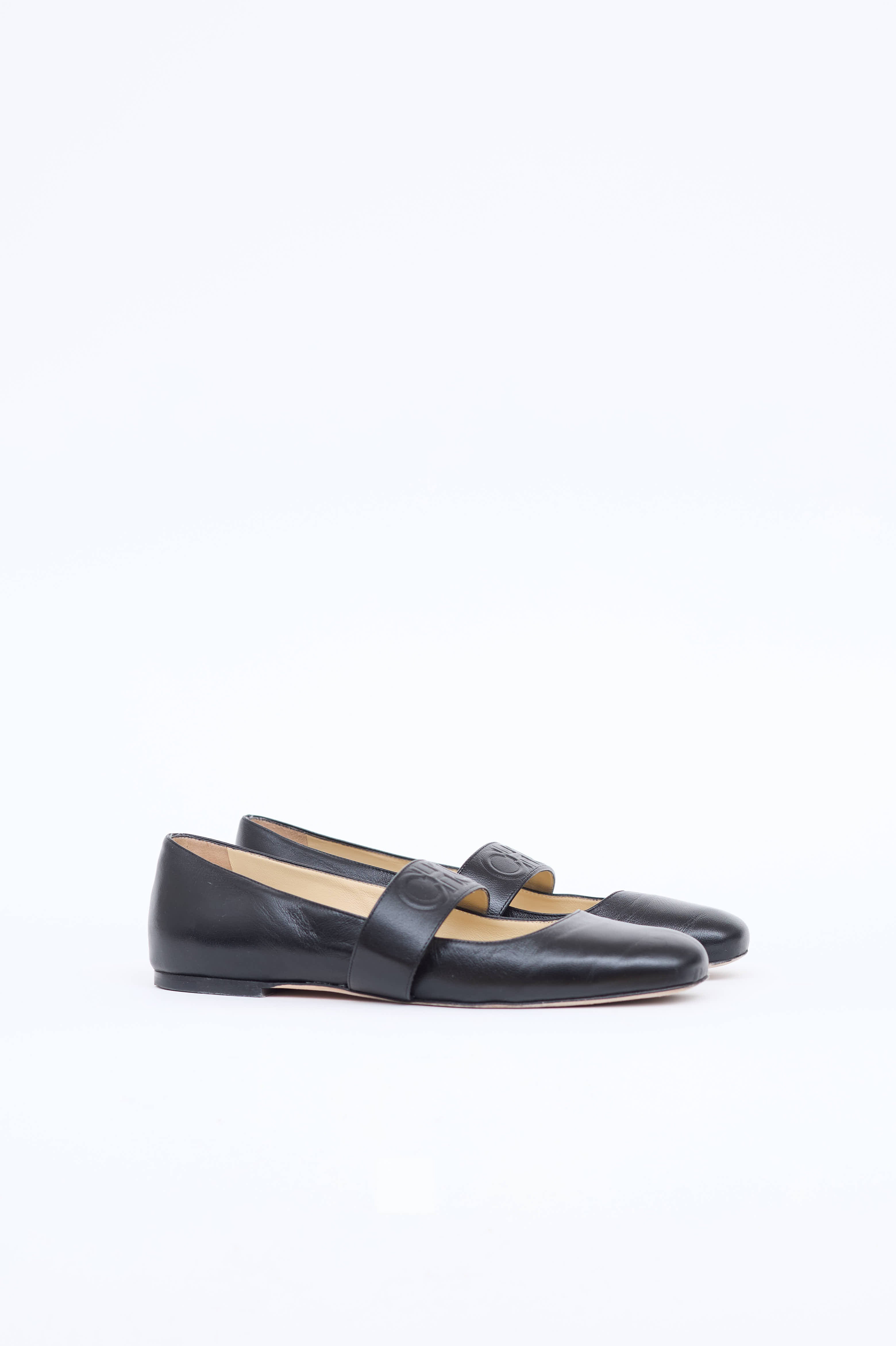 Pre-owned Jimmy Choo black ballet flats featuring a square toe slip on entry, leather uppers, elasticized strap at instep with embossed logo text, and short stacked heel.