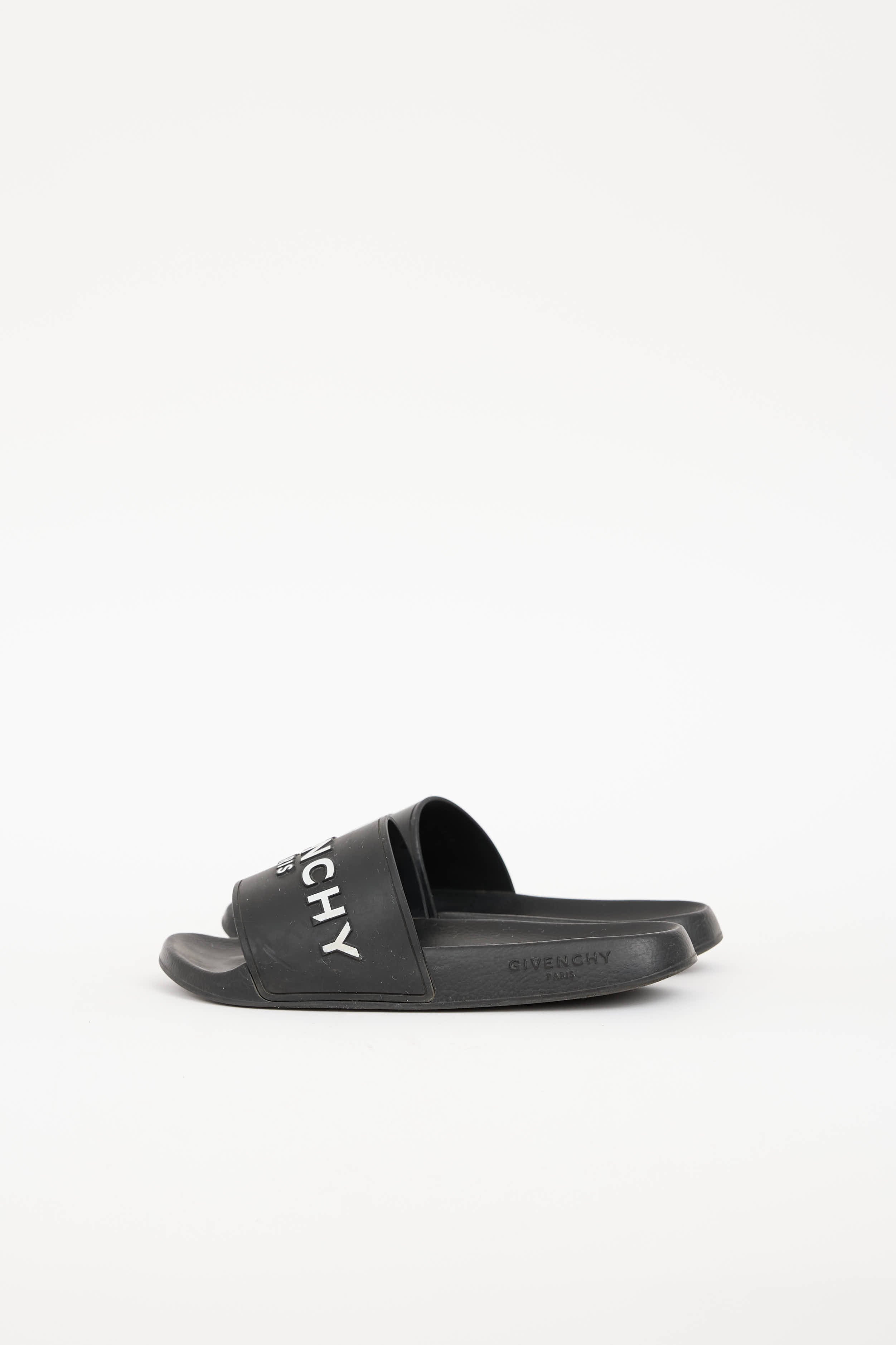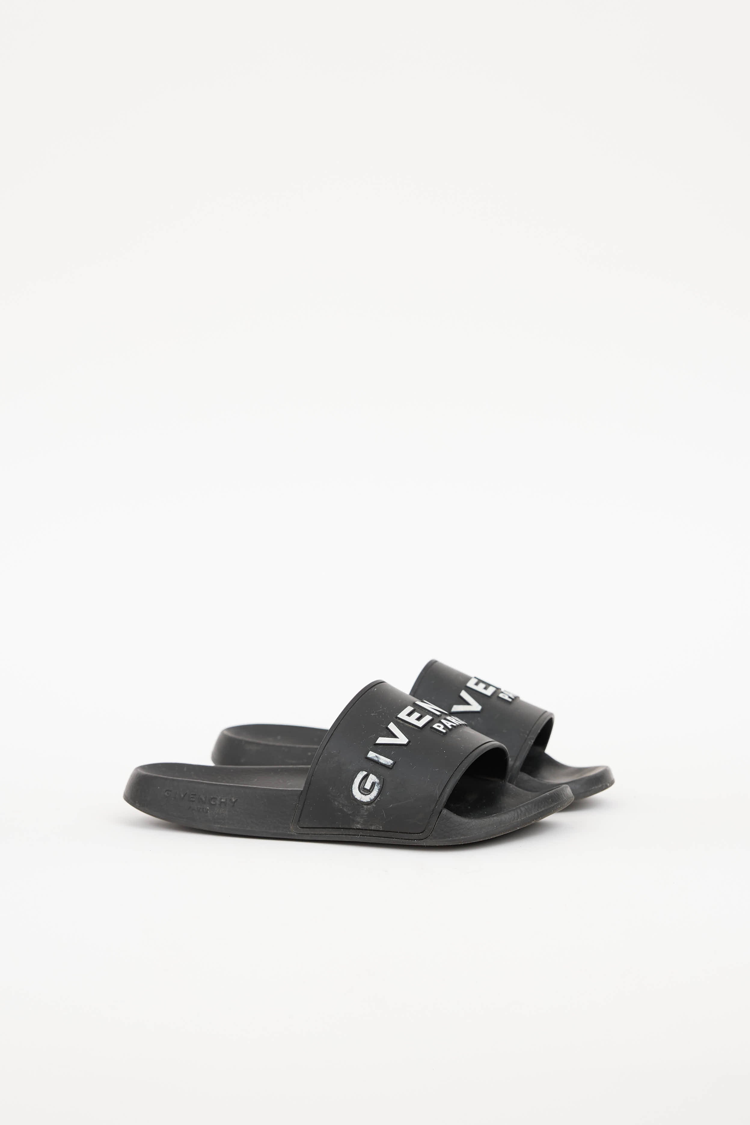 Pre-owned Givenchy kids black logo slide featuring round toe, logo strap at vamp and embossed logo at midsole.