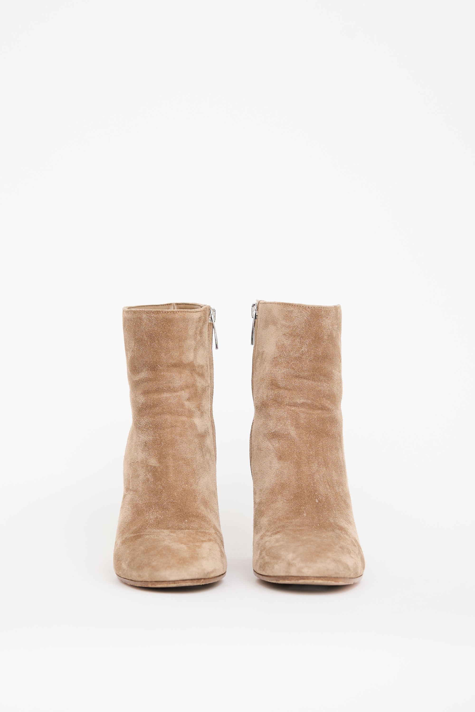 Pre-owned Gianvito Rossi beige suede ankle boots featuring rounded toe, inner zip closure, and covered block heel.