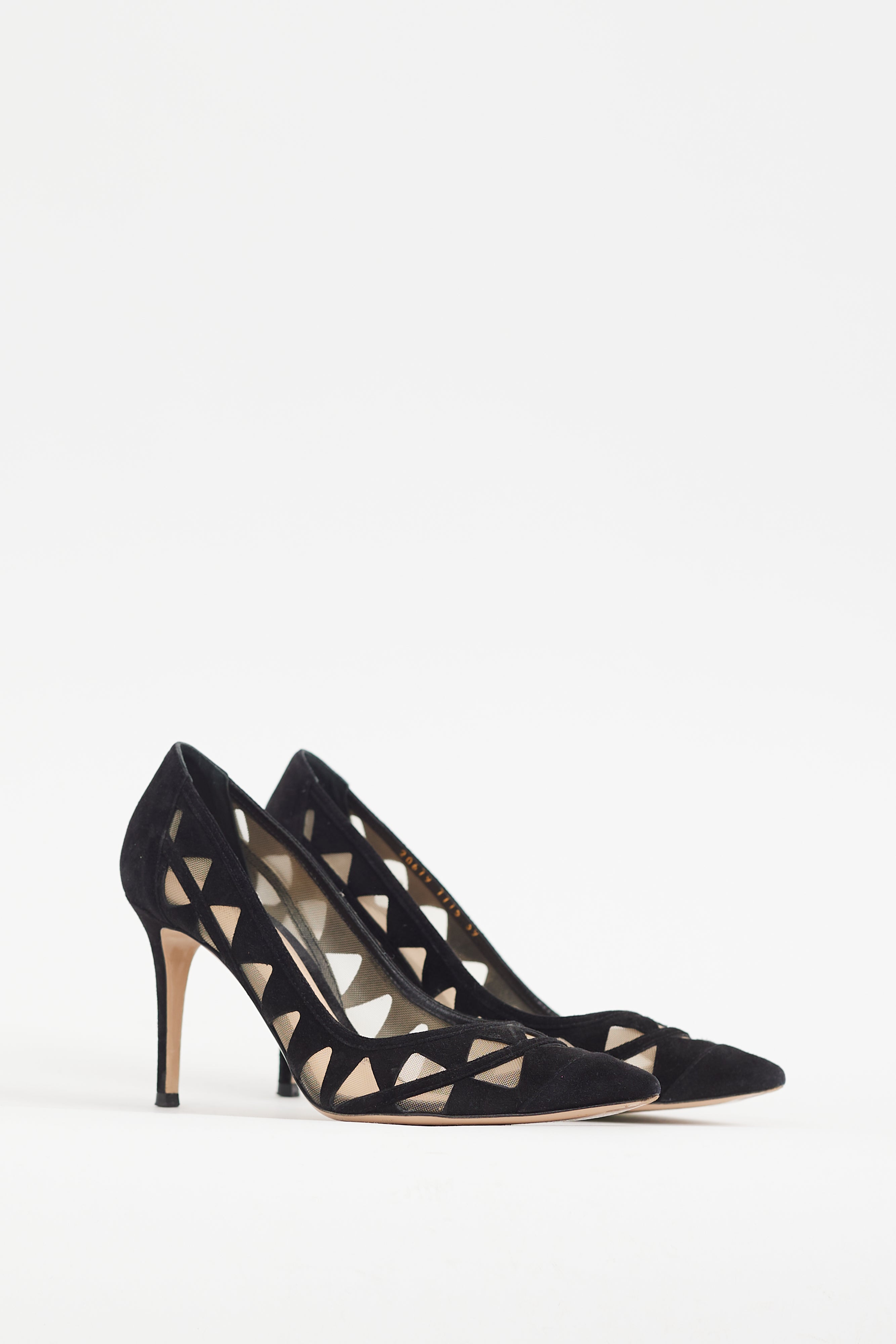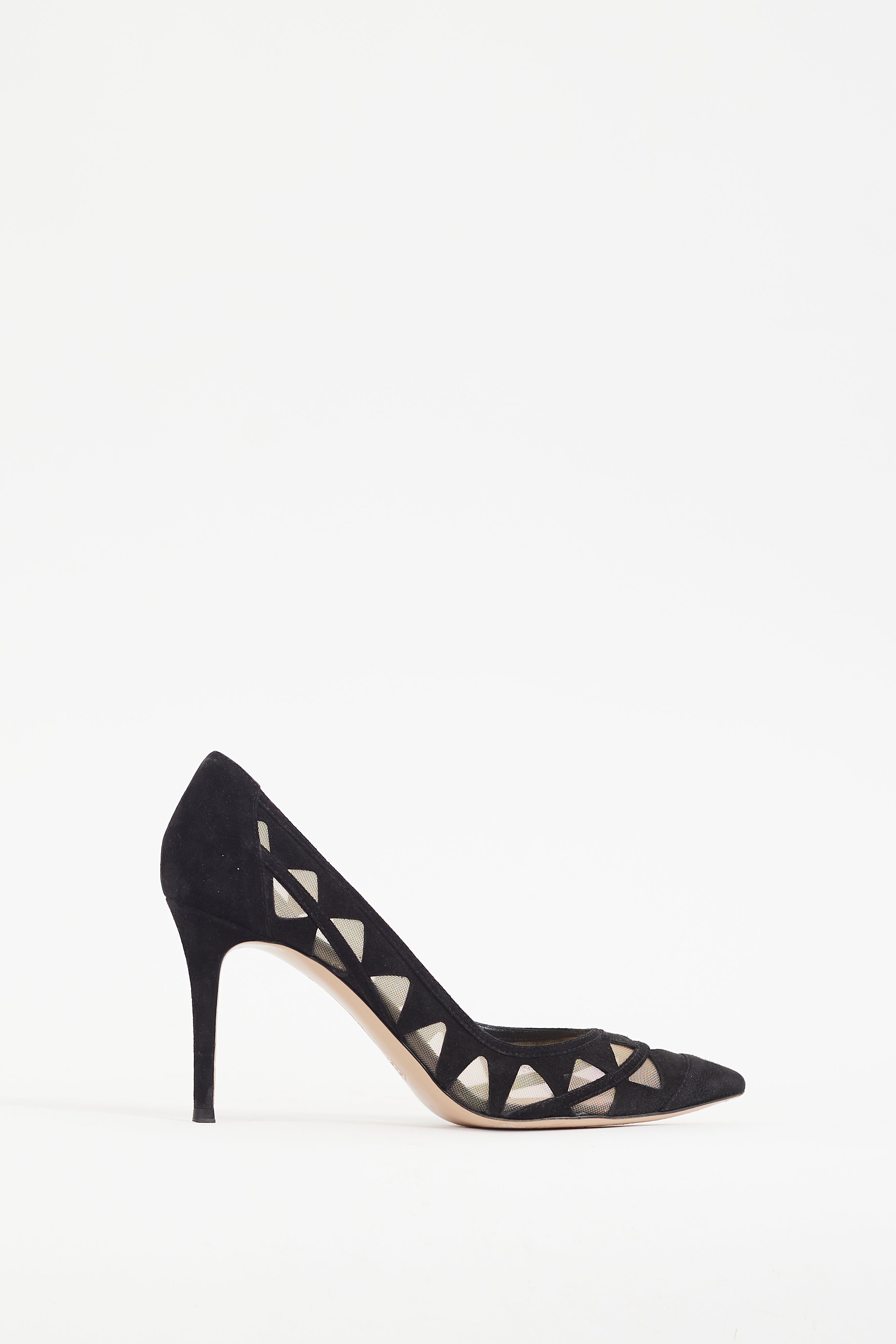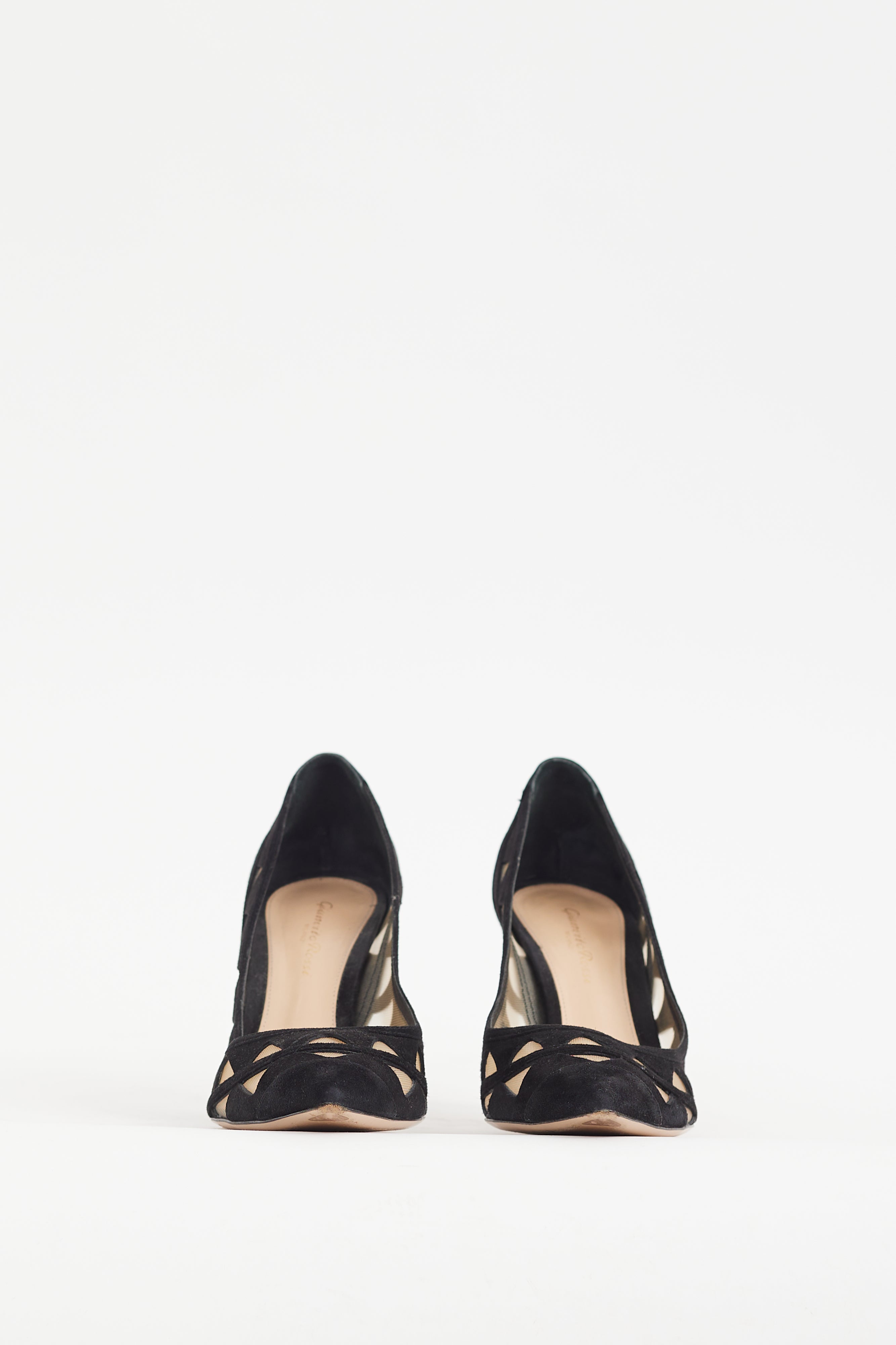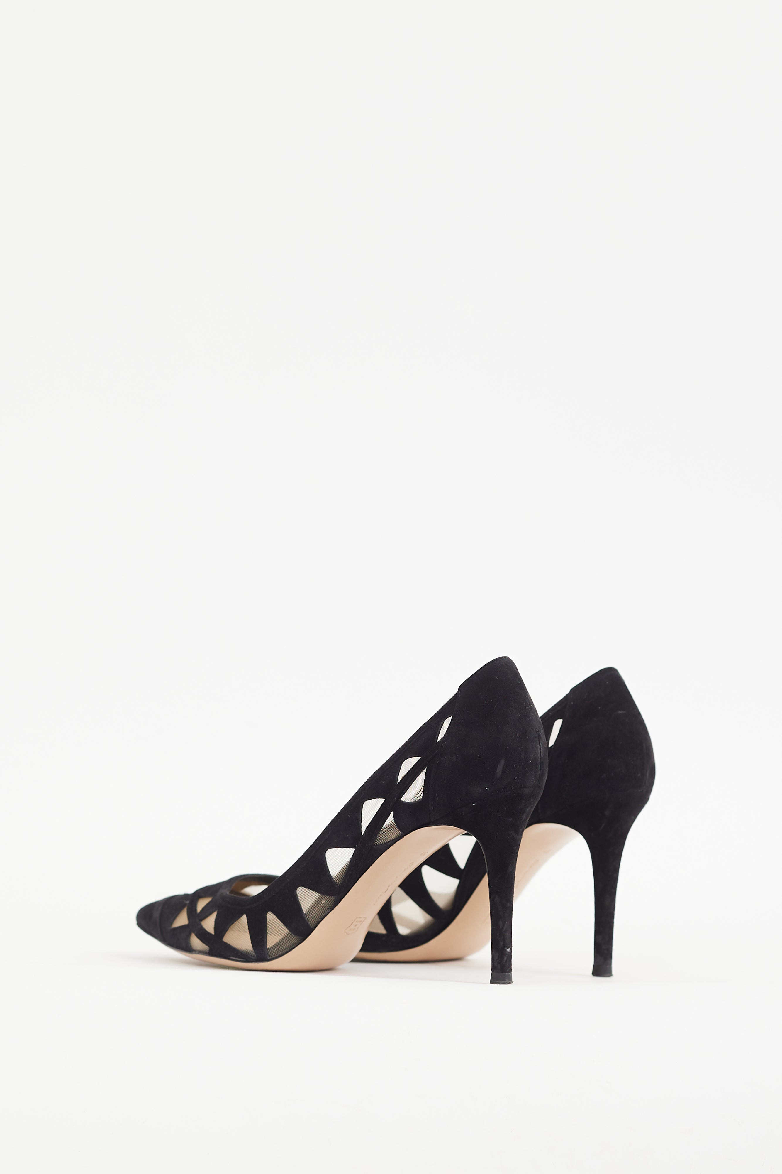 Pre-owned Gianvito Rossi Maxine pumps featuring a pointed toe, black suede uppers, triangle laser cuts throughout with mesh insert, and a stiletto heel.
