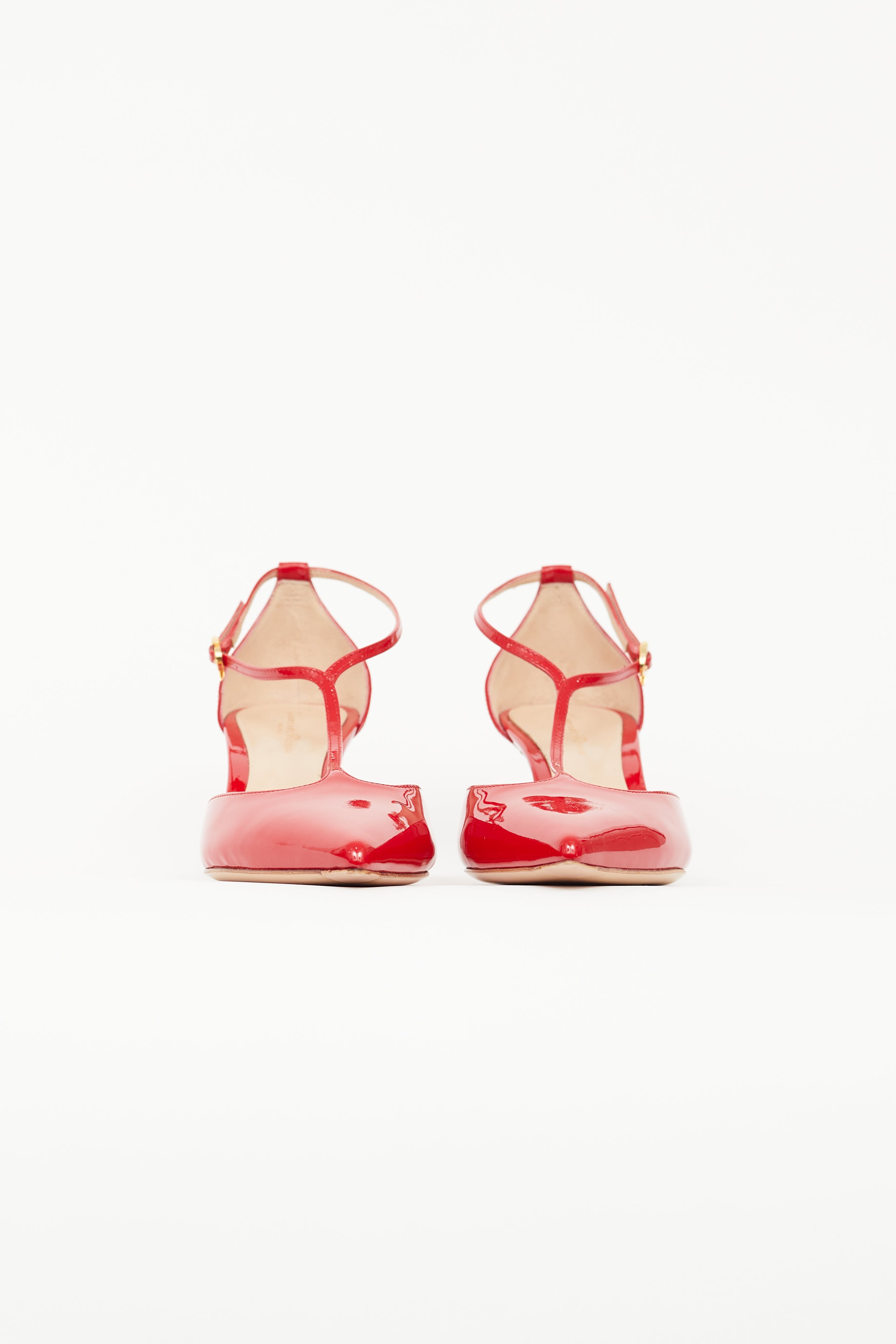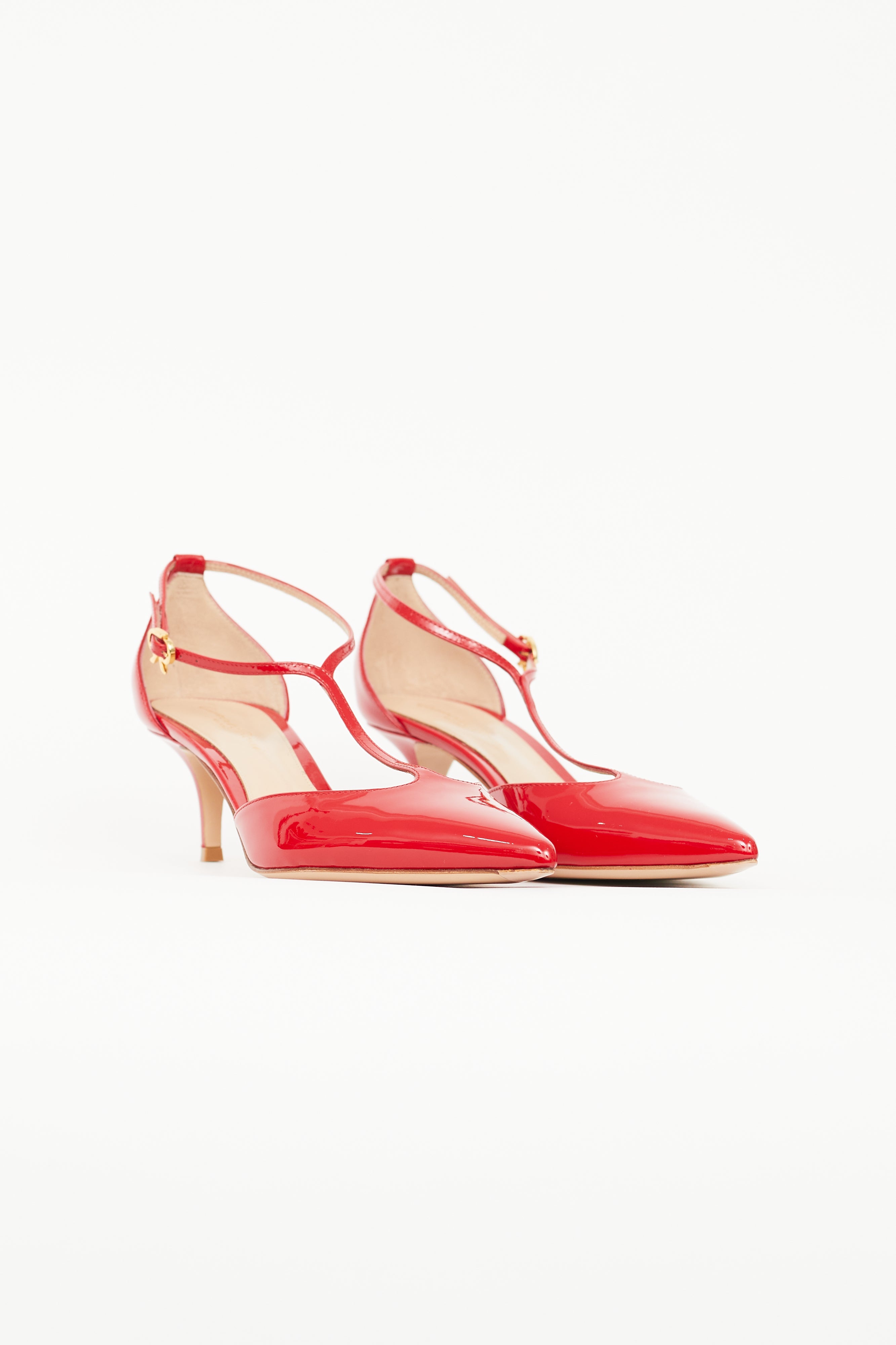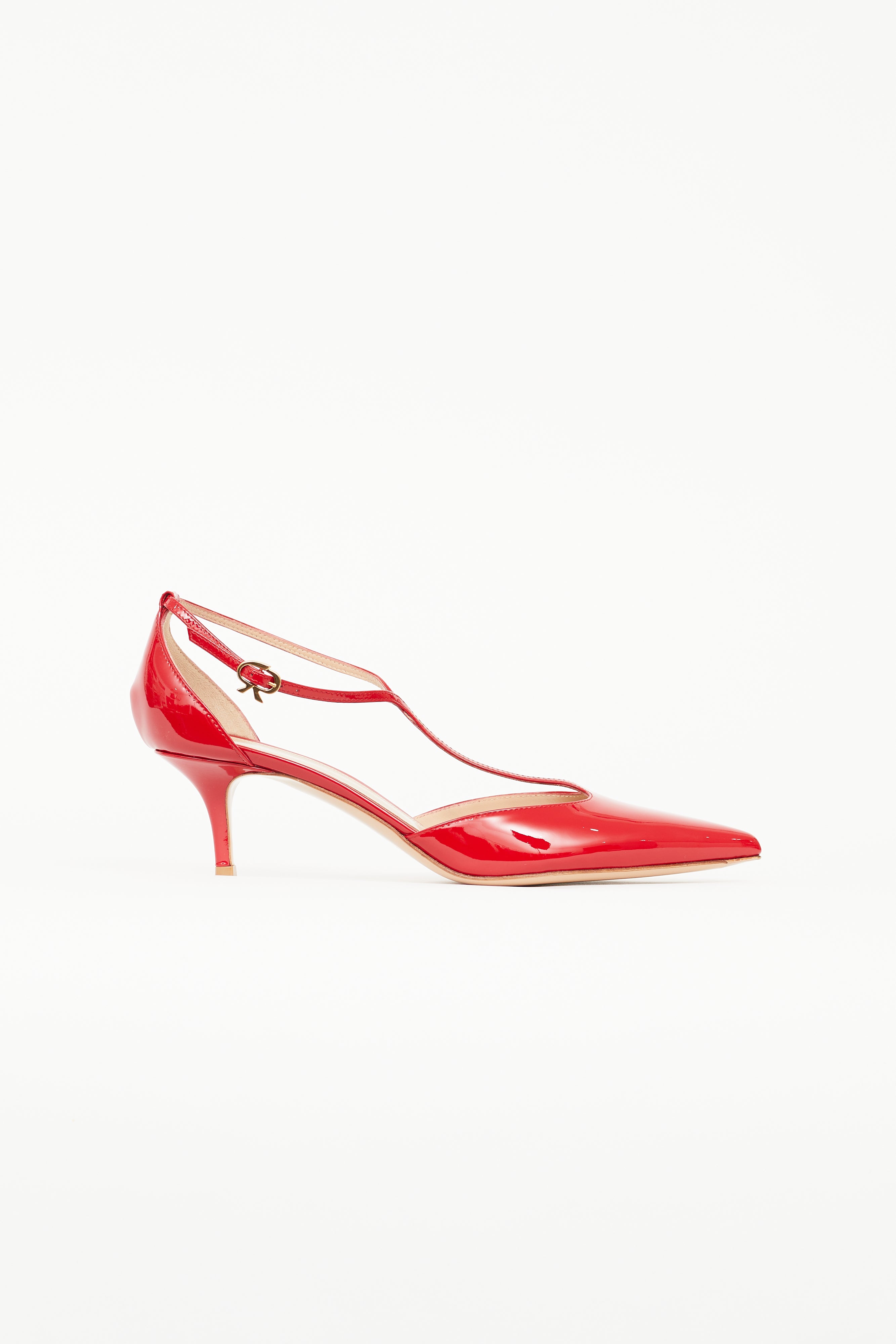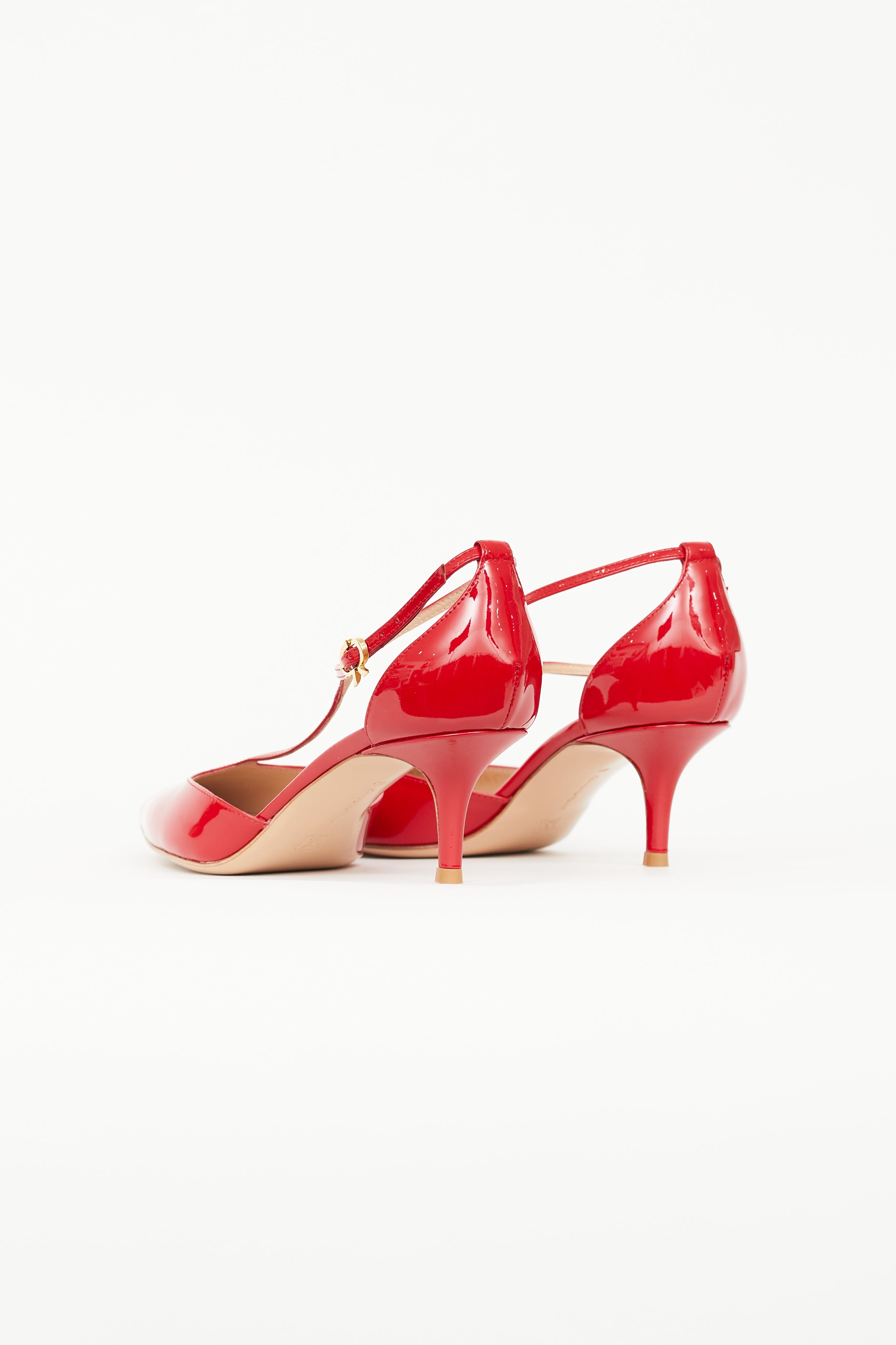 Pre-owned Gianvito Rossi red Ribbon T-Bar heels featuring pointed toe, T-strap, ankle strap with buckle fastening, and covered kitten heel.