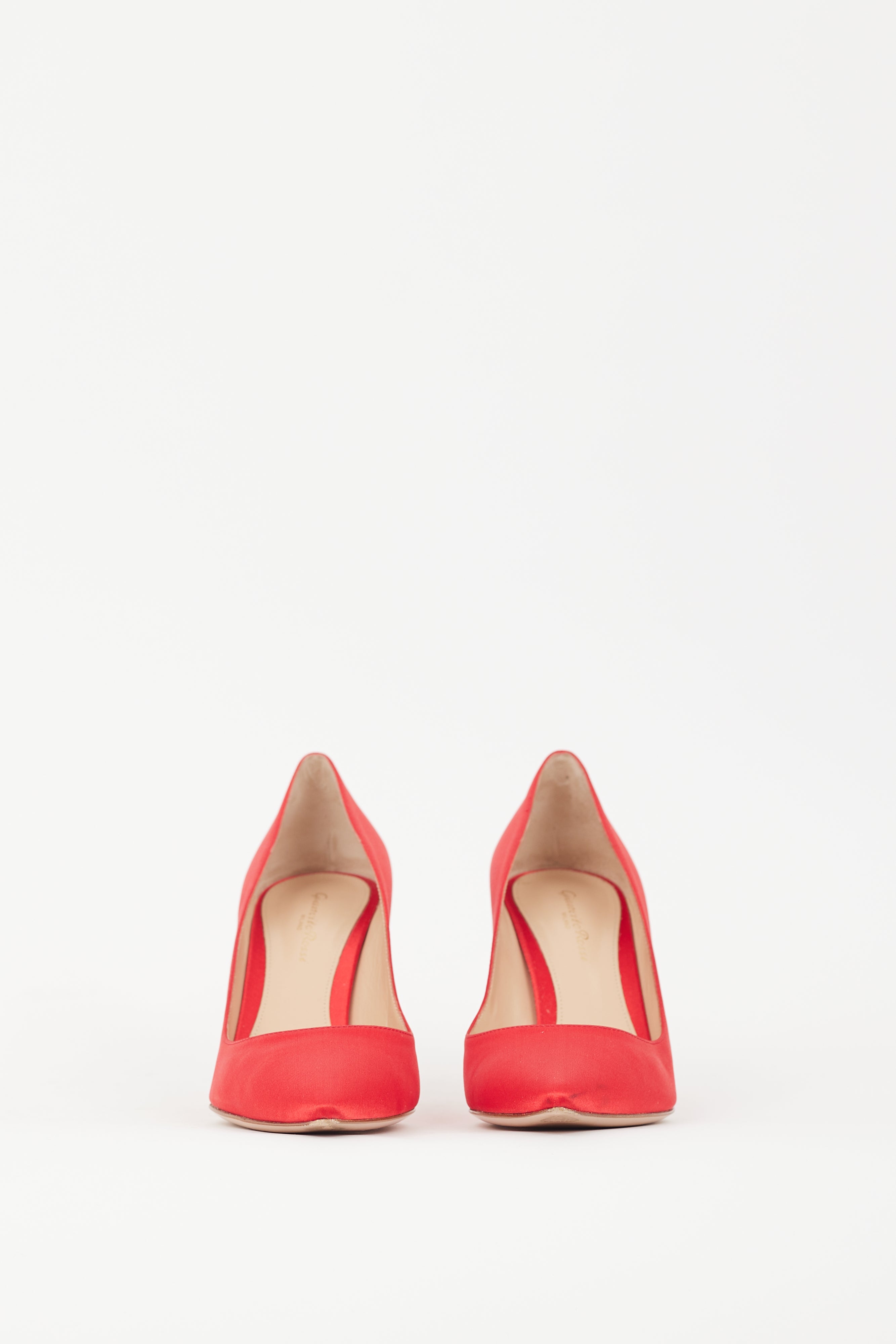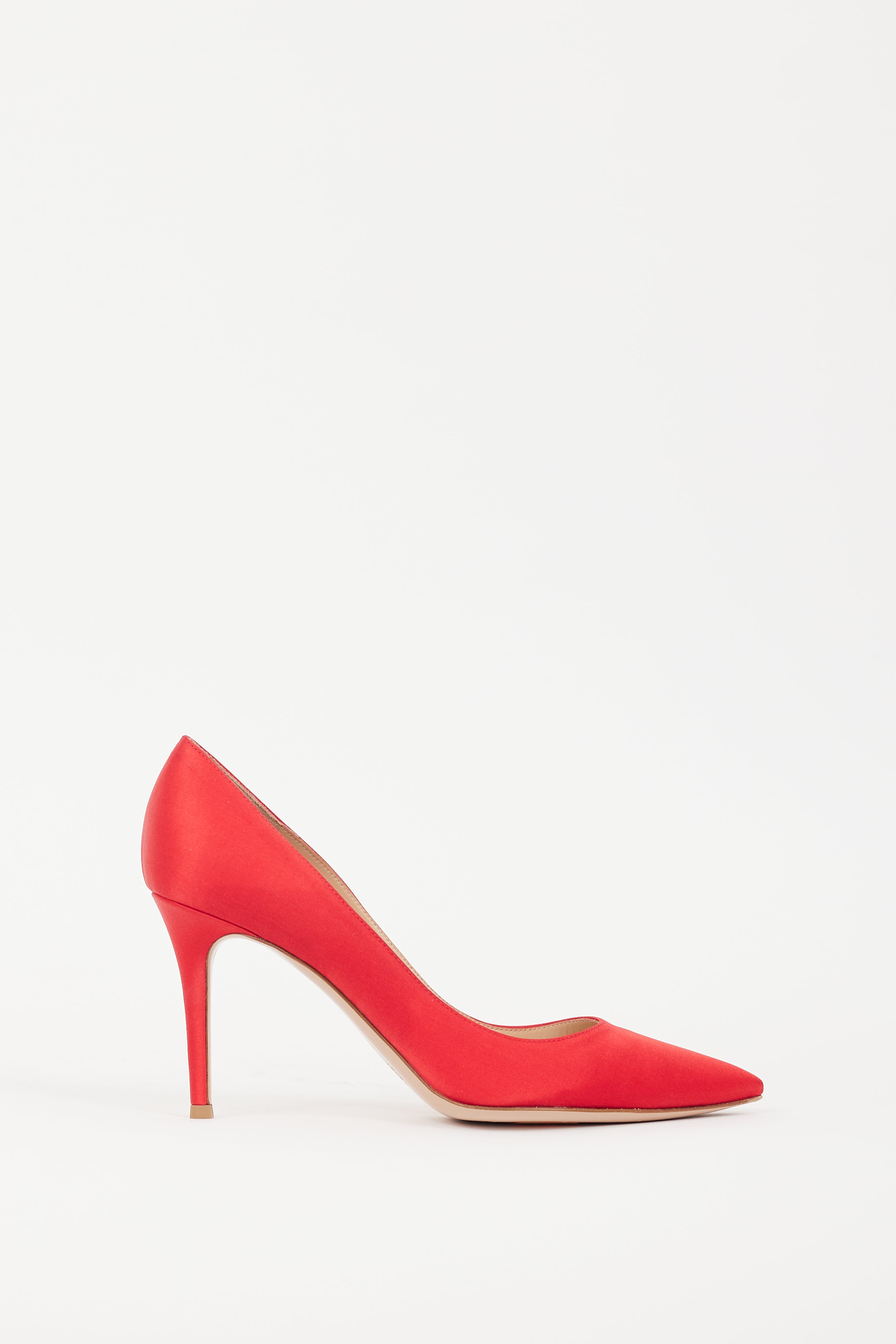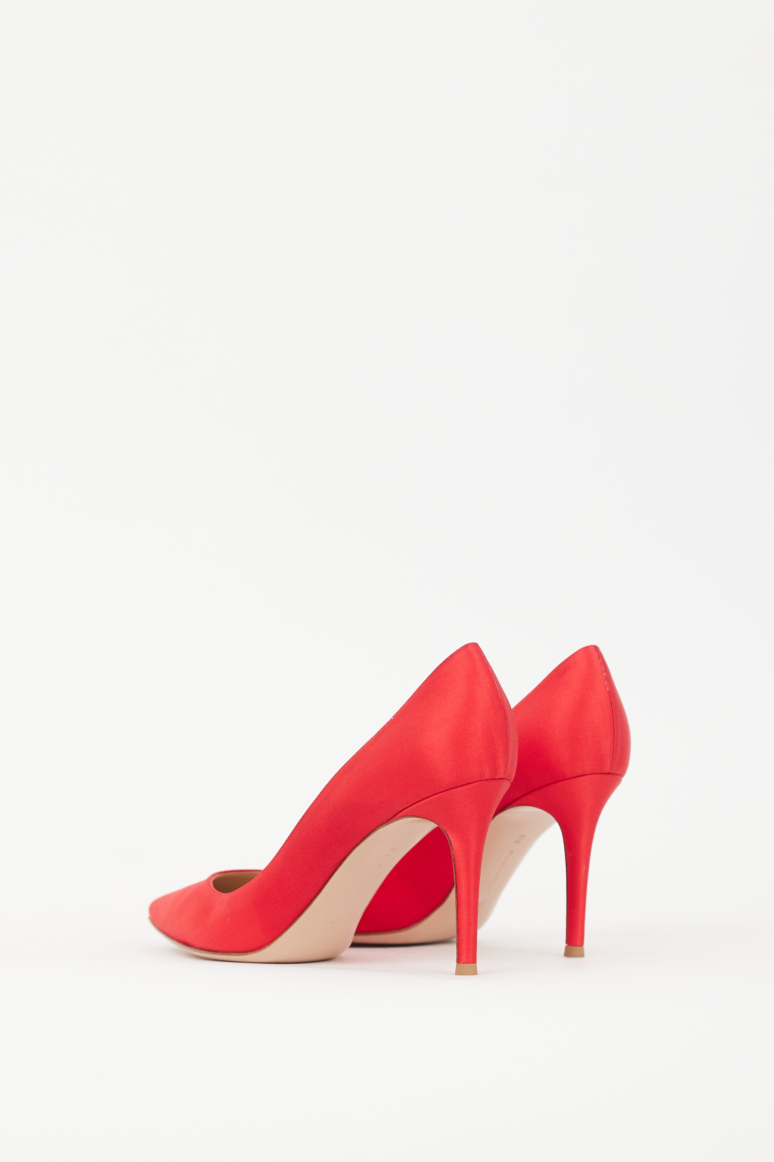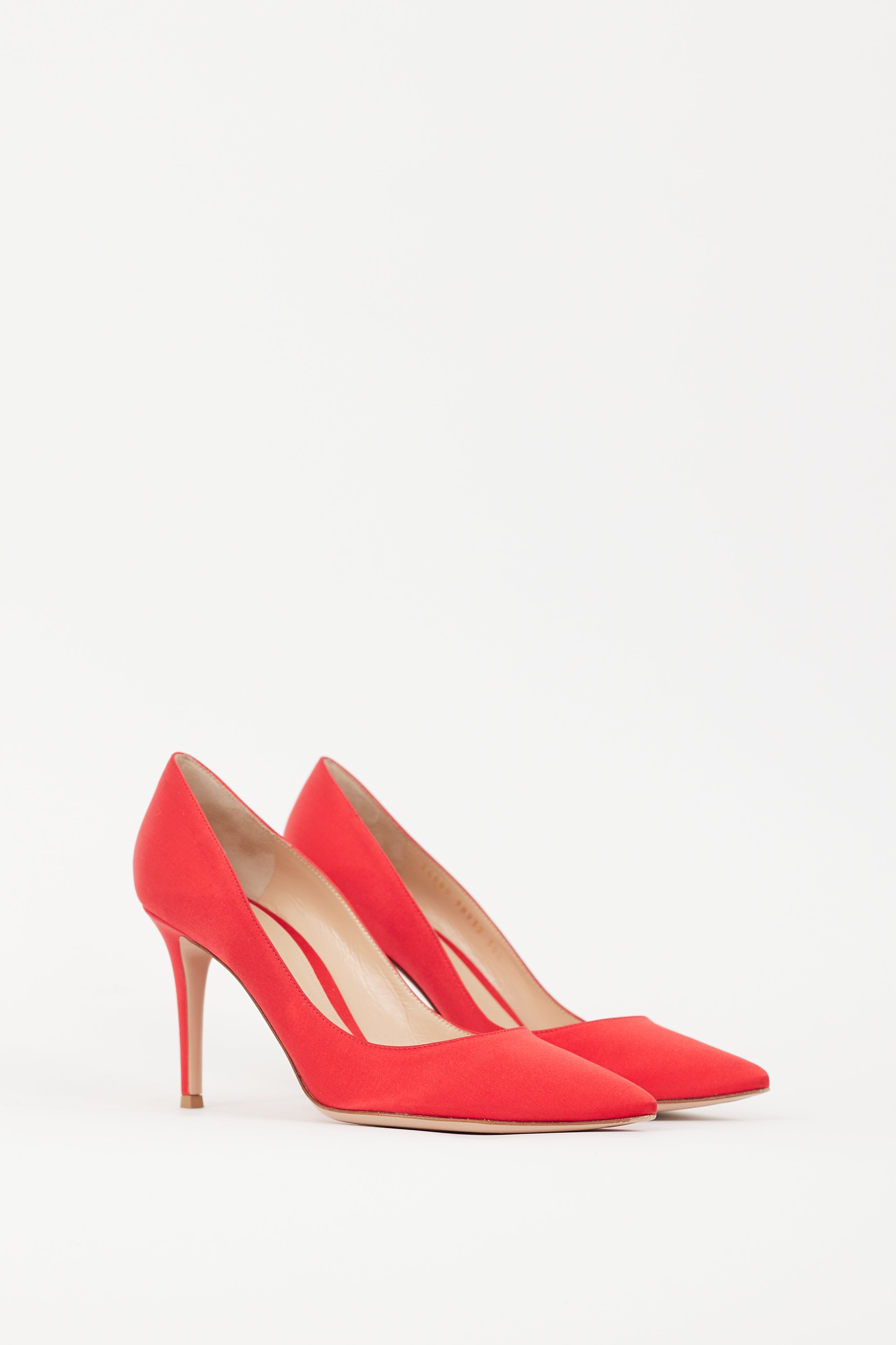 Pre-owned Gianvito Rossi red 85 pumps featuring satin upper, pointed toe, slip on entry, and covered stiletto heel. Comes with original dust bag and box.