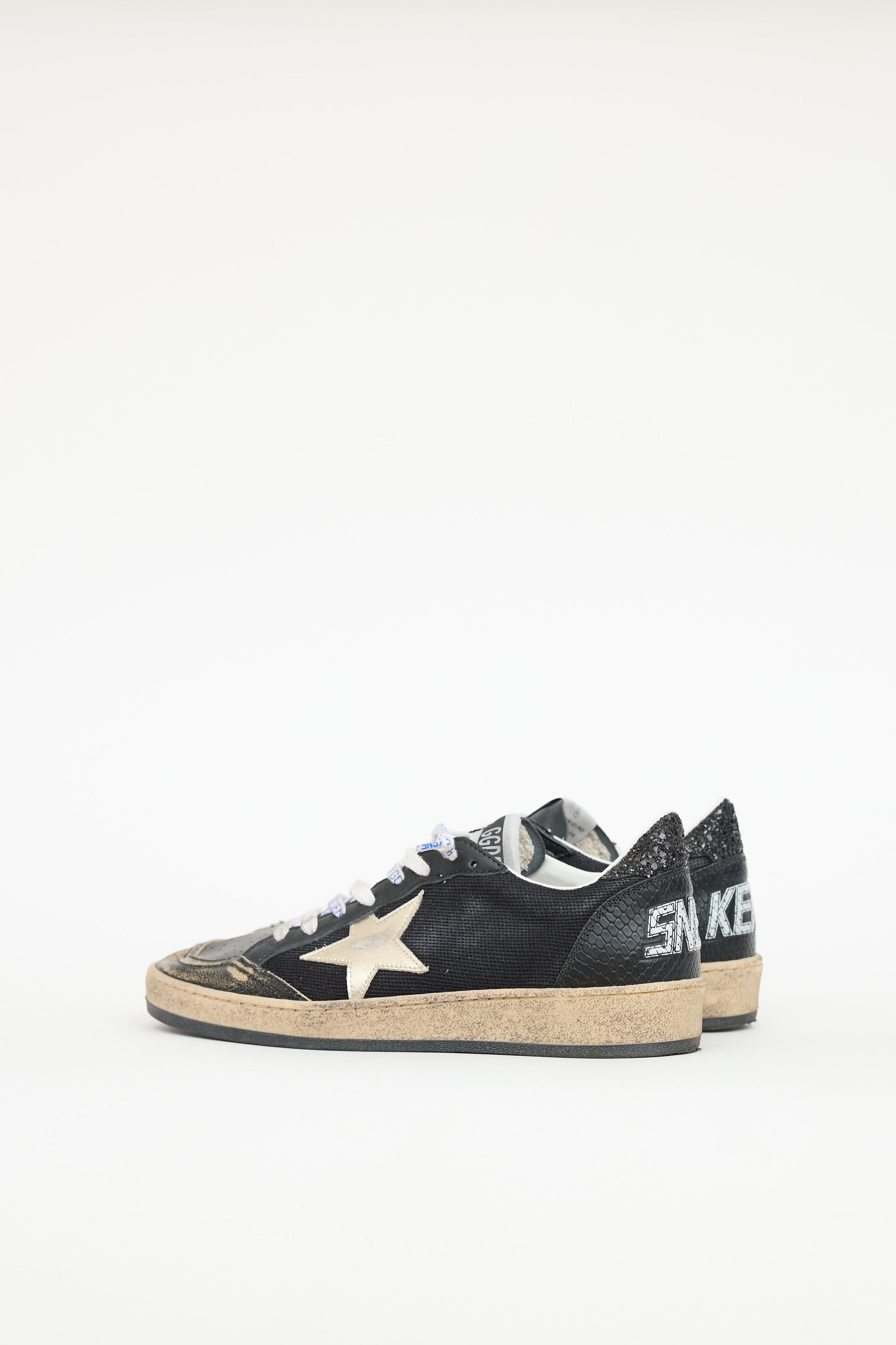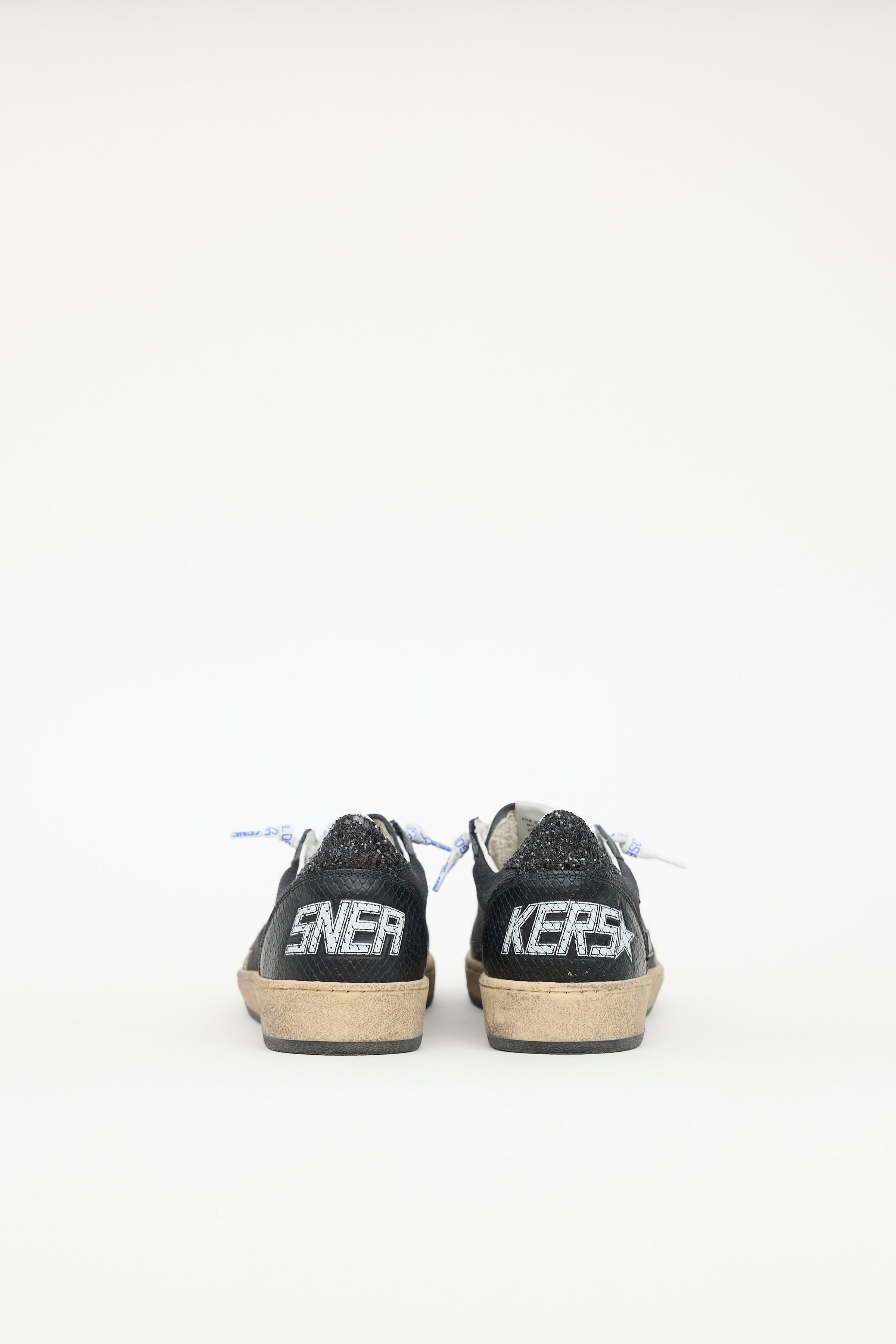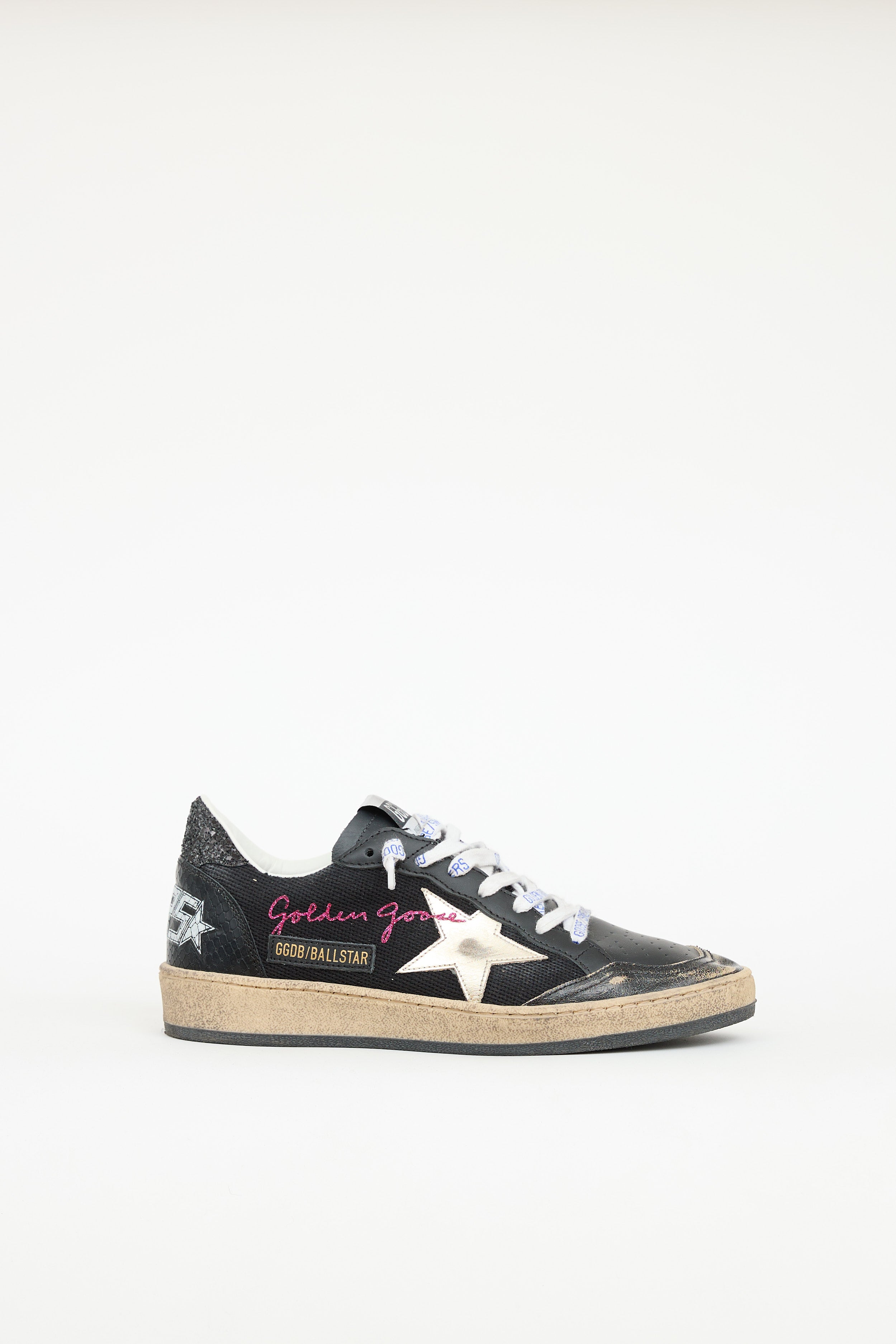 Pre-owned Golden Goose black knit Ballstar sneakers featuring rounded toe, white and blue logo laces, silver leather stars at outer sides, black leather panel at heel, glitter vamp, and silver "KERS" lettering at counter, beige platform midsole with black outsole and intentional distressing throughout.