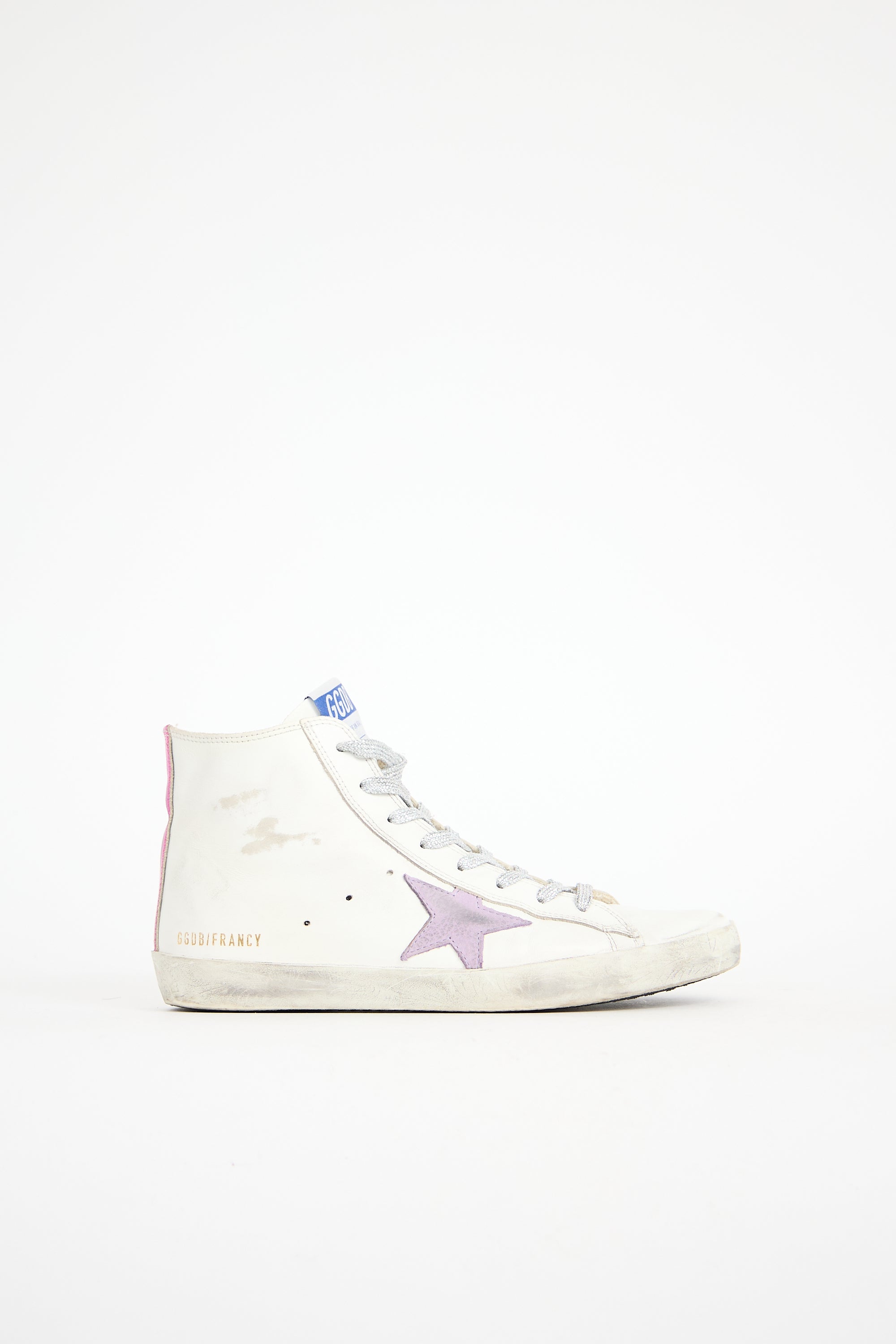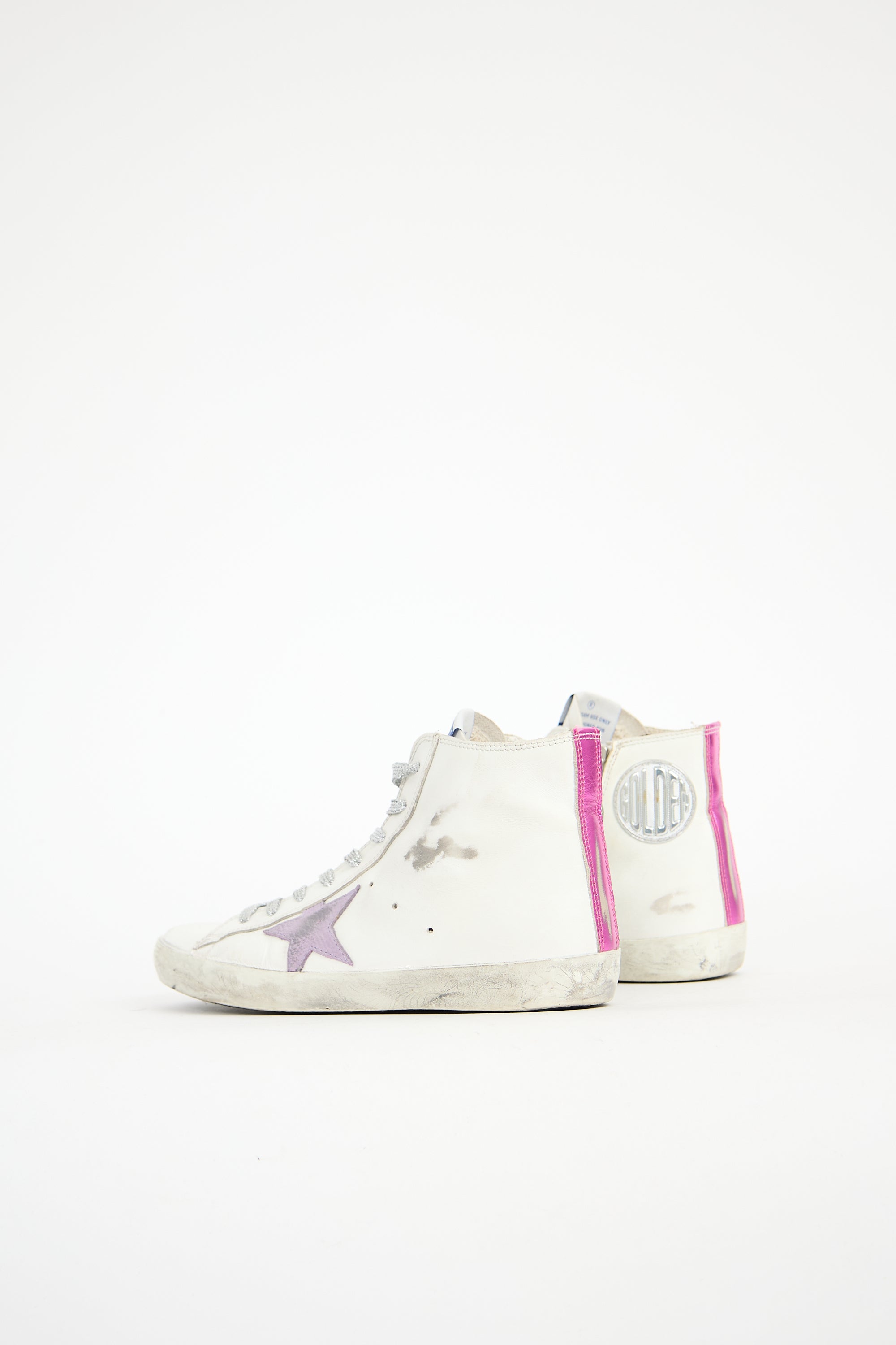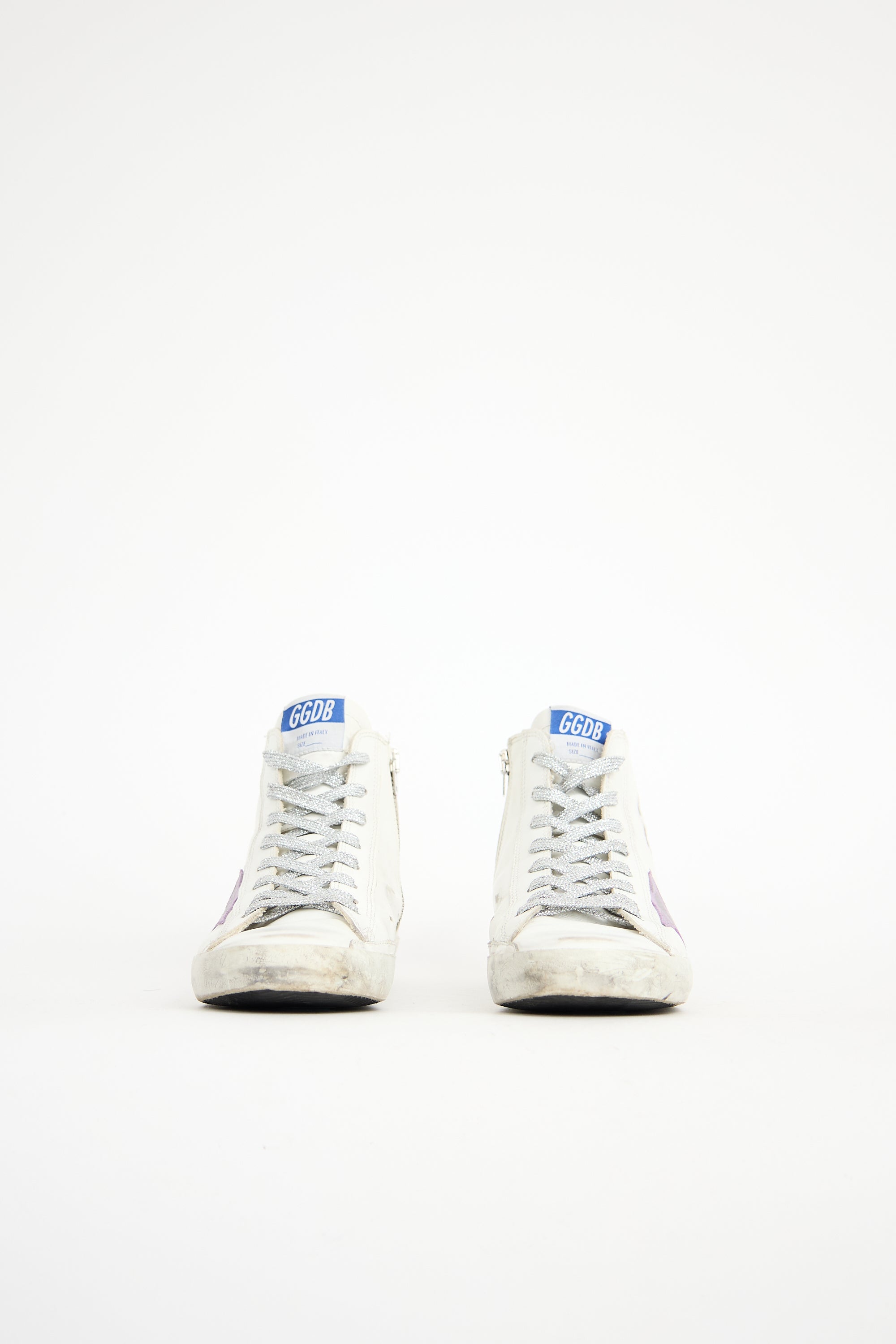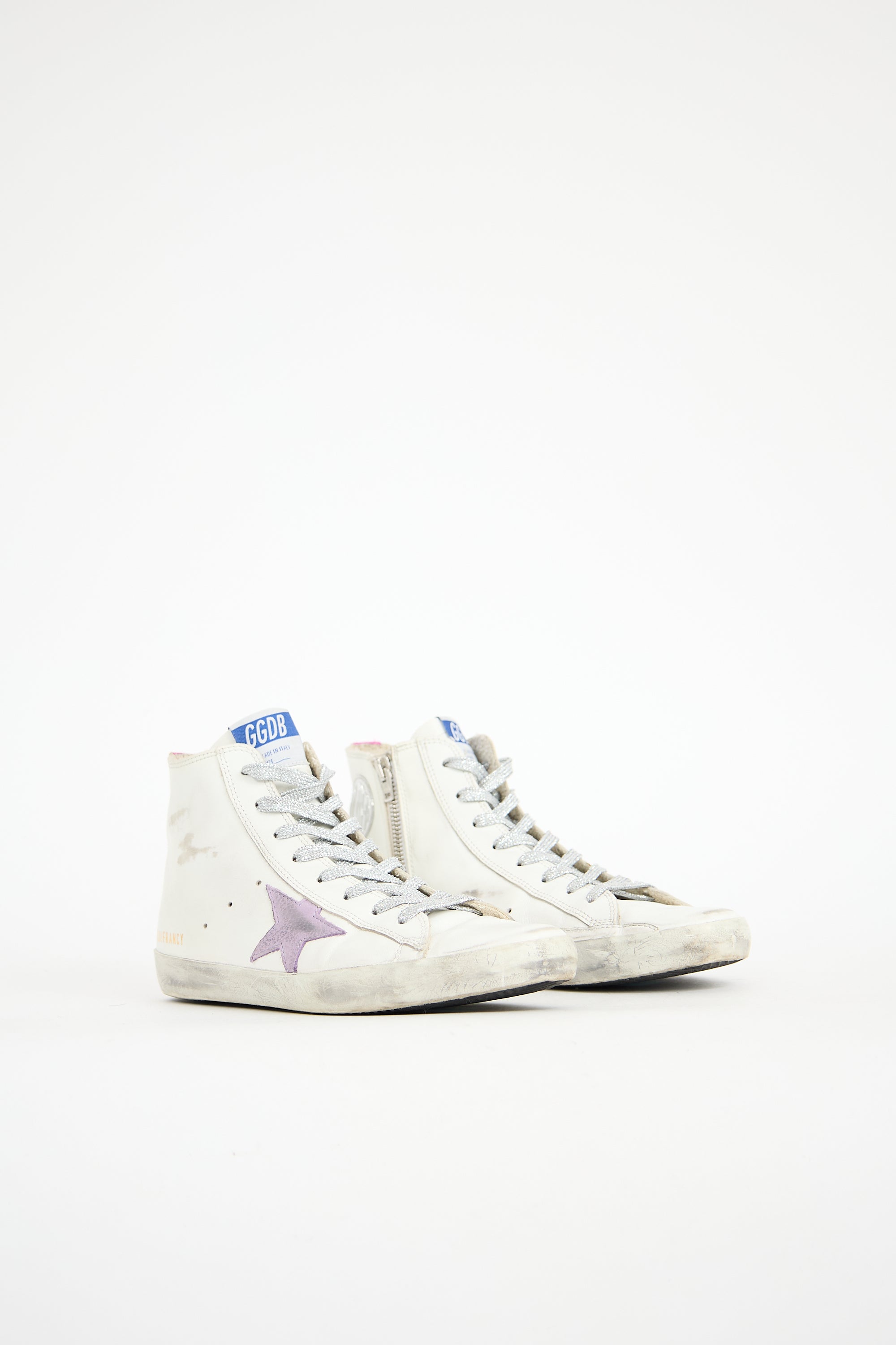 Pre-owned Golden Goose white leather Francy sneakers featuring rounded toe, sparkly silver tone lace up instep, label at tongue, purple leather signature star patch and printed lettering at outer side, silver tone rubber circle logo patch and zip closure at inner side, purple metallic leather backstay, rubber sole, and distressing.