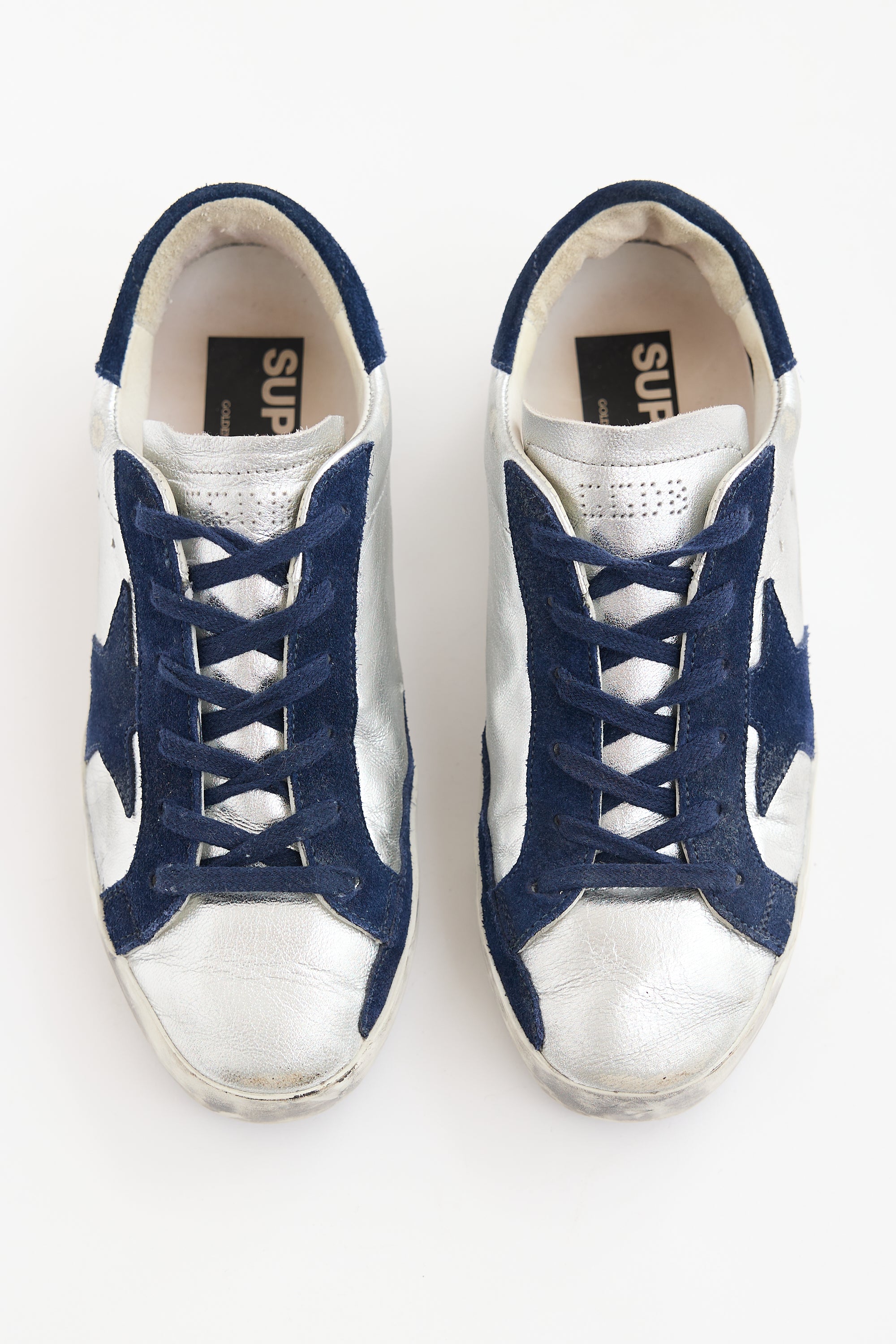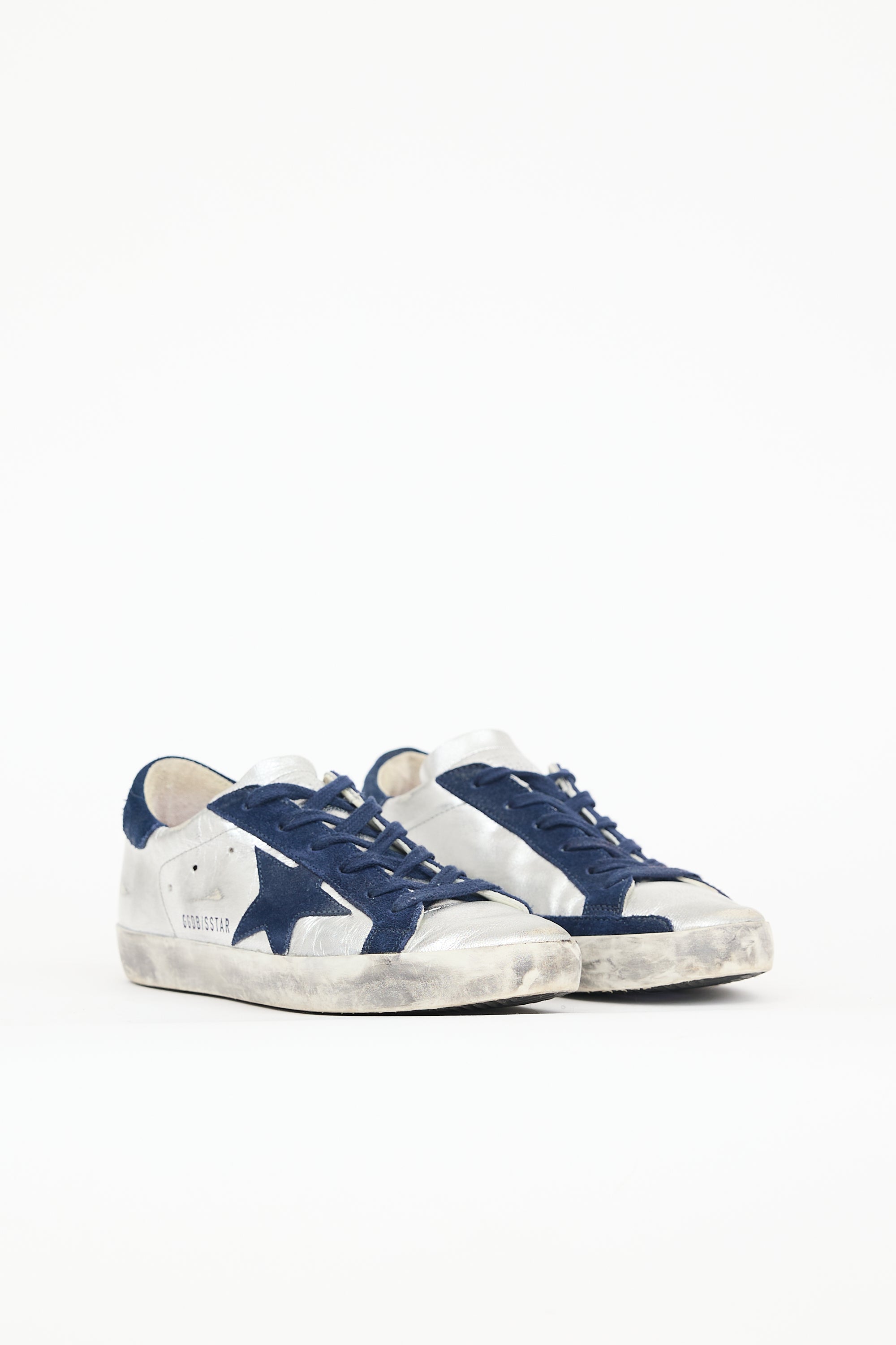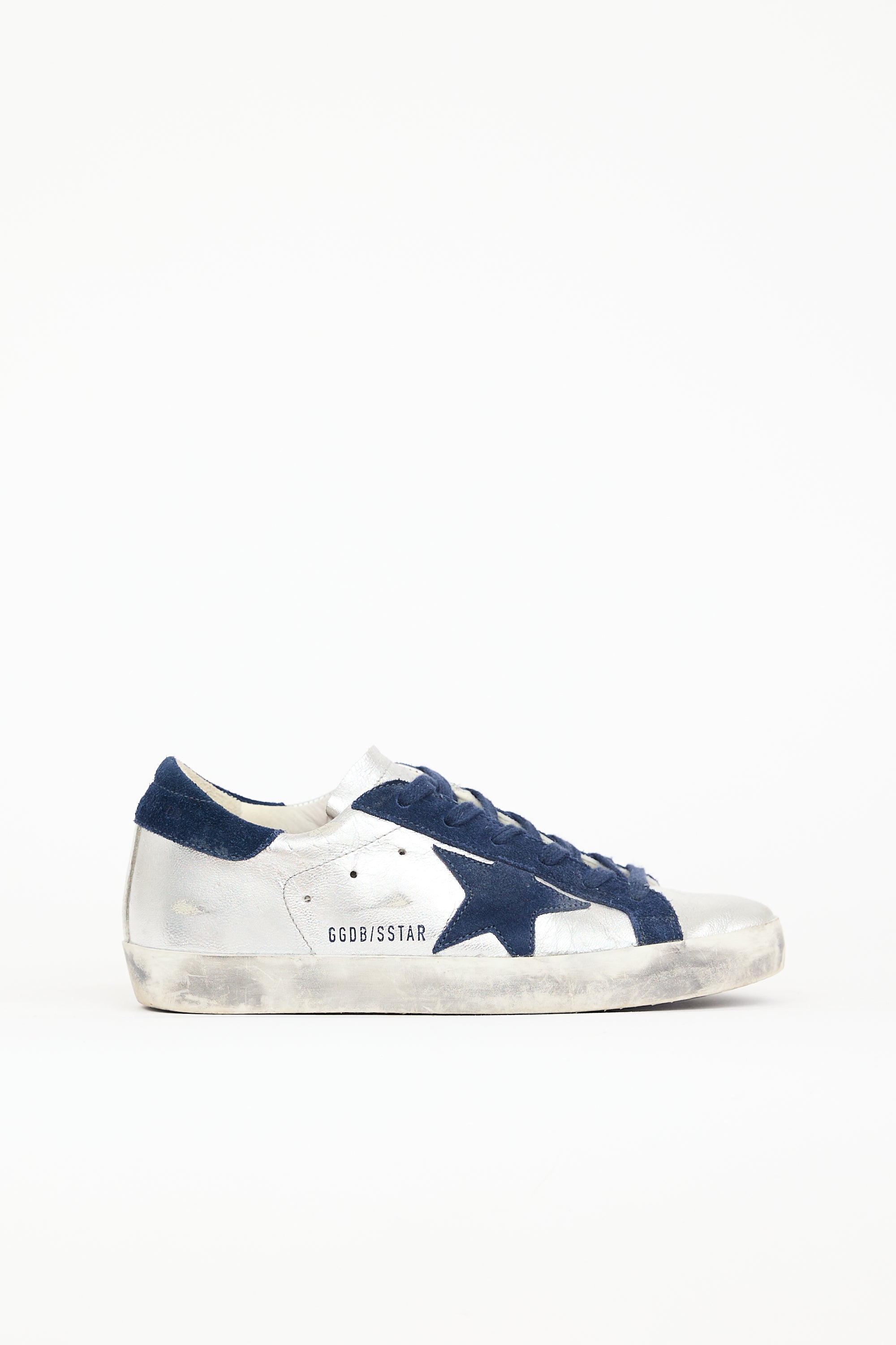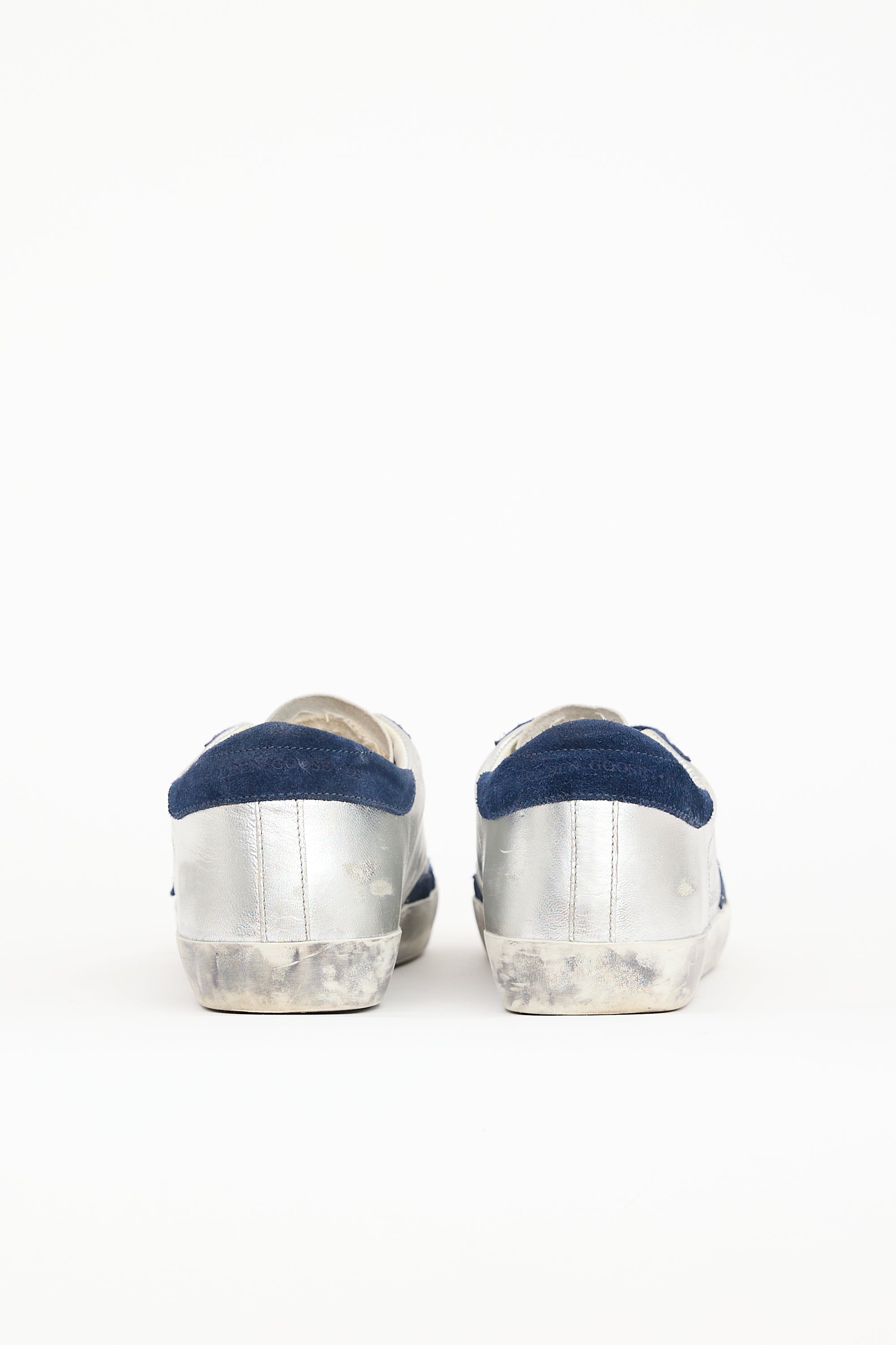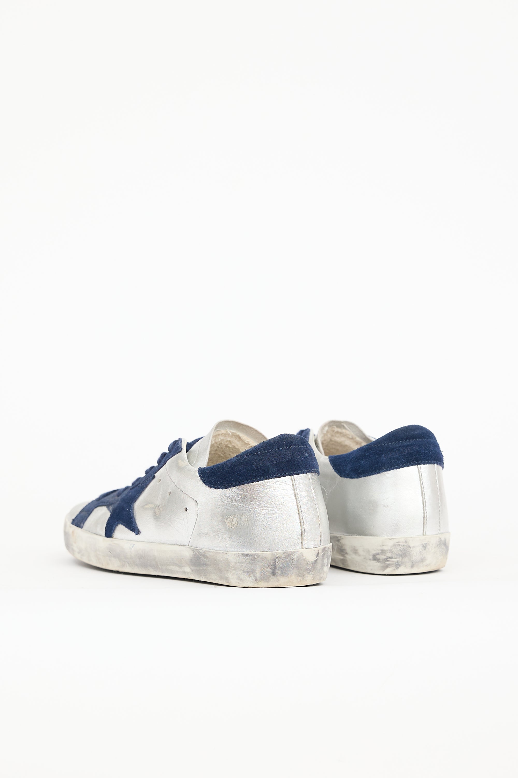 Pre-owned Golden Goose silver leather Super-Star sneakers featuring rounded toe, lace up front, intentional distressing, and suede paneling throughout.