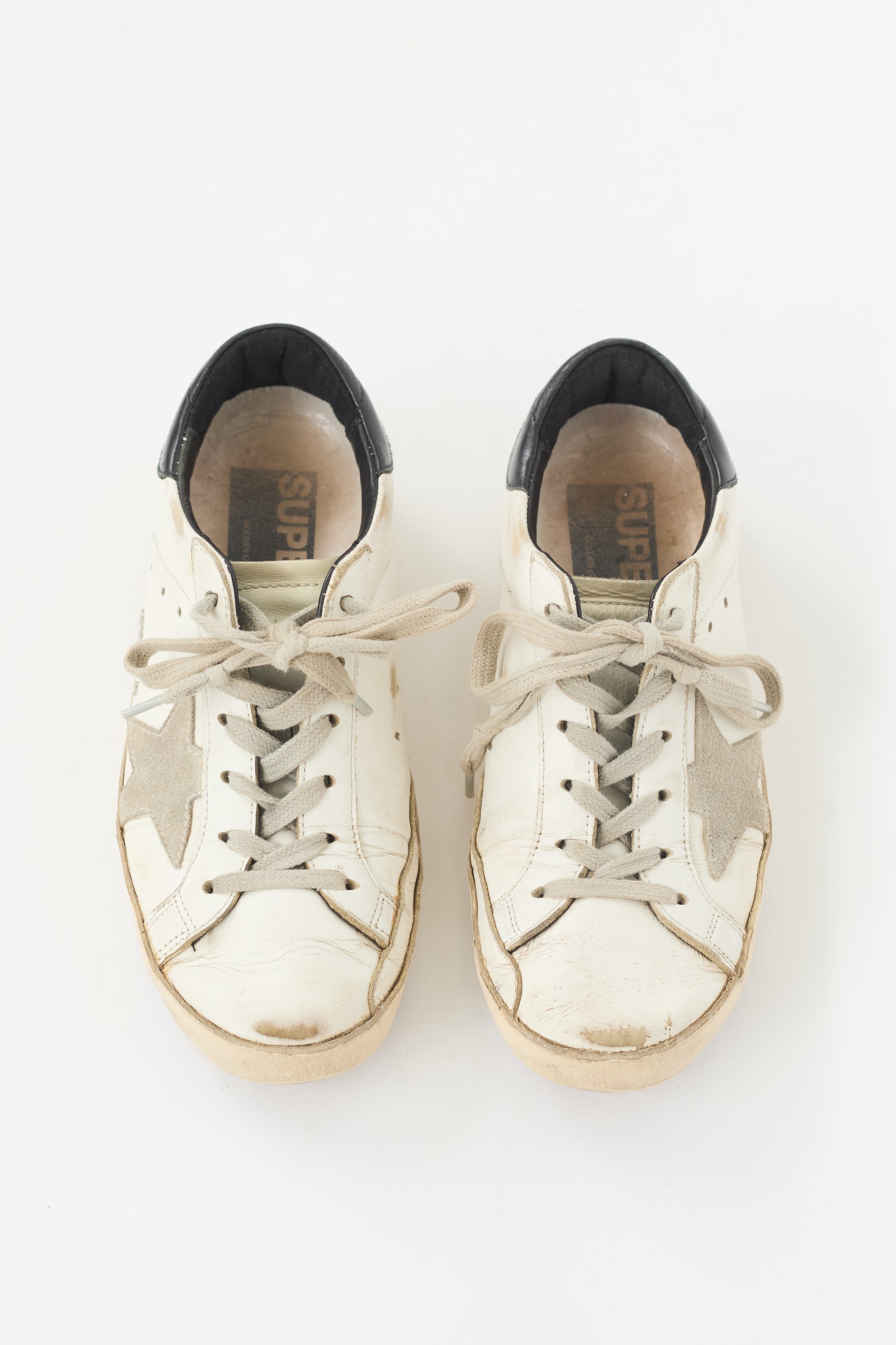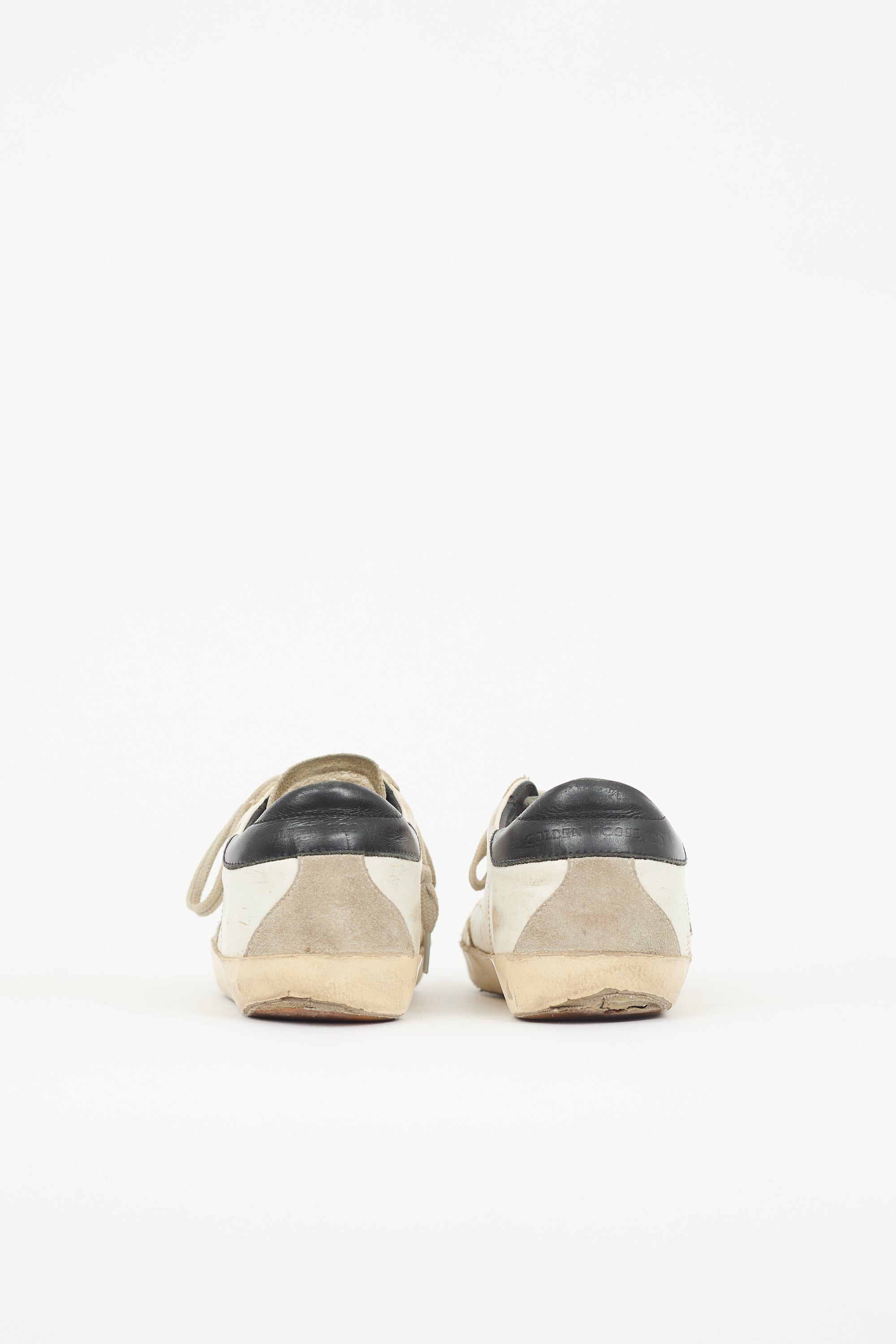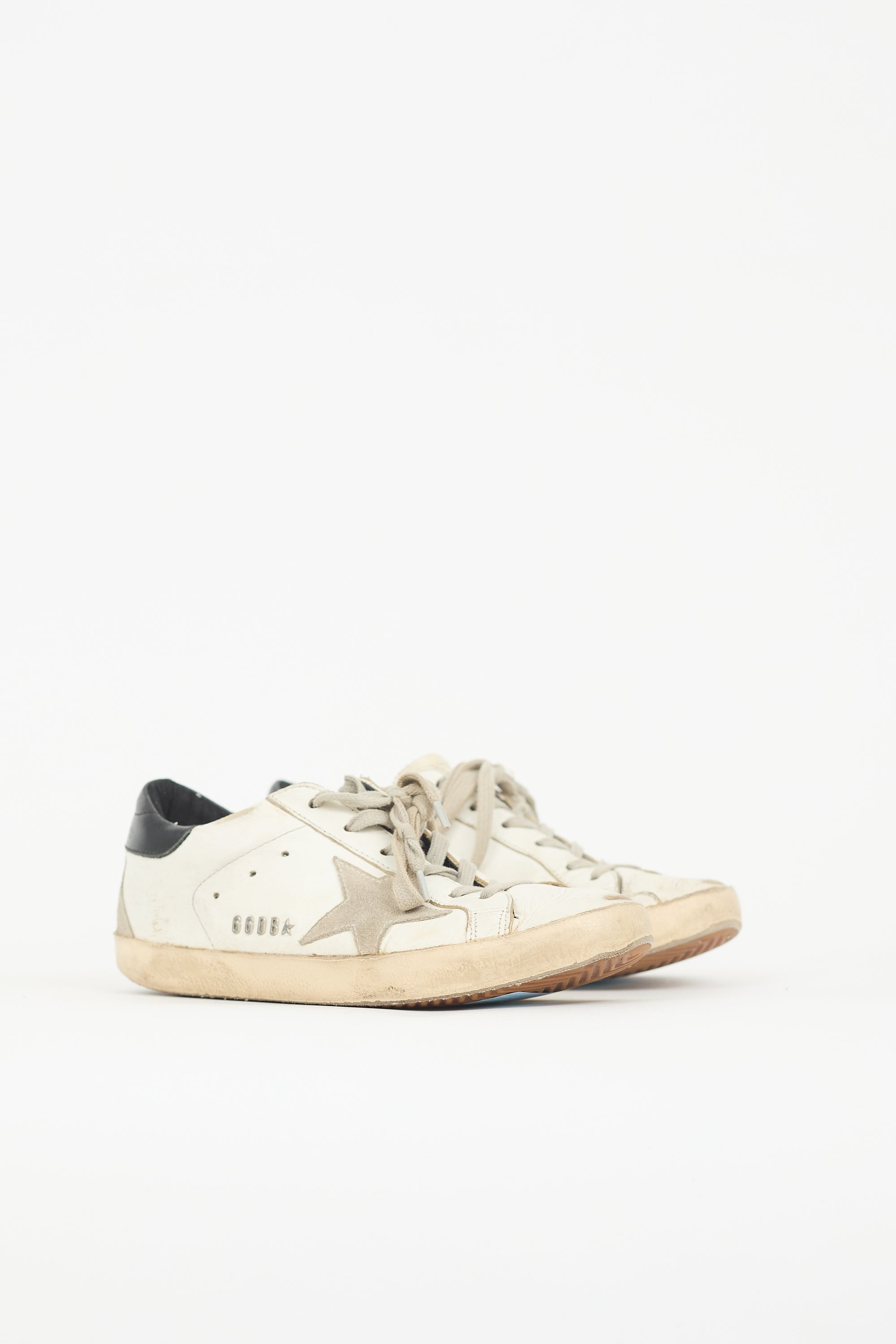 Pre-owned Golden Goose white, black, and grey Superstar sneakers featuring rounded toe, lace up instep, perforated logo at tongue, suede star patch at outer side, black leather counter panel with stamped logo, rubber sole, and distressing.