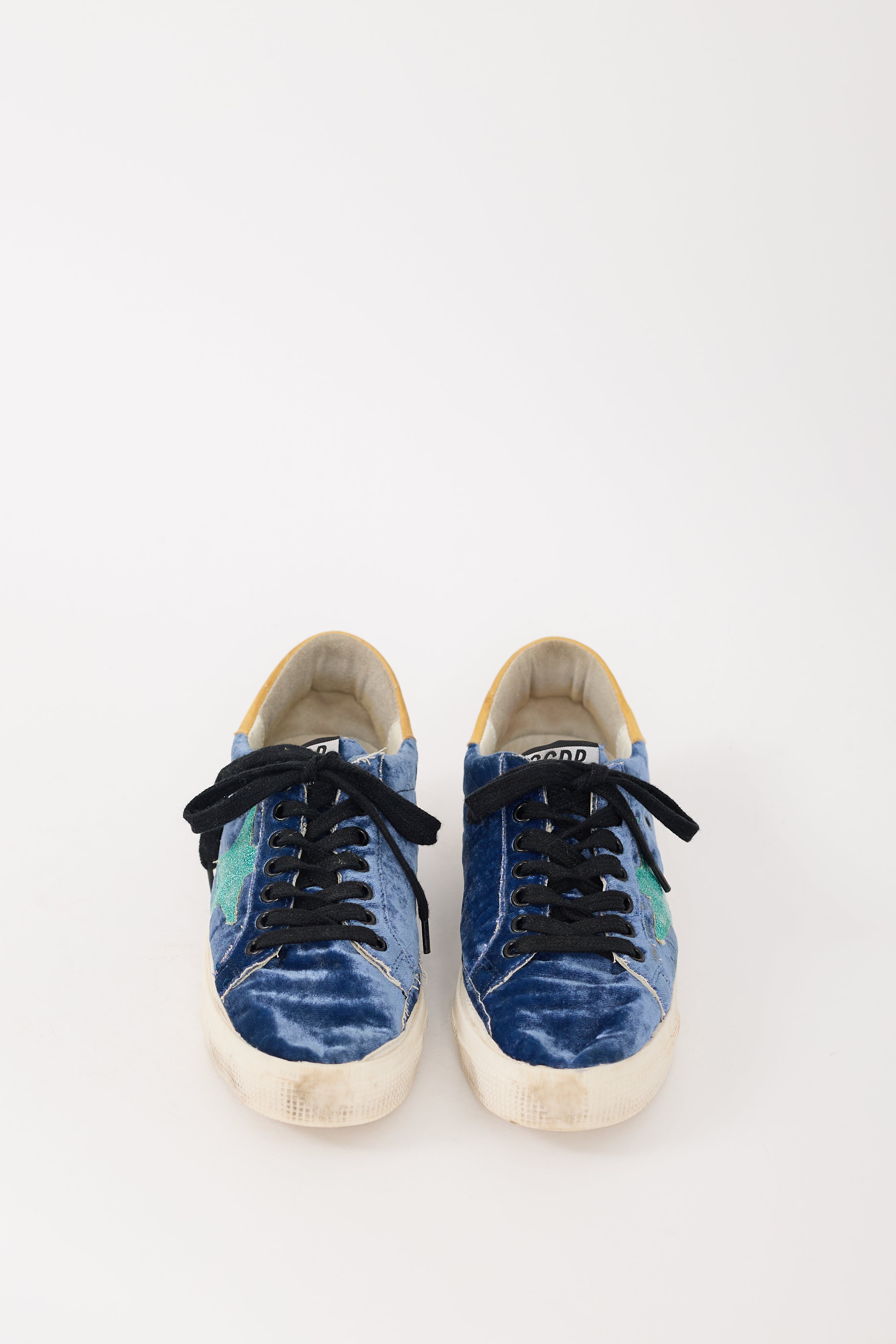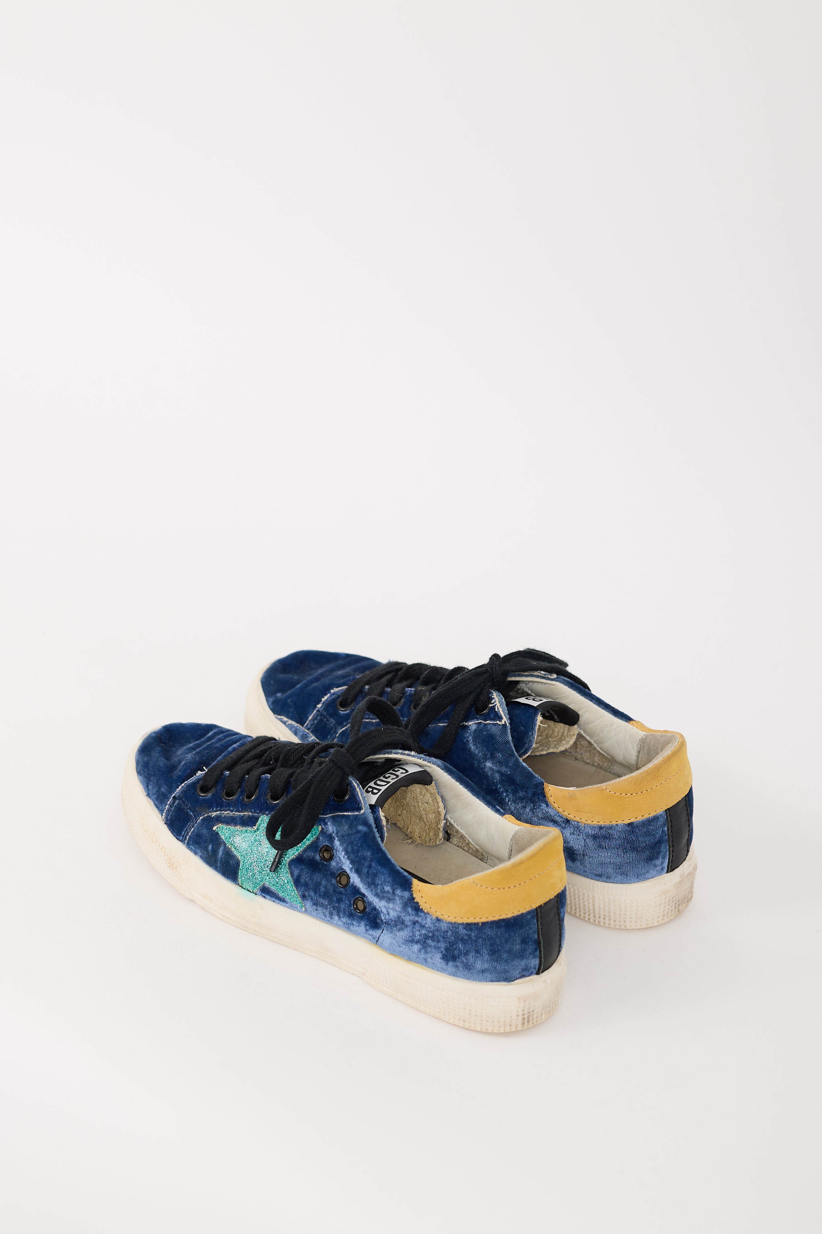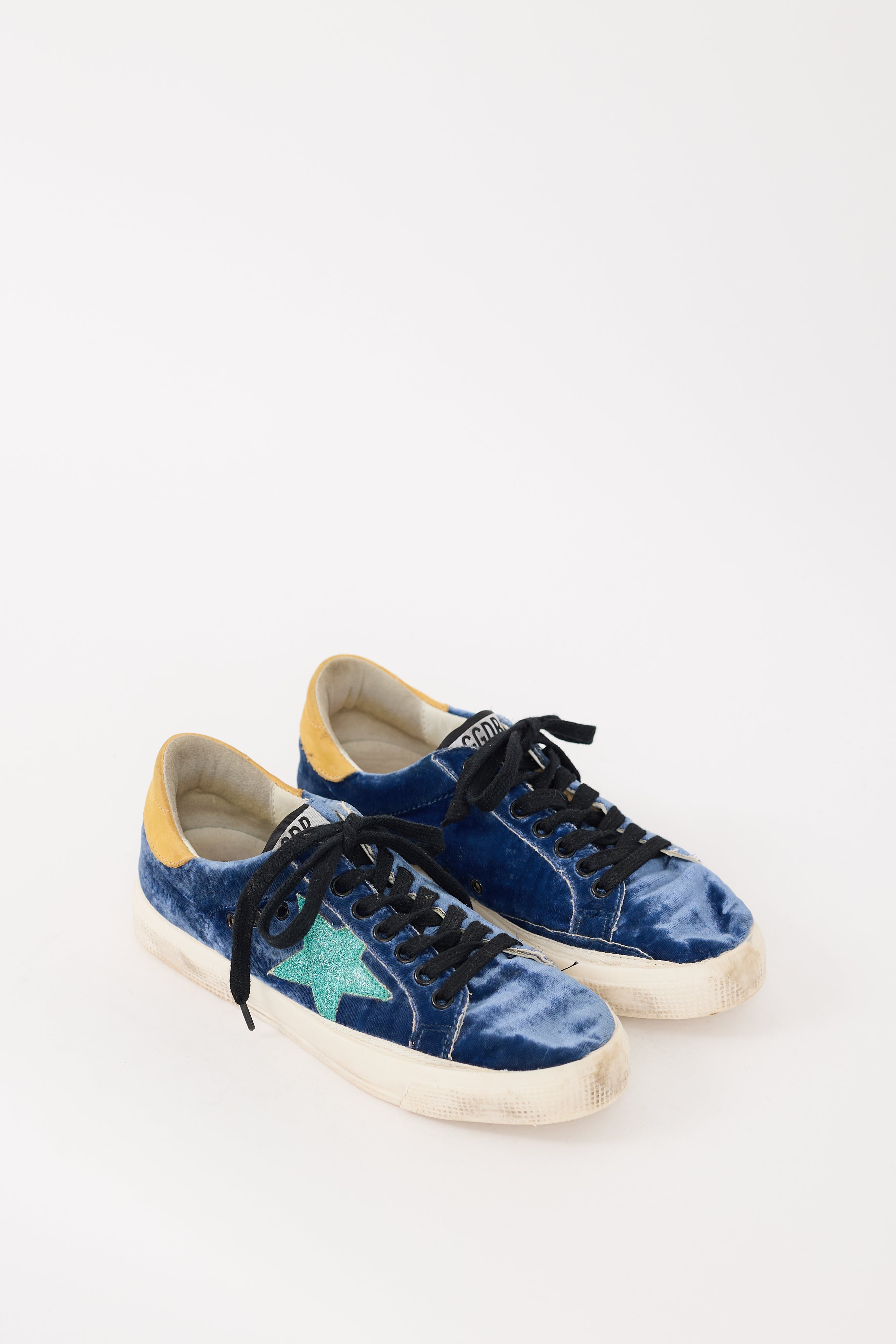 Pre-owned Golden Goose navy May sneakers featuring a rounded toe, velvet upper, black lace up front, logo label at tongue, green glitter star motif at outer sides, yellow suede panel with stamped logo at counter, and white rubber sole.