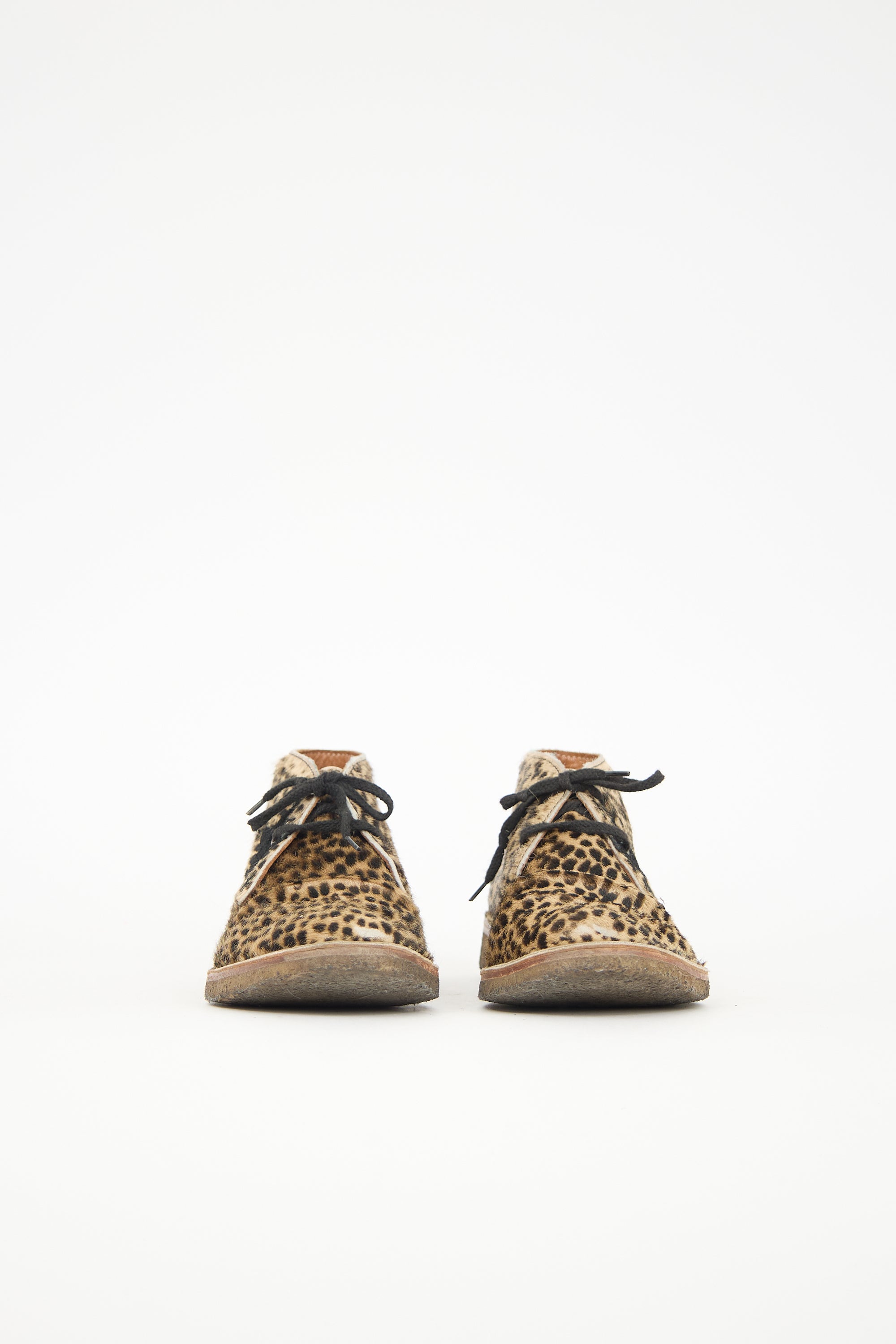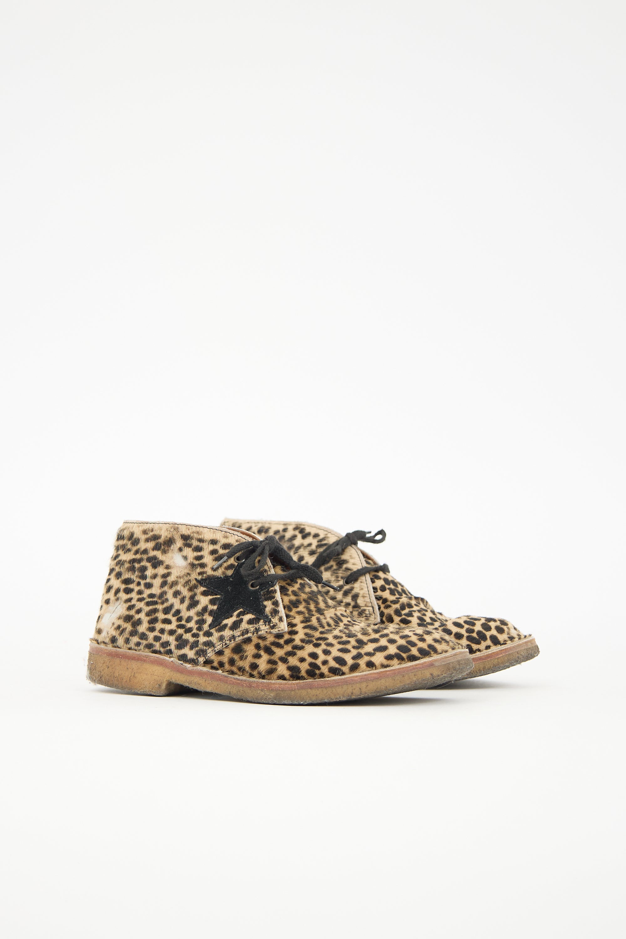 Pre-owned Golden Goose beige and brown pony hair City boots featuring rounded toe, distressed cheetah printed upper, lace up front, signature star patch at outer side, and crepe rubber sole.