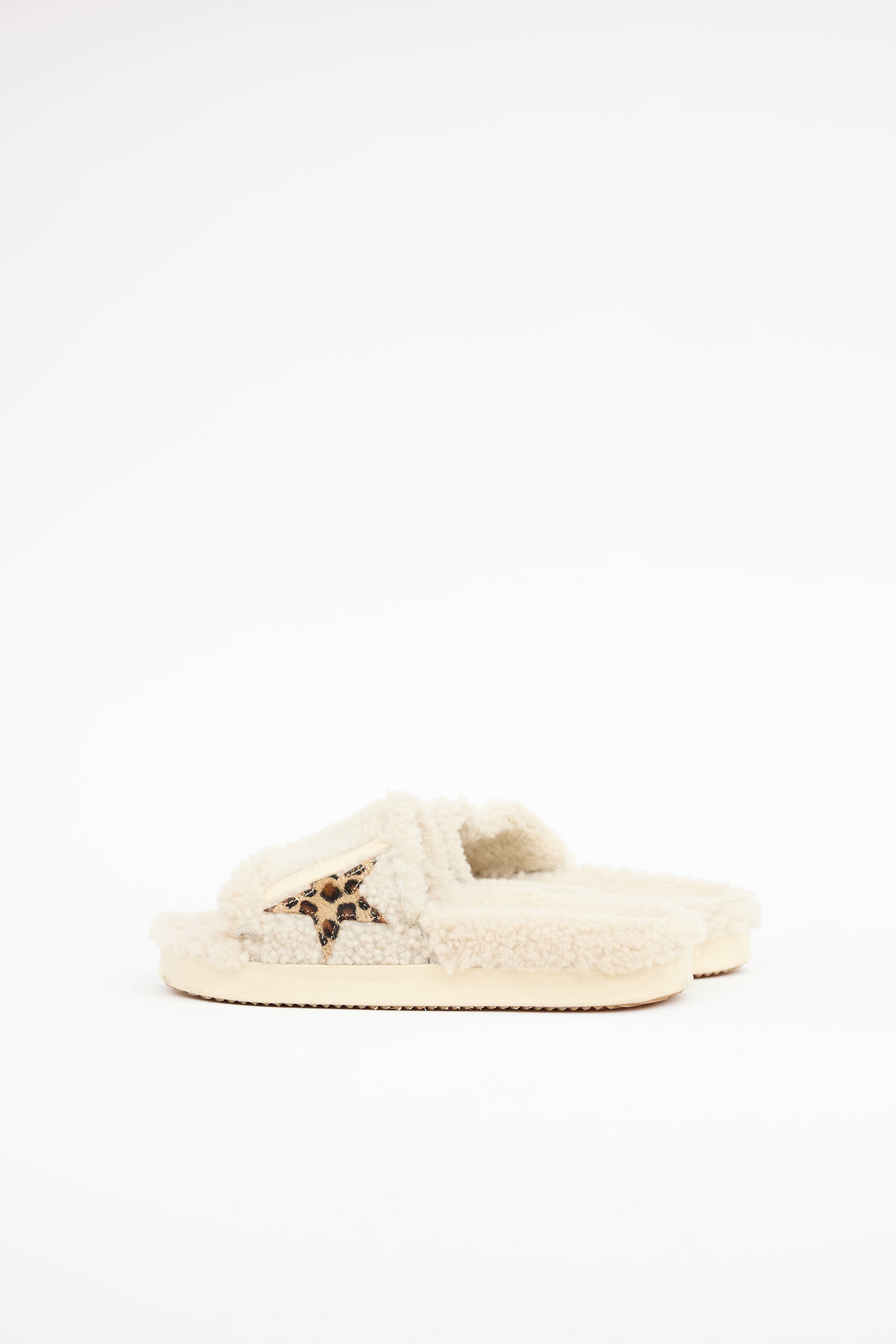 Pre-owned Golden Goose beige slides featuring shearling upper, treaded sole, leopard print star at vamp, and gold printed logo at side.