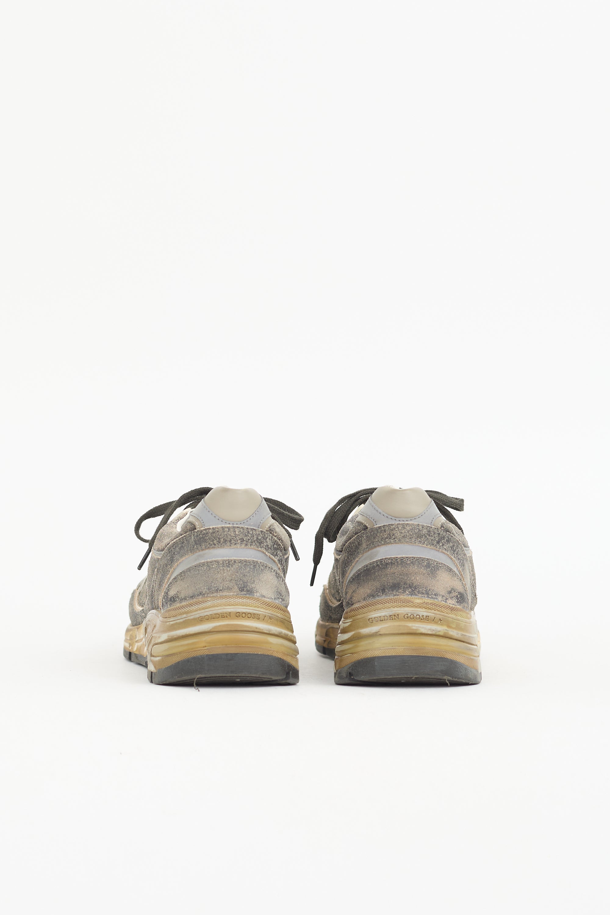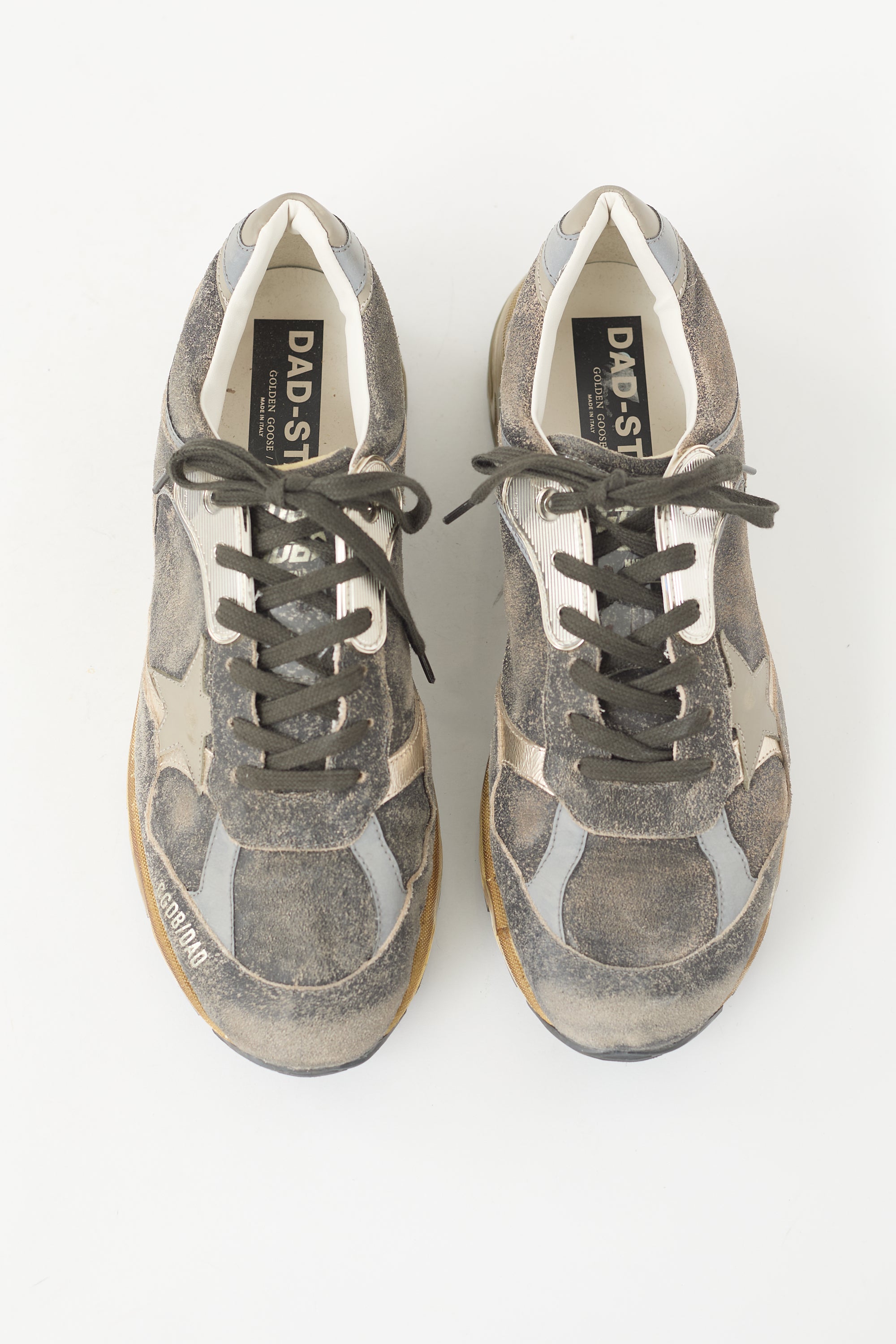 Pre-owned Golden Goose dark grey distressed suede Star Dan sneakers featuring rounded toe, lace up instep, logo tab at tongue, grey leather signature star patch at outer side, reflective counter panel, and rubber sole with debossed logo at heel.
