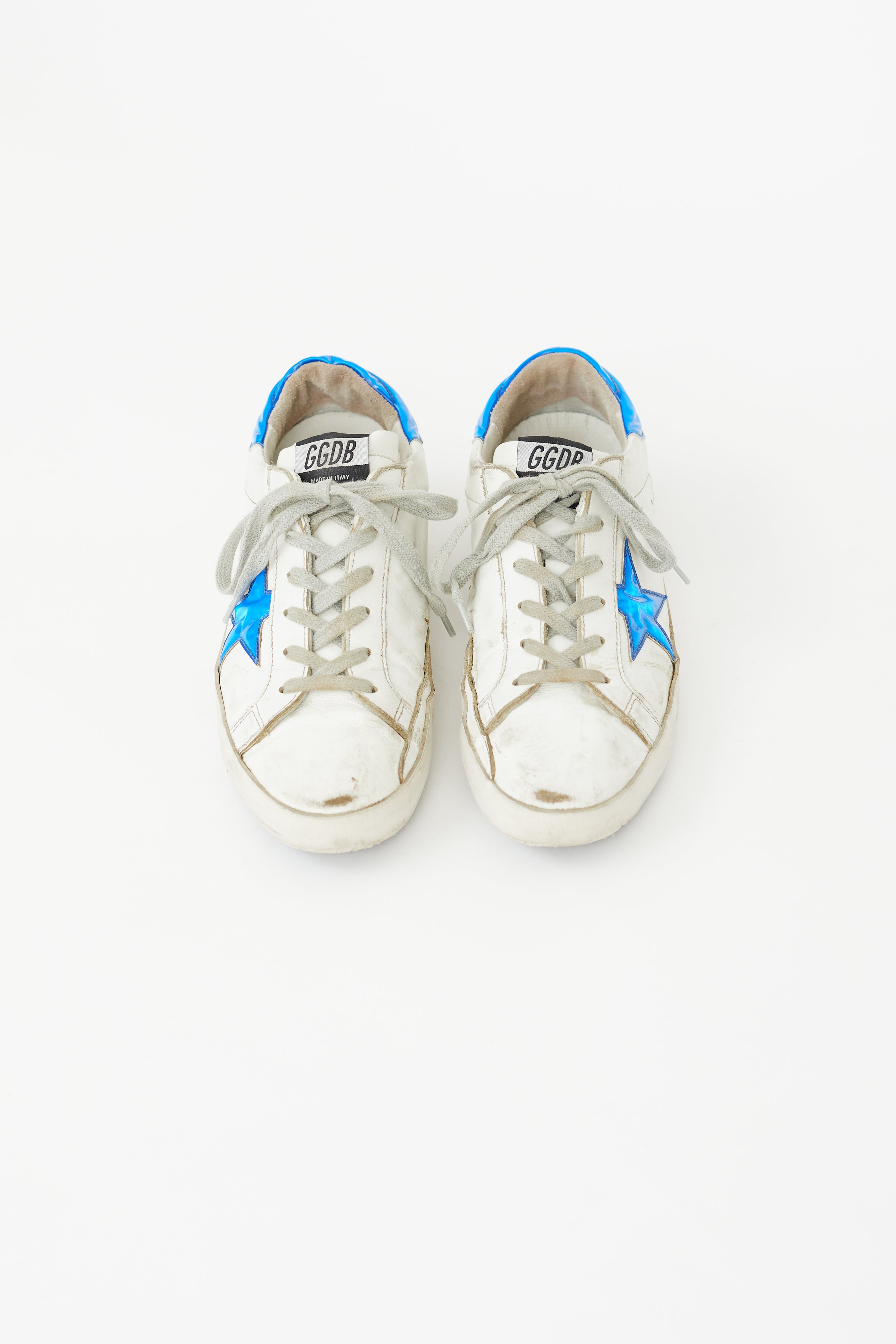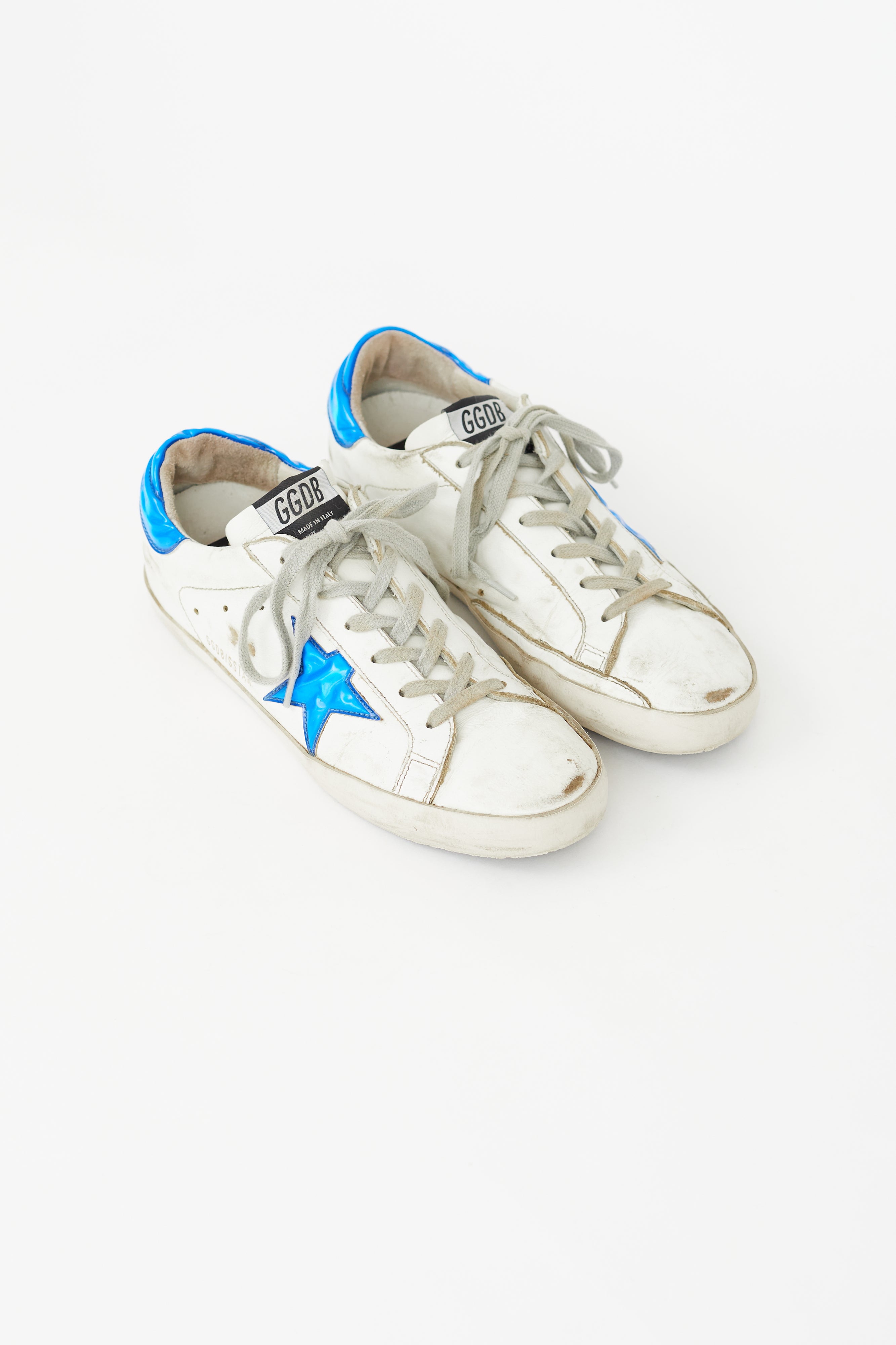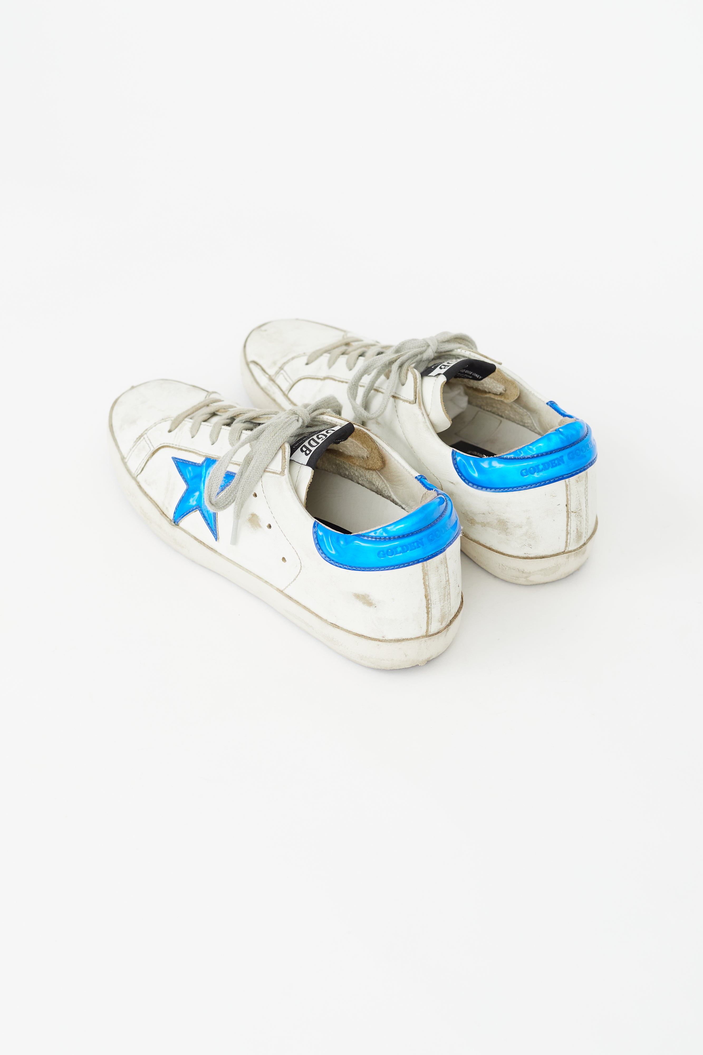 Pre-owned Golden Goose white Superstar sneakers featuring rounded toe, lace up vamp, purposeful distressing, blue vinyl star and heel counter, gold stamped logo at side, and logo tab at tongue.