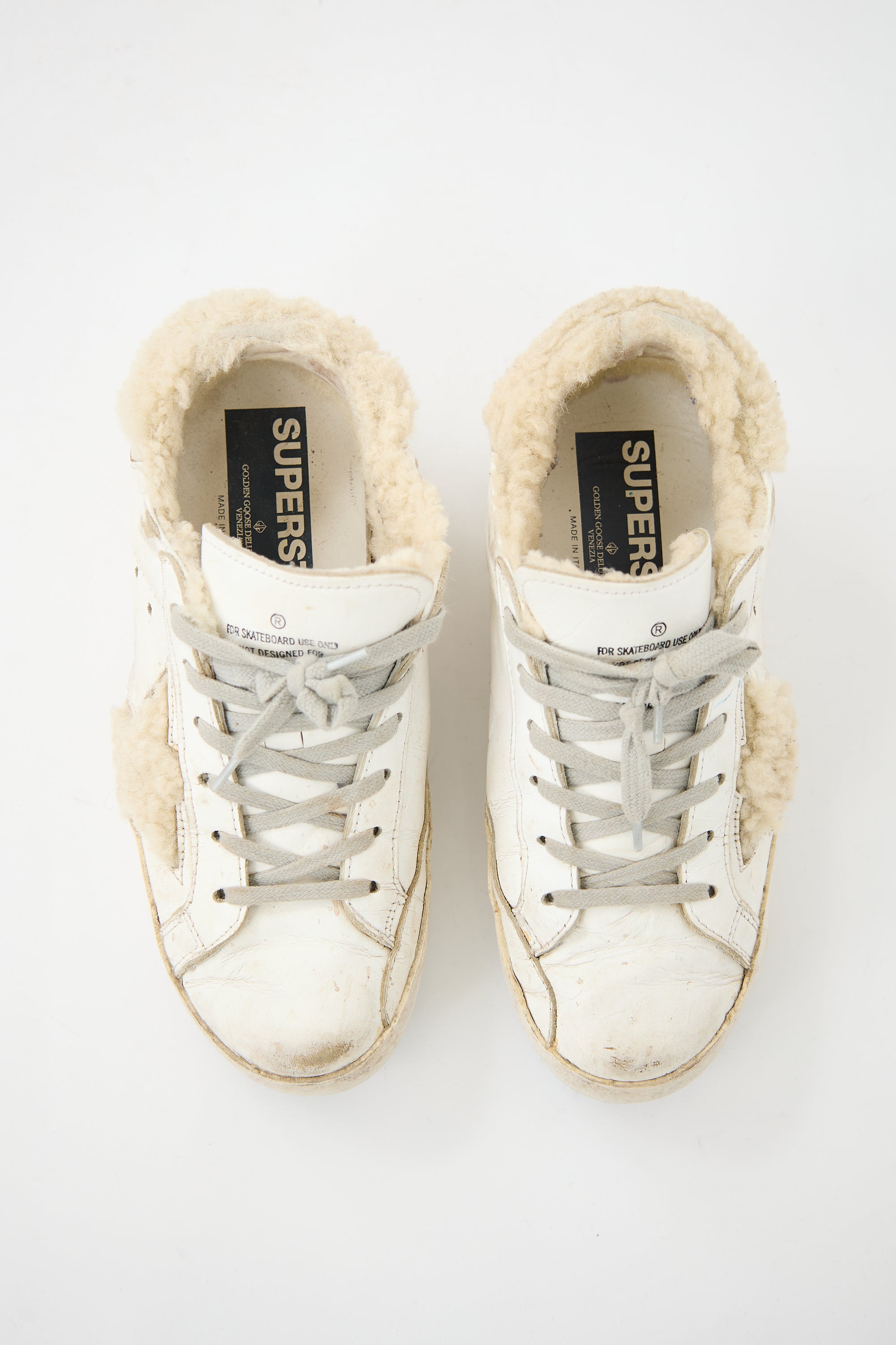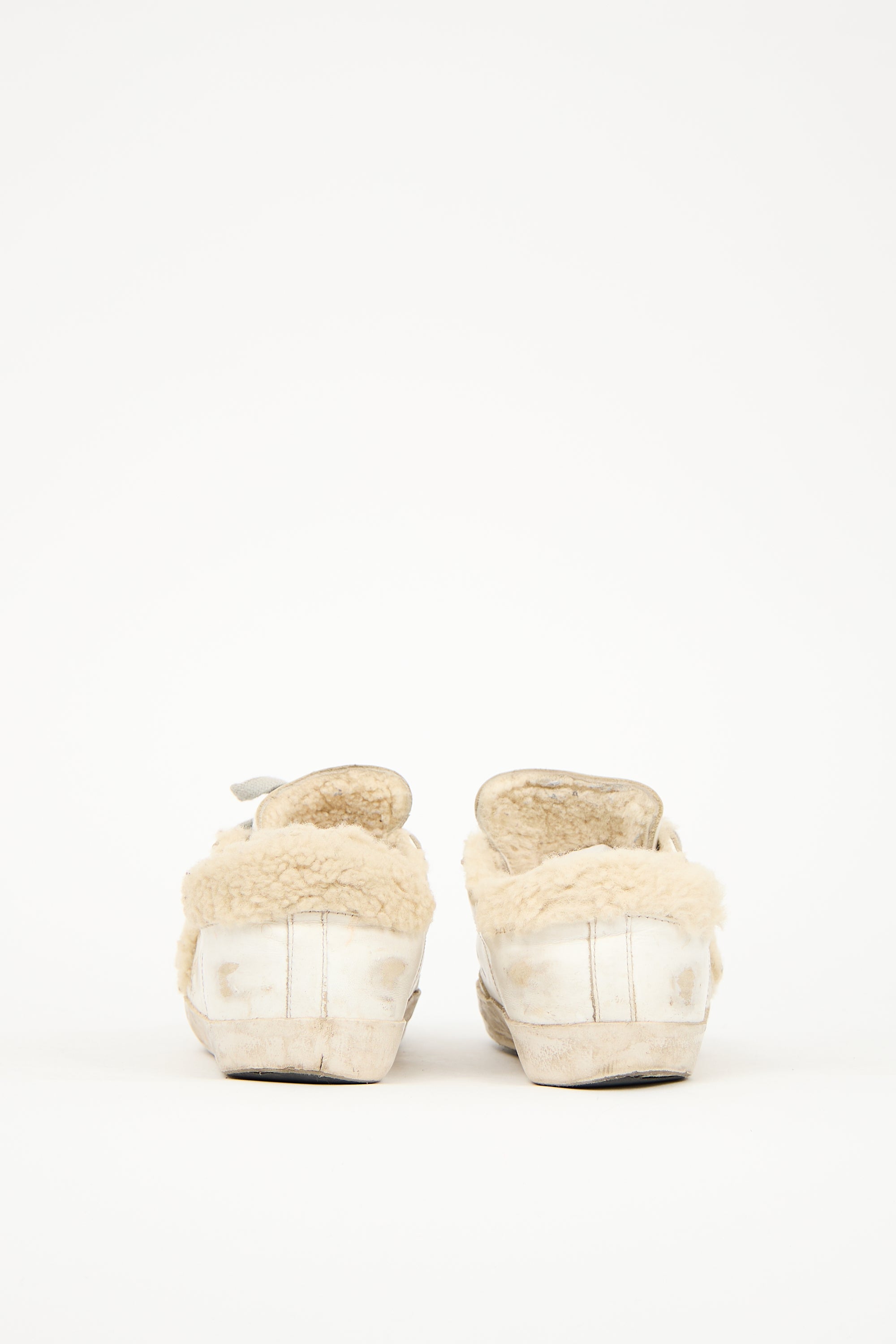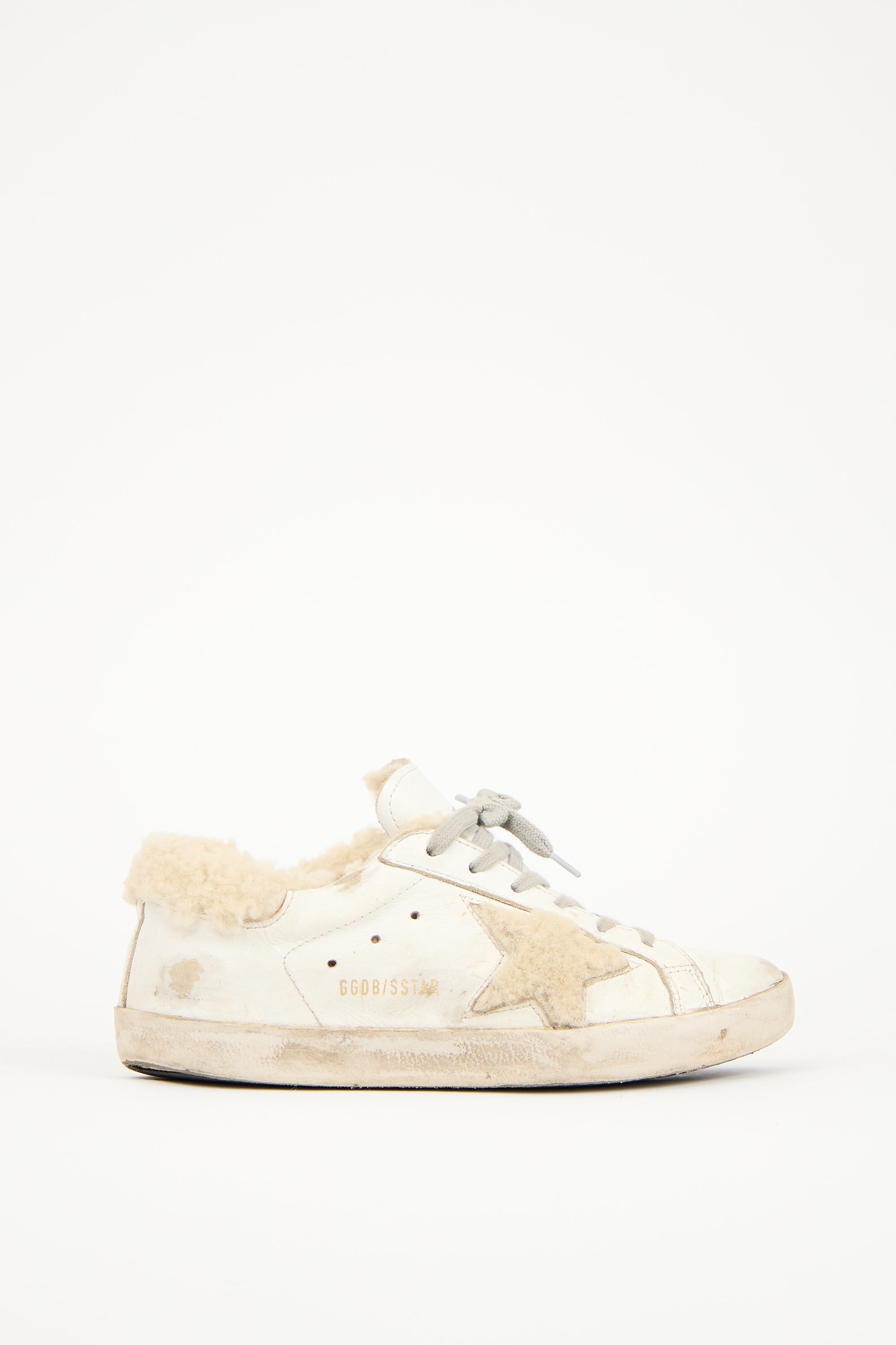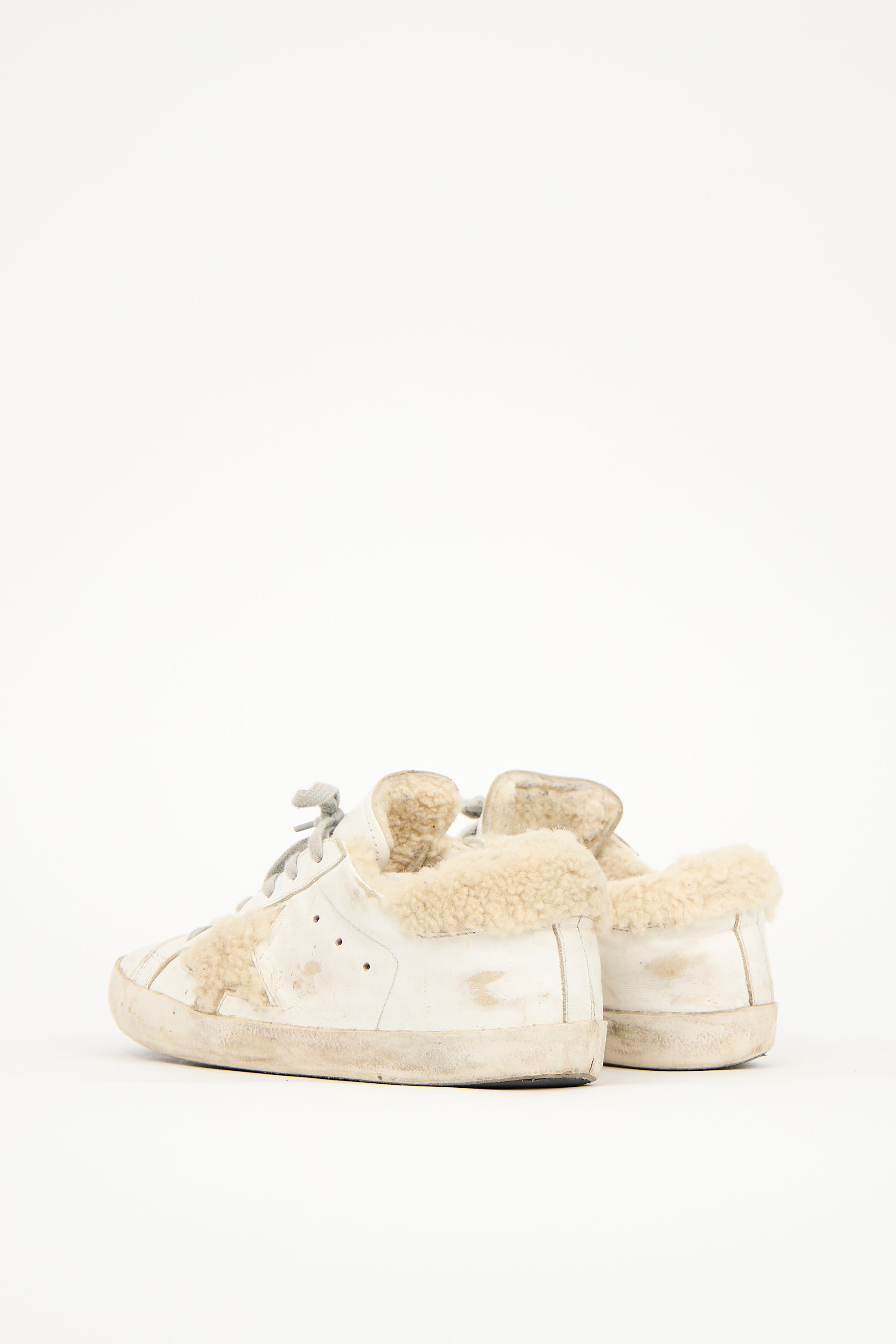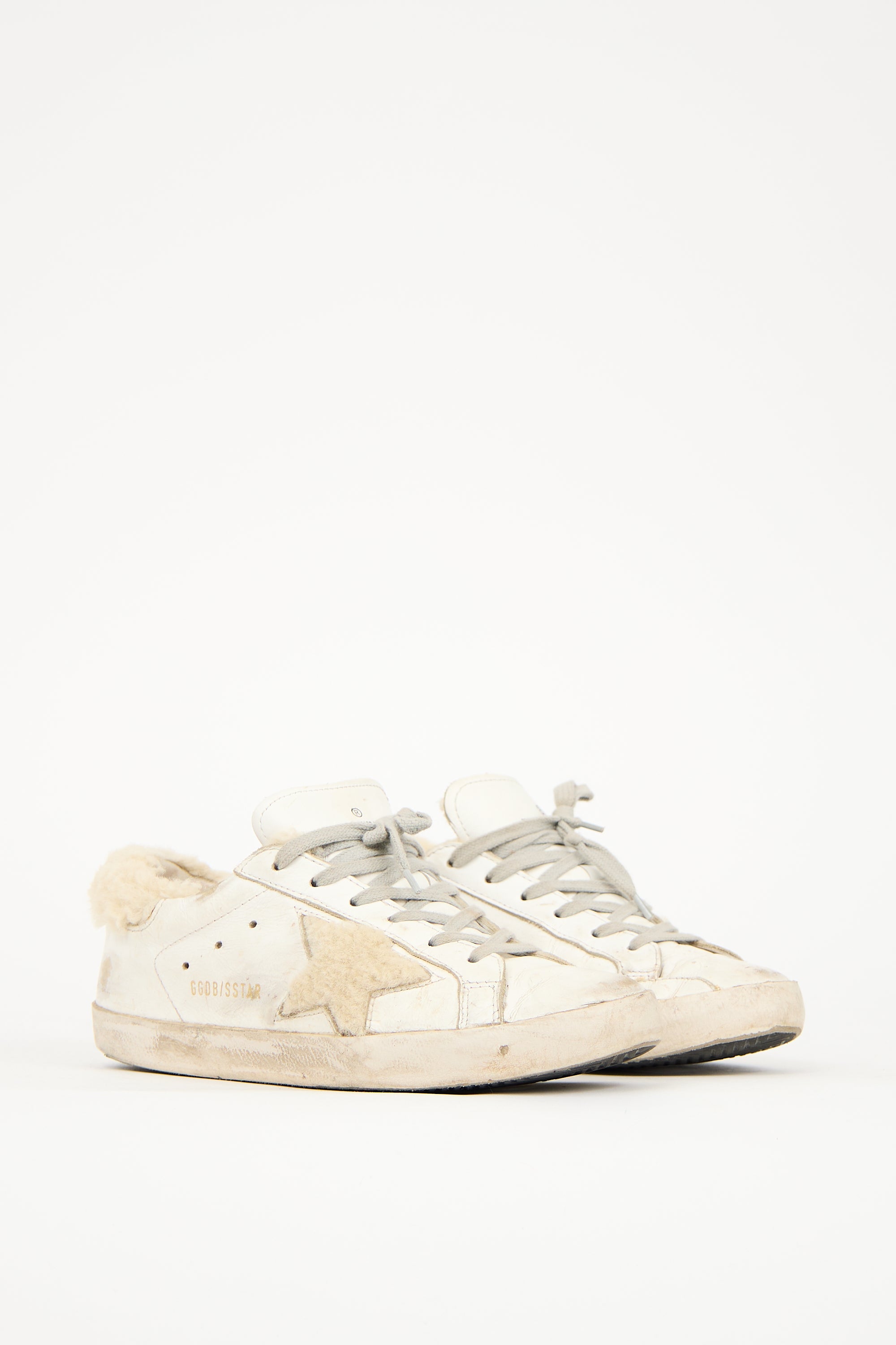 Pre-owned Golden Goose white leather Superstar sneakers featuring rounded toe, lace up front, fur trim at counter and side, and intentional distressing throughout.
