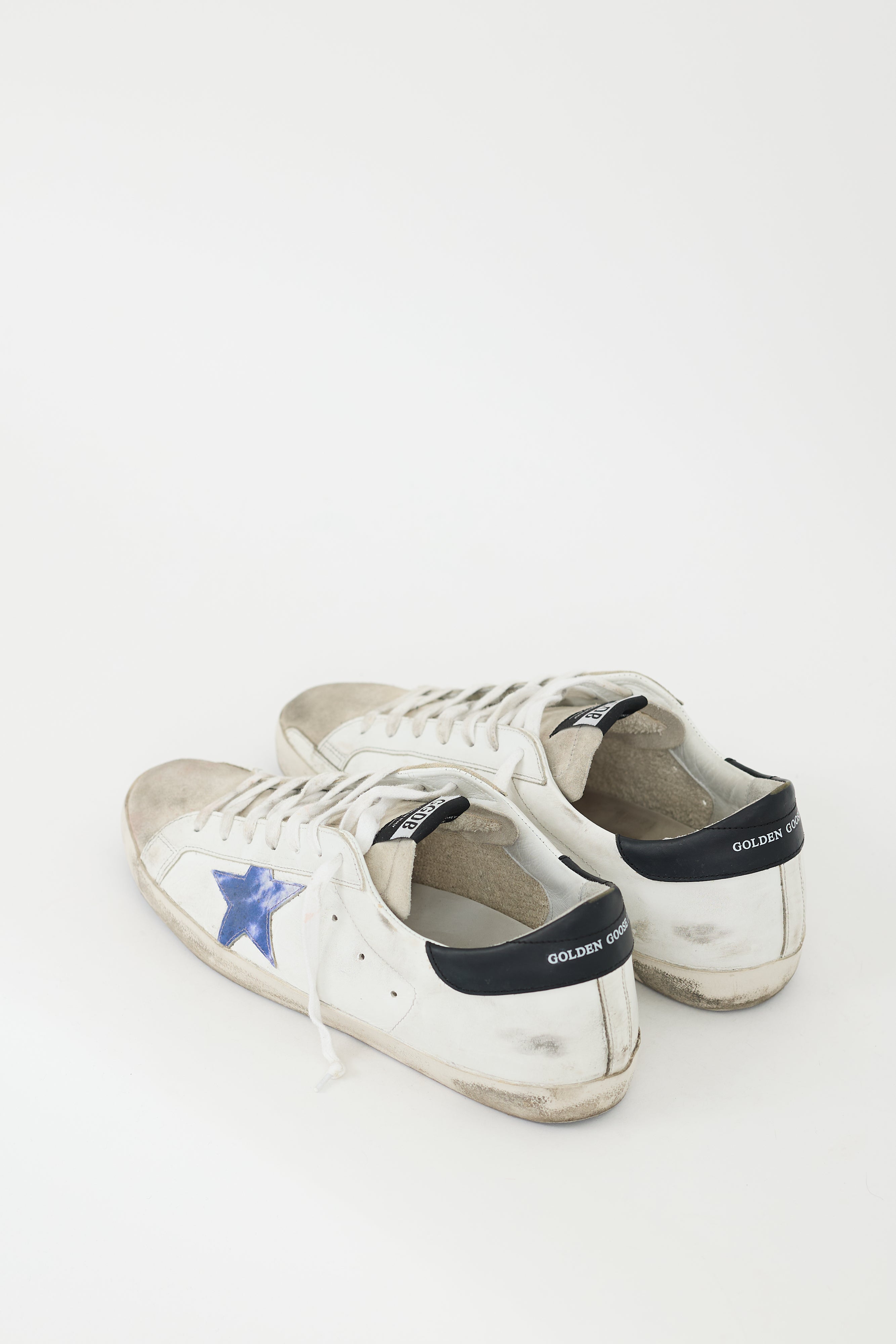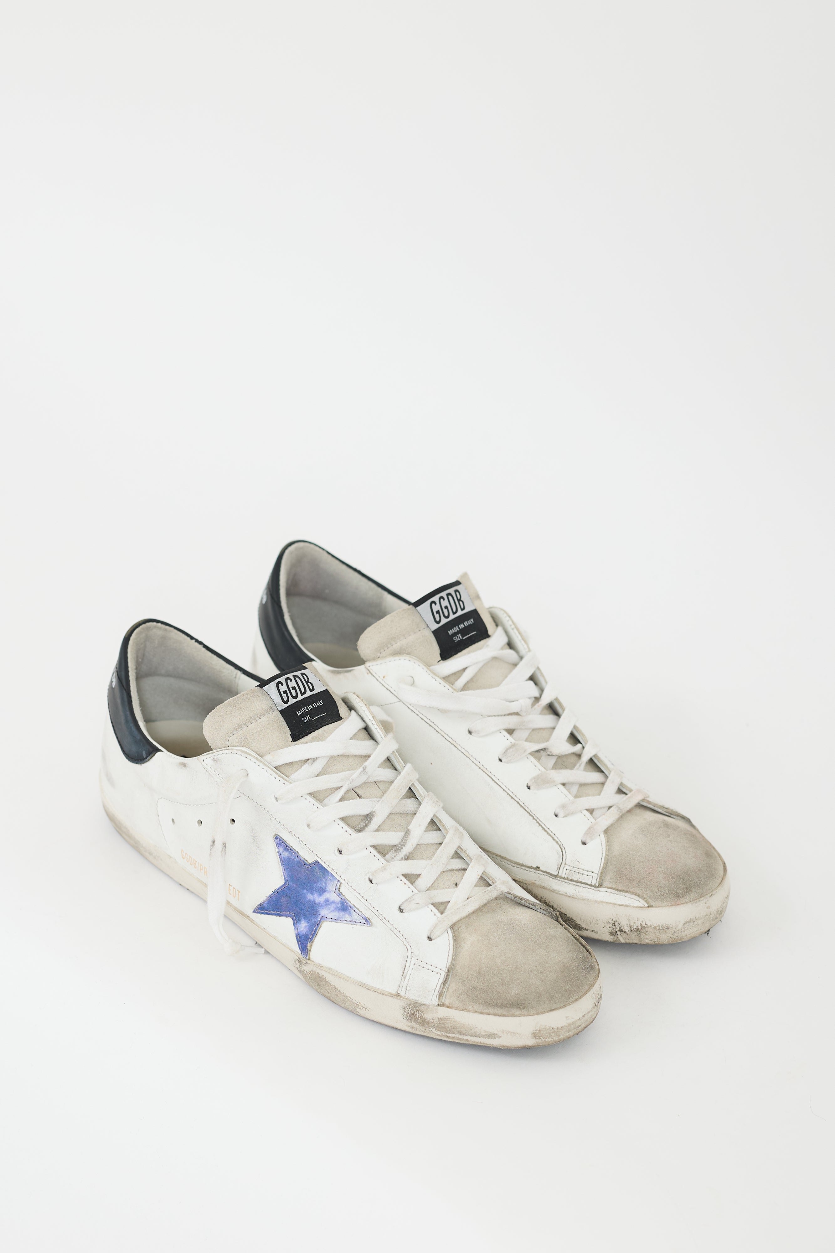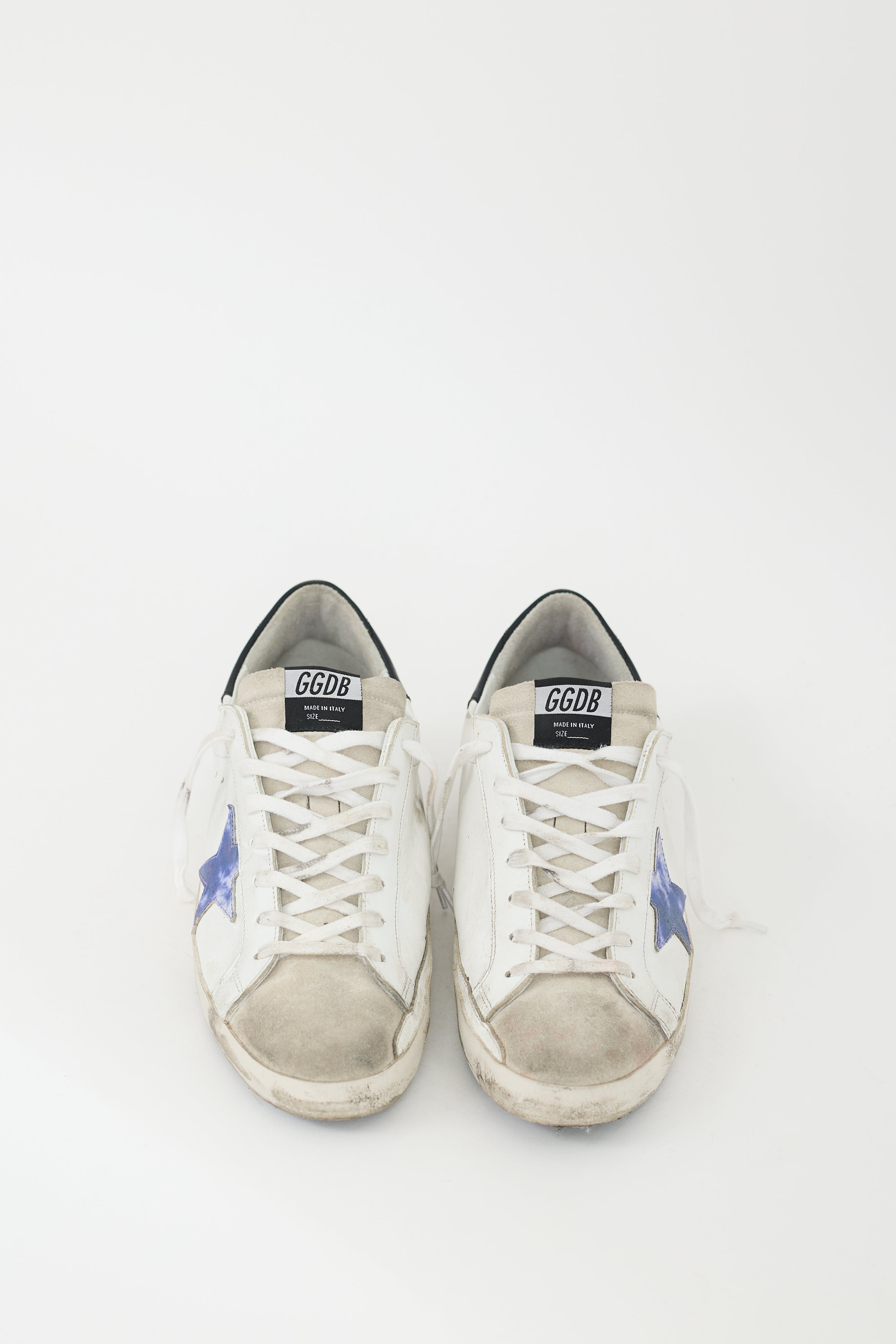 Pre-owned Golden Goose white leather Superstar low top sneakers featuring a rounded toe with grey suede panelling, lace up vamp, logo label at tongue, signature star motif and gold foil lettering at outer sides of shoe, black counter panel with white printed logo, white rubber sole, and intentional distressing throughout.