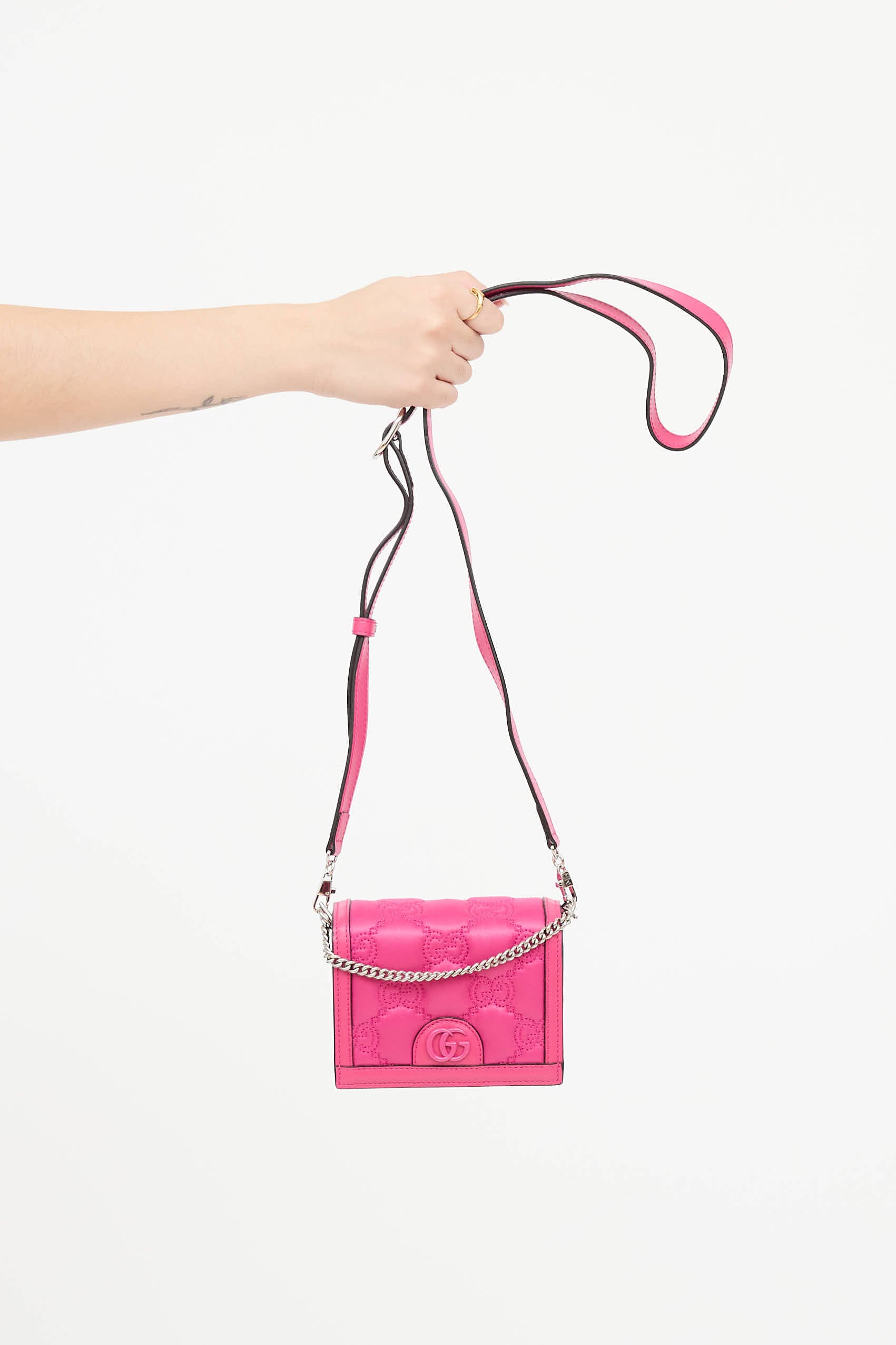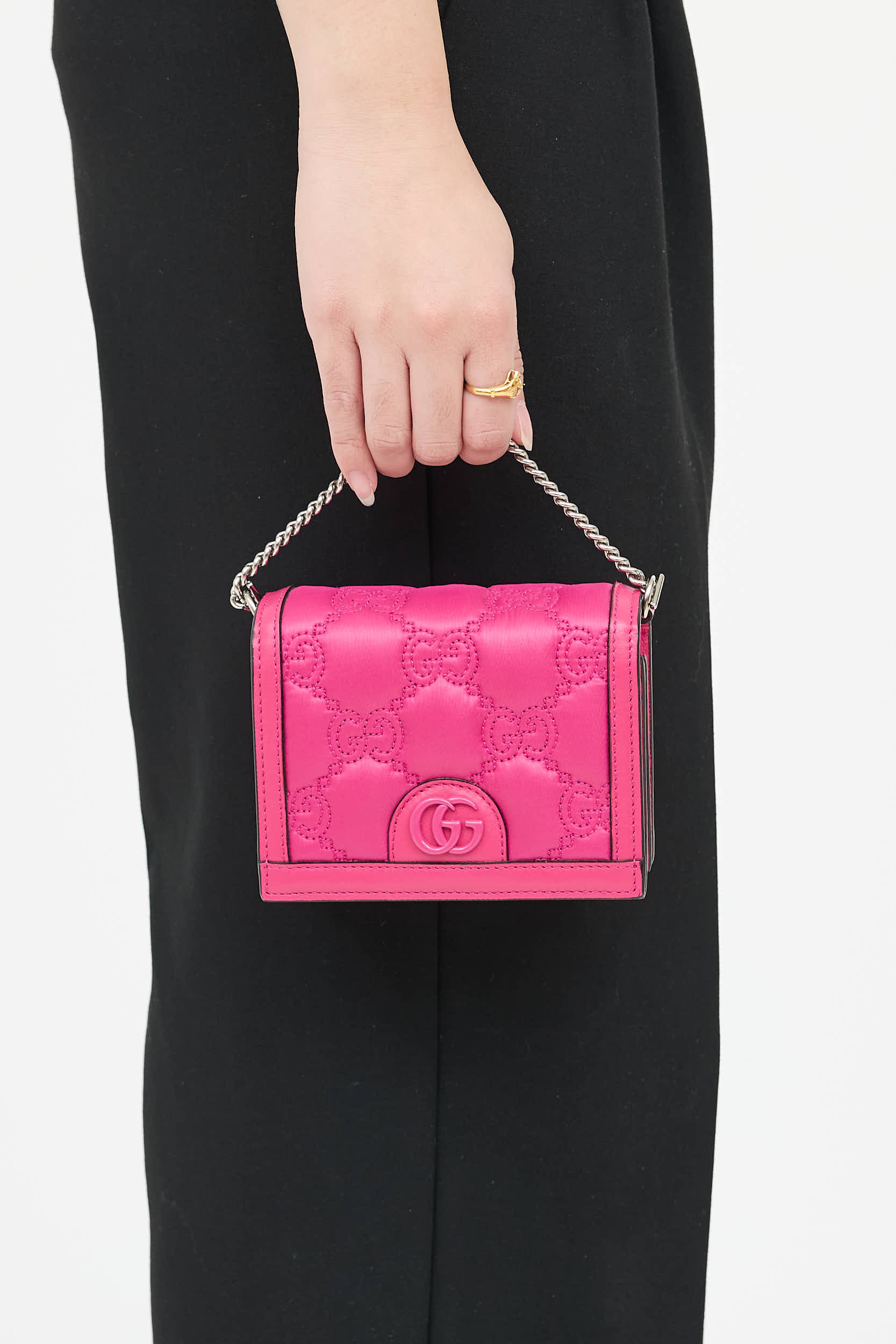Pre-owned Gucci pink mini crossbody bag featuring quilted GG upper, adjustable crossbody strap, silver tone hardware, chain top handle bag, magnetic top flap with GG logo, and two main compartments with two slip pockets.